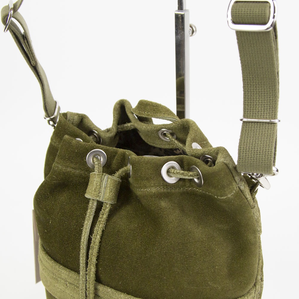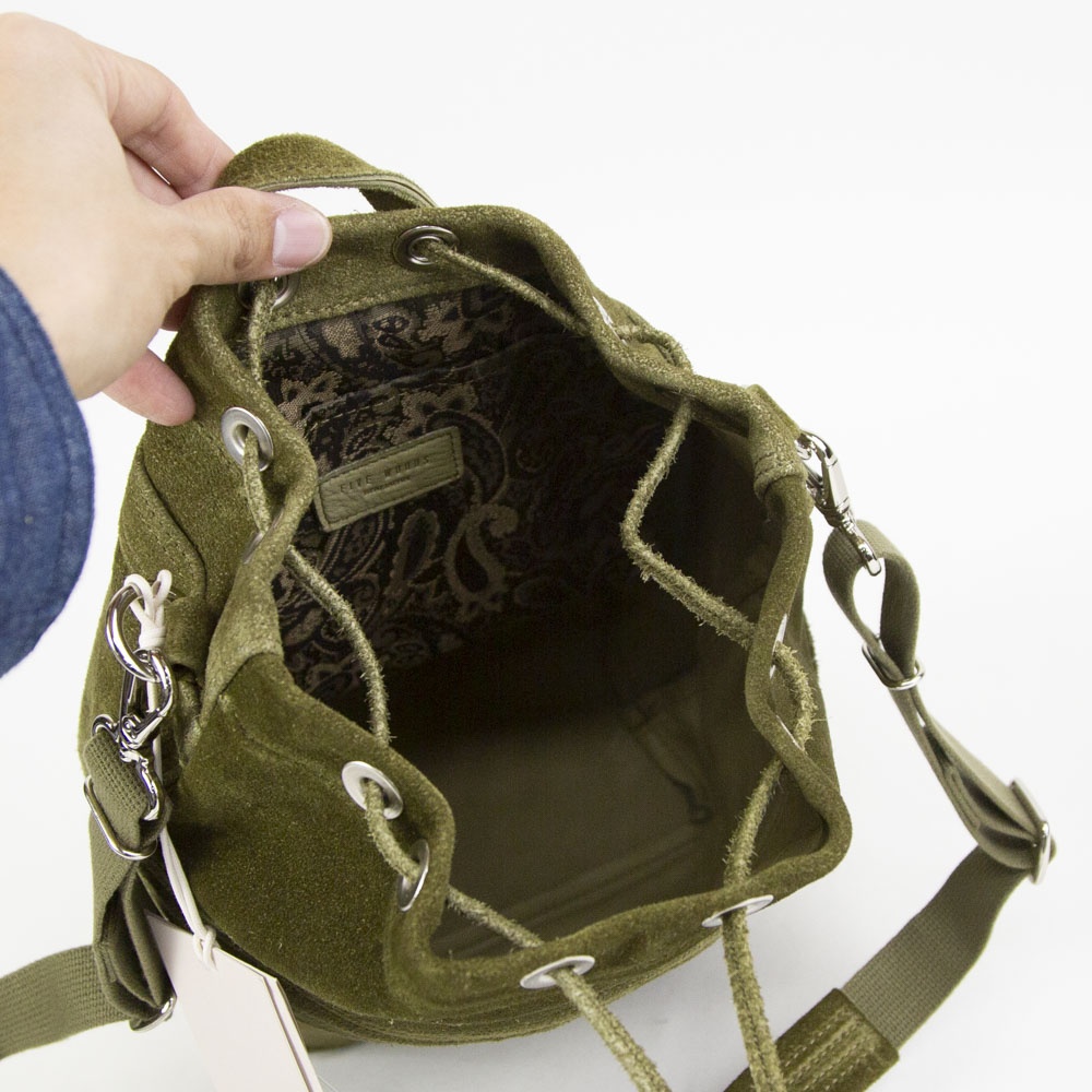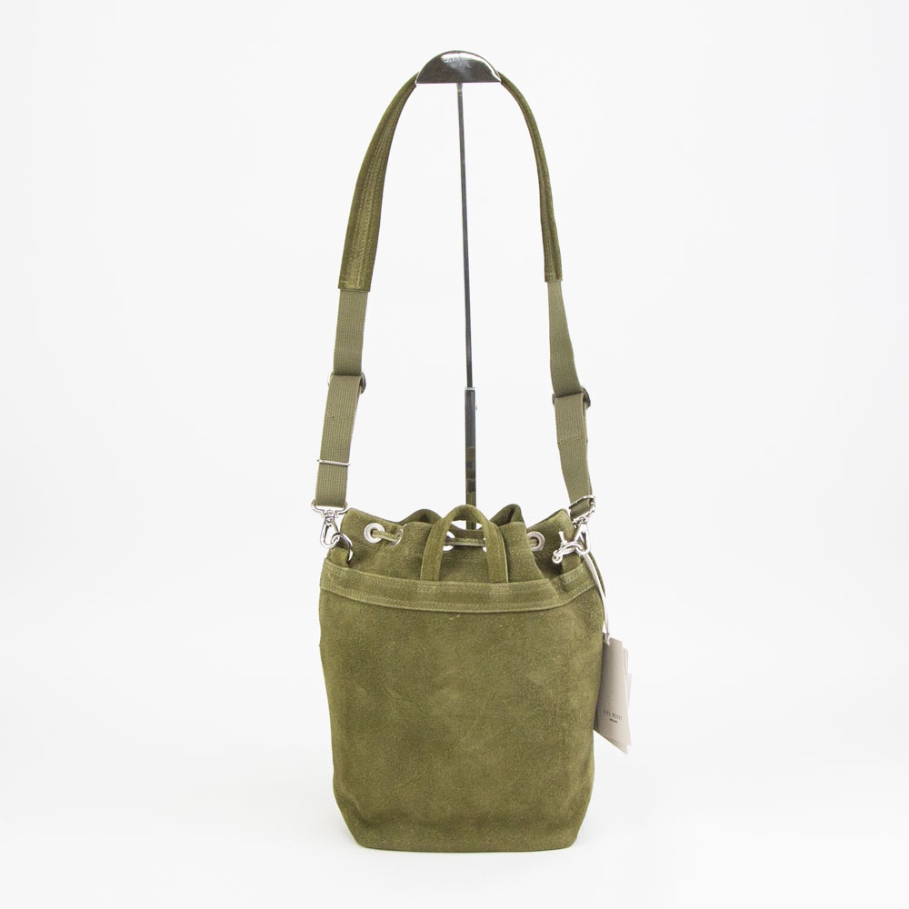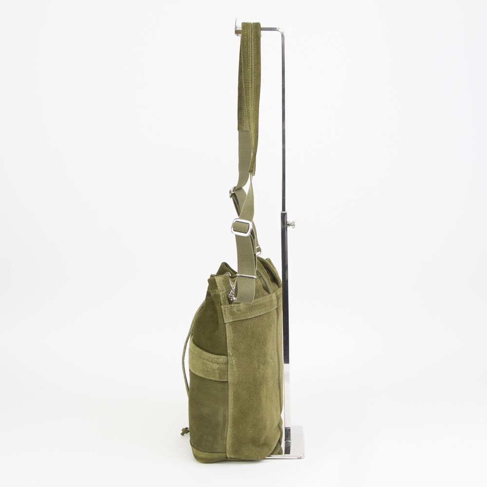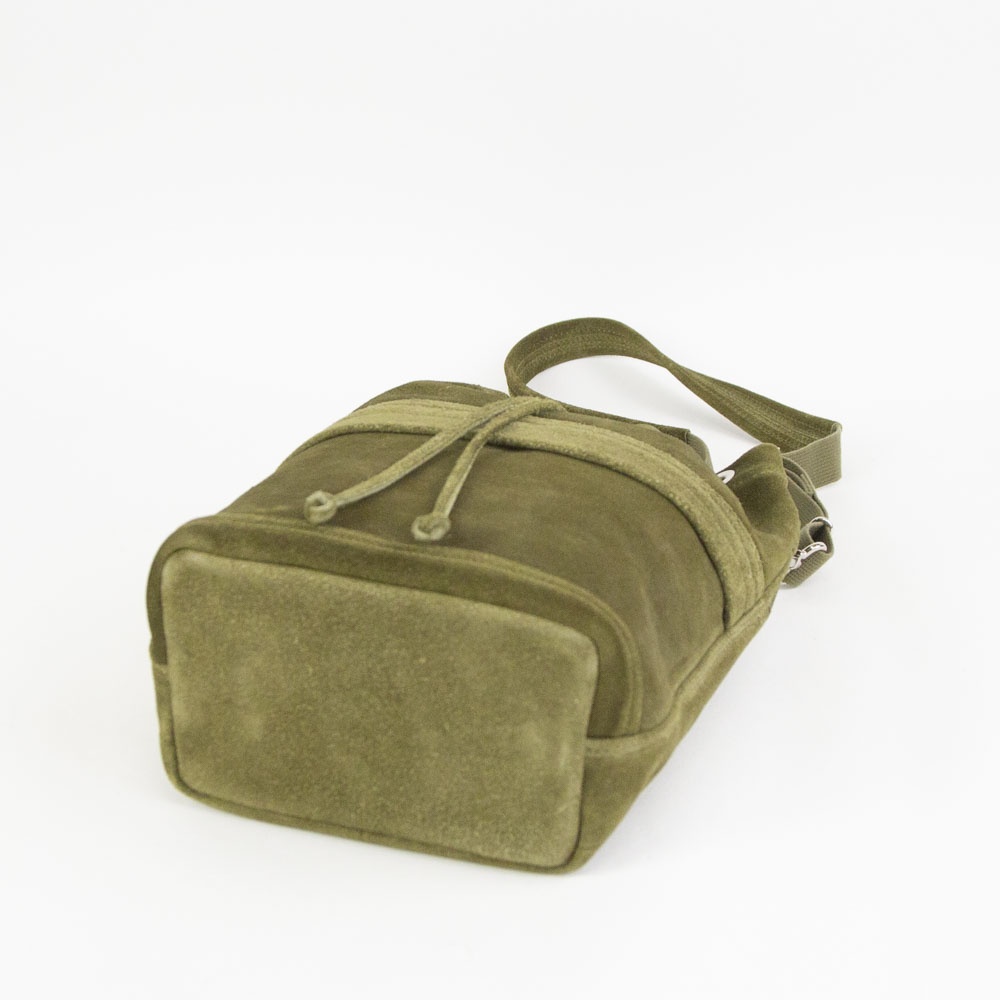 あたたかみのあるスエードの表情を活かした、上質でリラックス感のある巾着バッグ。日常の小さな必需品はもちろん、ペットボトルやコスメポーチなど嵩張るものも余裕をもって収納できます。同素材のポーチを組み合わせればより機能的に仕分けすることも可能です。フロントに設けたファスナーポケットは、スマートフォンなどよく使うものの収納に便利。内装にはペイズリー柄のオリジナルジャカード生地でつくったポケットを装備。取り外しのできるショルダーストラップが附属します。