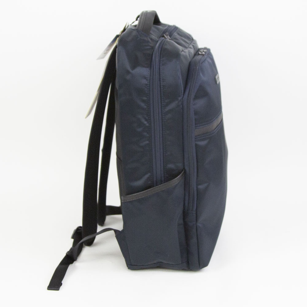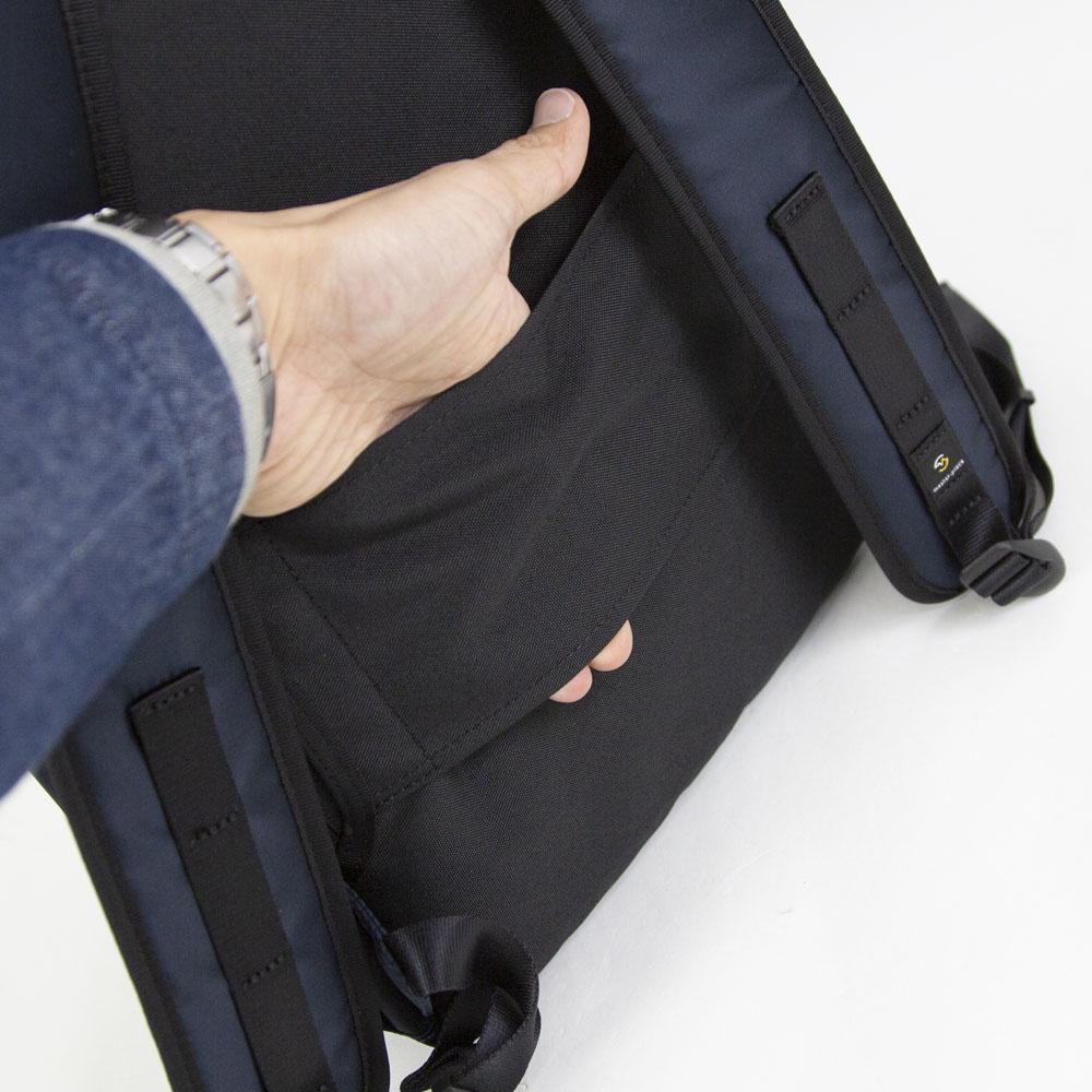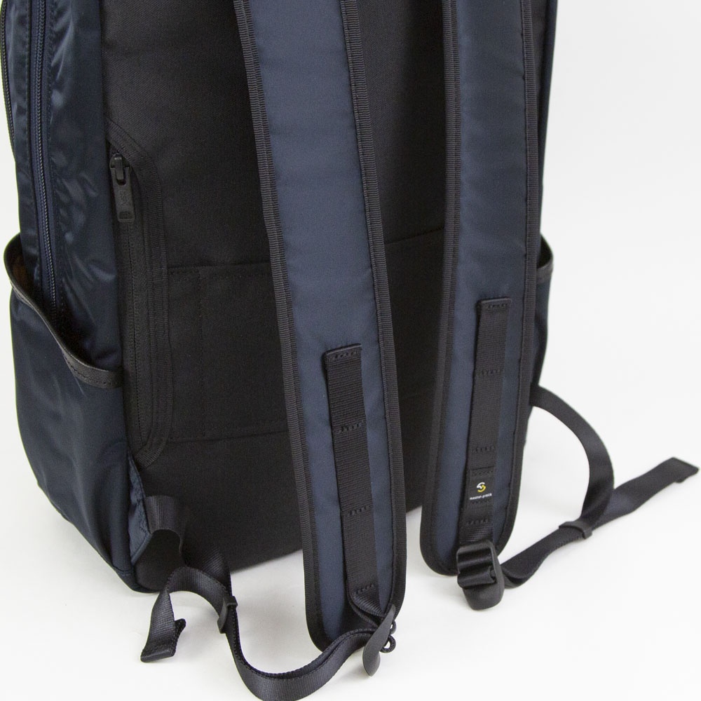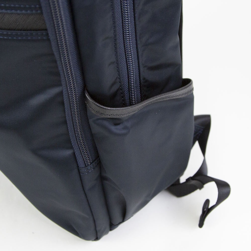また生地の裏面には、東レコーテックス(株)のBreathatec® を加工しております。独自ポリマー技術を用いたポリウレタン湿式微多孔コーティング素材で高い耐水性を兼ね備えた加工です。なおコーティング材のポリウレタンの種類は、耐久性の優れたポリカーボネートを使用してます。m-coat™の撥水機能により水を弾き、Breathatec® の耐水機能により水の侵入を防ぎ、ゲリラ豪雨や大雨に対応した素材です。付属レザーは厳選した国産の良質ステアレザーを使用し、染色時に「3M」社製の防水剤をタイコに入れて、革の繊維の中まで浸透させています。