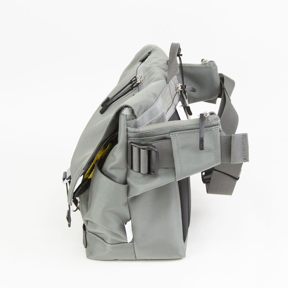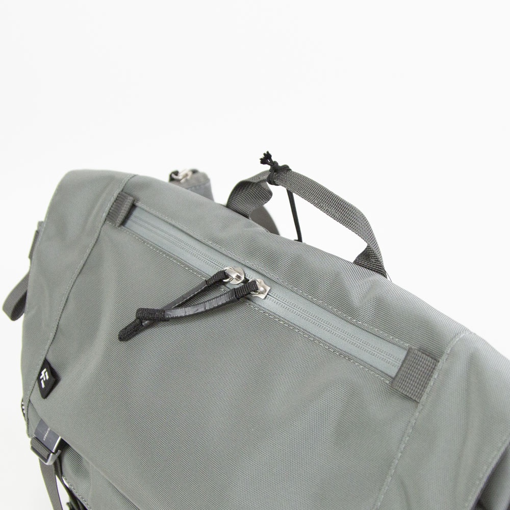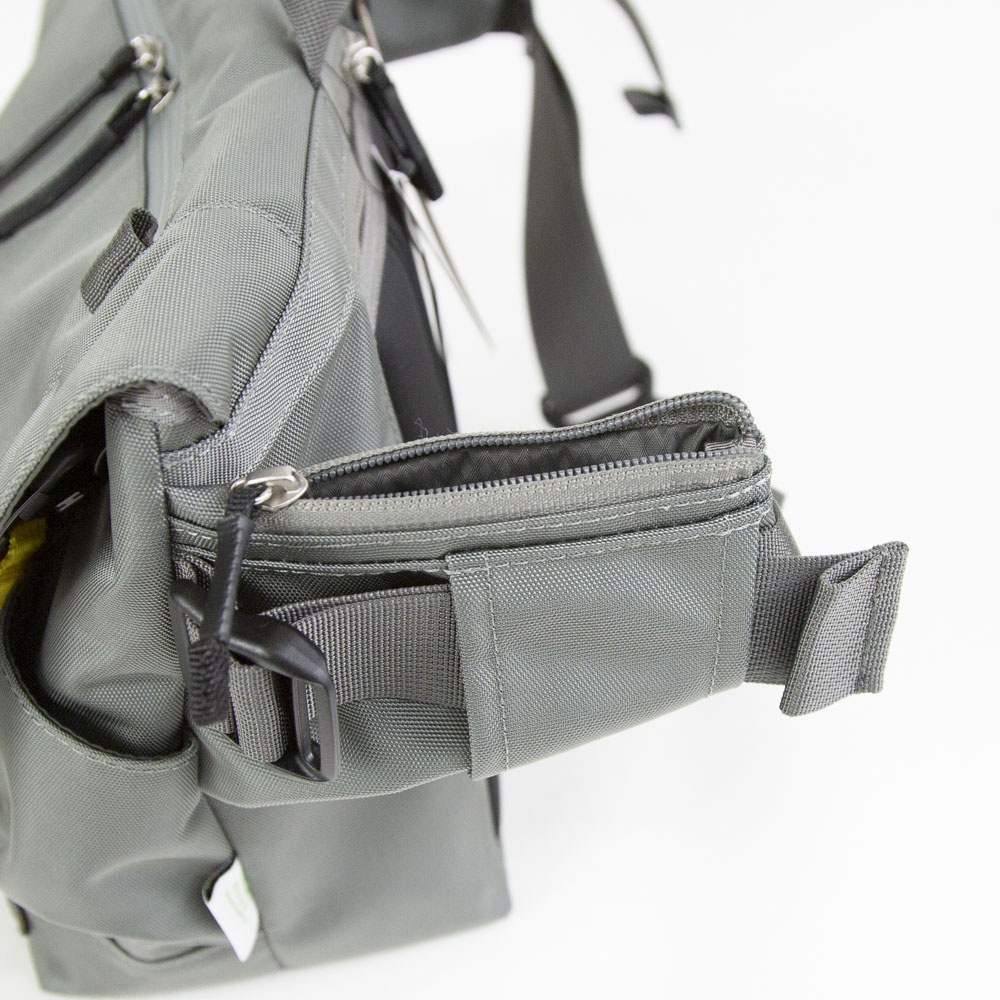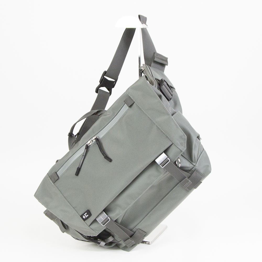 本体生地にはコーデュラナイロンを高密度で織りあげる事により通常の同種の平織ナイロン生地と比べ、引っ張りや引き裂きが強く生地のボリューム感があります。撚糸した糸で織ることで生地感もきれいで綾織のように見え高級感があるのも特徴です。裏加工には別注で高耐水圧PUコーティングを施しております。ファスナーにつきましては、中国YKKの撥水ファスナーを採用しており通常よりも持続性の高い撥水性になります。収納に併せマチ幅を調整できるボトルポケットや取り外し式のイエローテープをアクセントにしたキーホルダーも付いております。CIEバッグで初めて海外生産によるシリーズになり、国内生産では手配しにくいパーツや縫製仕様を織り混み、全体的にクラシックな雰囲気を表現しつつも機能性・実用性に特化したシリーズになります。