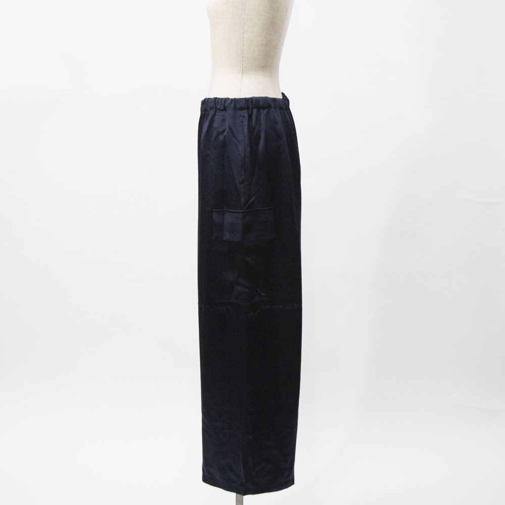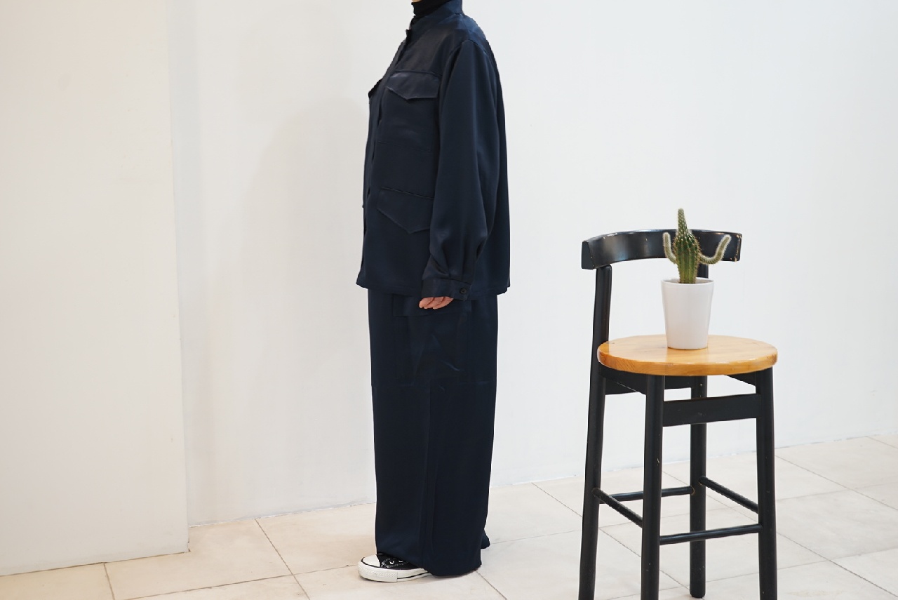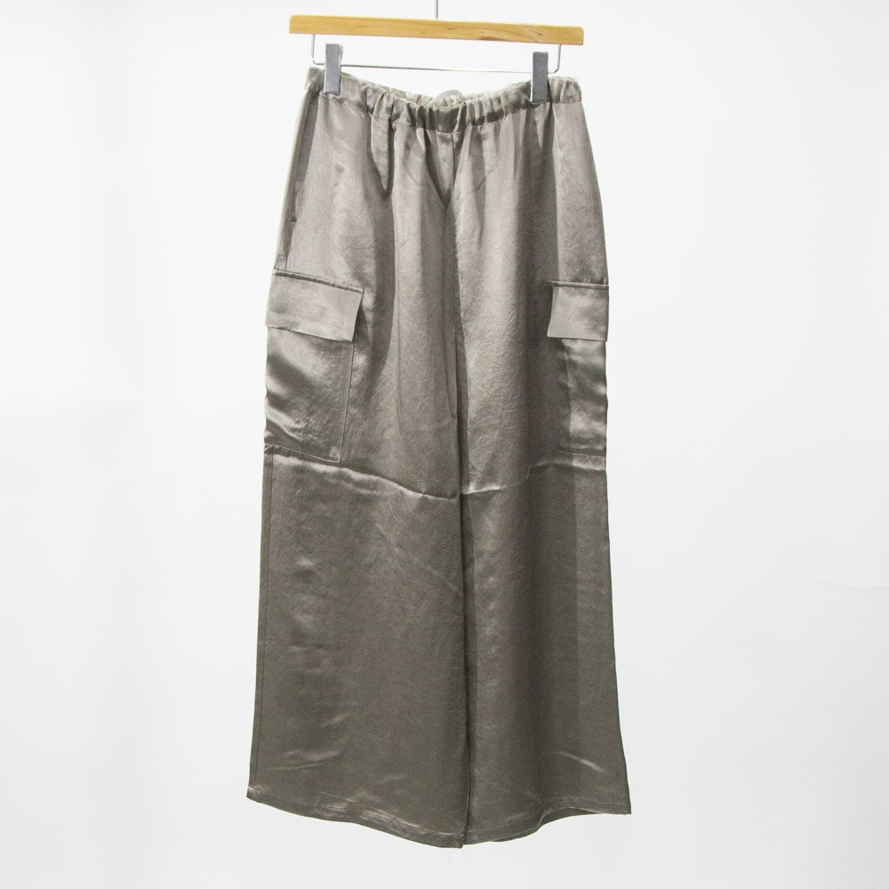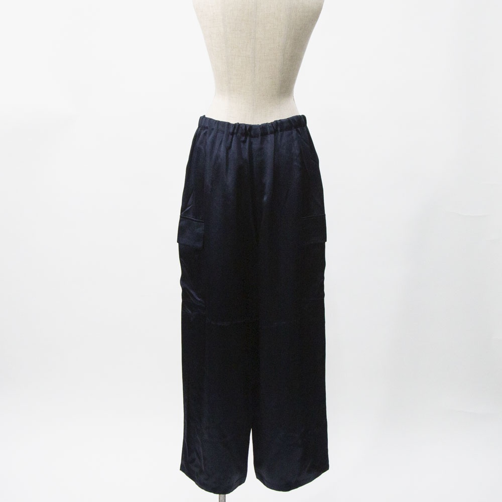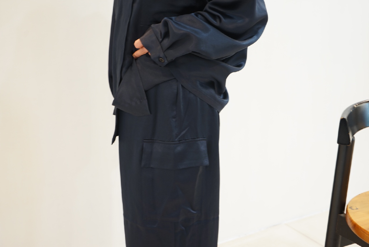 人気のカーゴパンツがサテン生地で登場。カジュアルなデザインな中にを大人の雰囲気のある1枚。光沢がありサラッとした素材感のサテン生地はボリューム感はなくスッキリとしたシルエット。ポケットの膨らみも抑えたデザインもポイントです。ウエストはゴム使用に+調整紐付きなのでウエストキープもしやすくなっています。