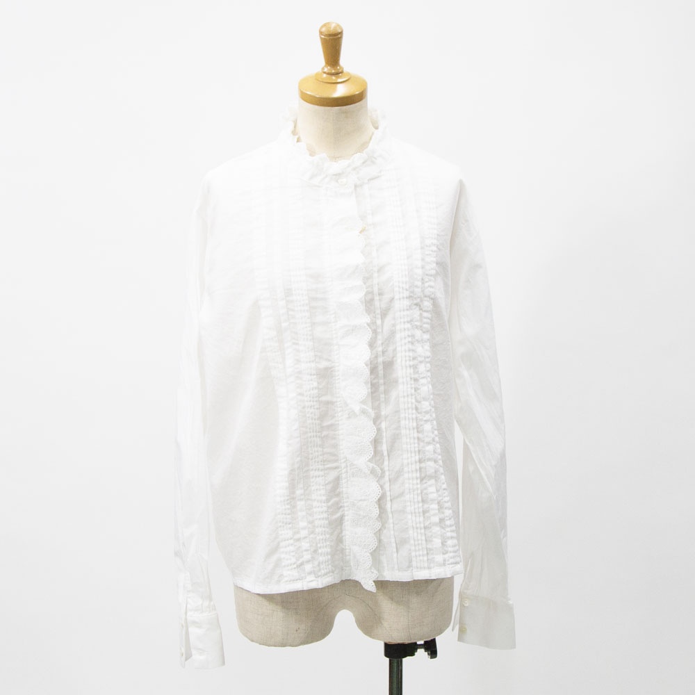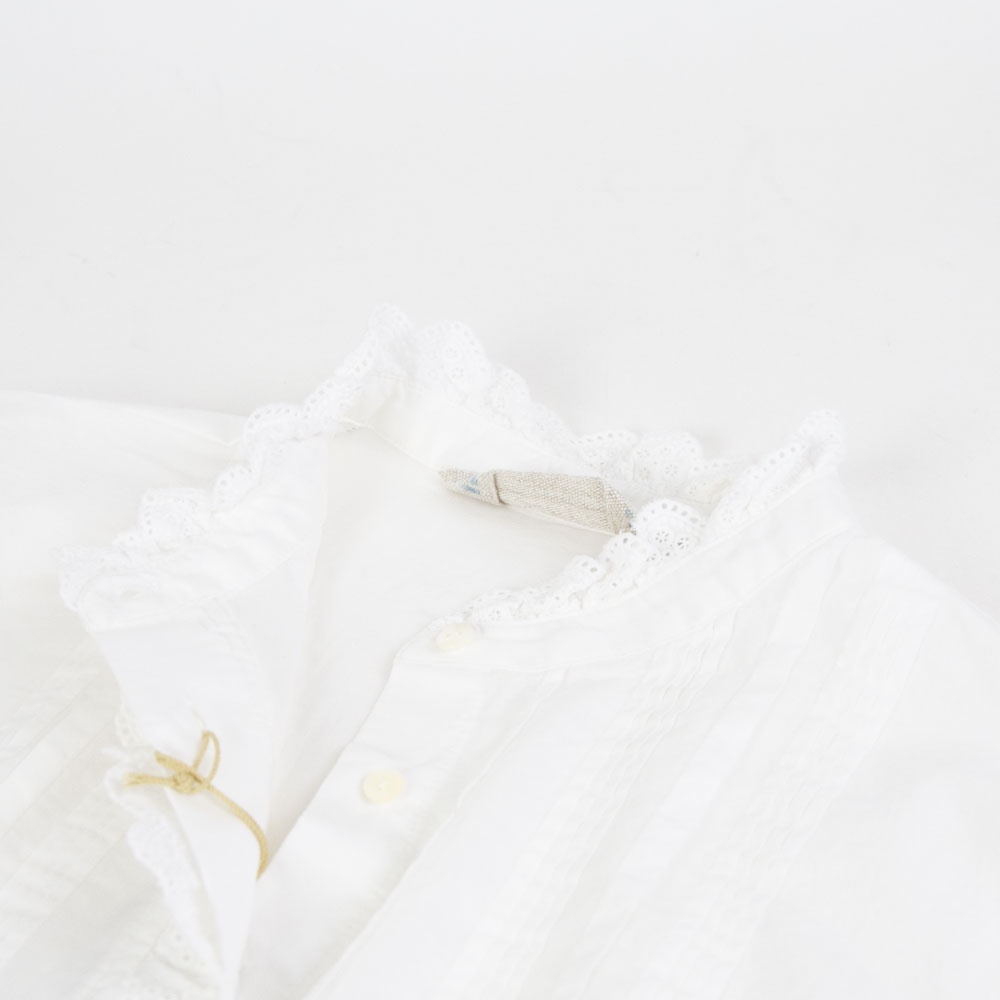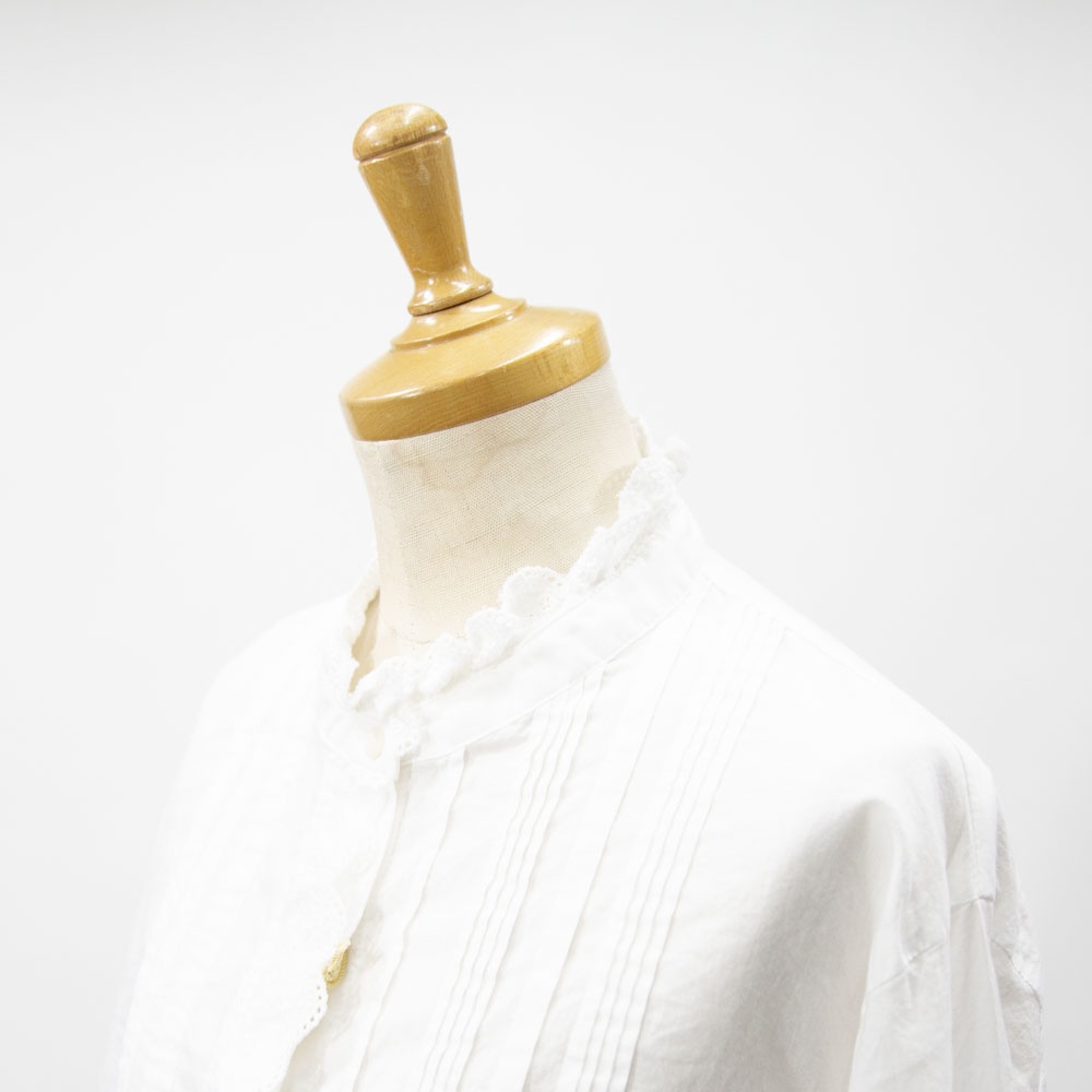 ローン×ヴィンテージライクエンブロイダリーレースのピンタックレースシャツです。襟と前立てにレースをあしらった上品な1枚。首元のハイネックレースを魅せるレーヤードスタイルがオススメ。春先は1枚でも素敵に着こなせるアイテムです!