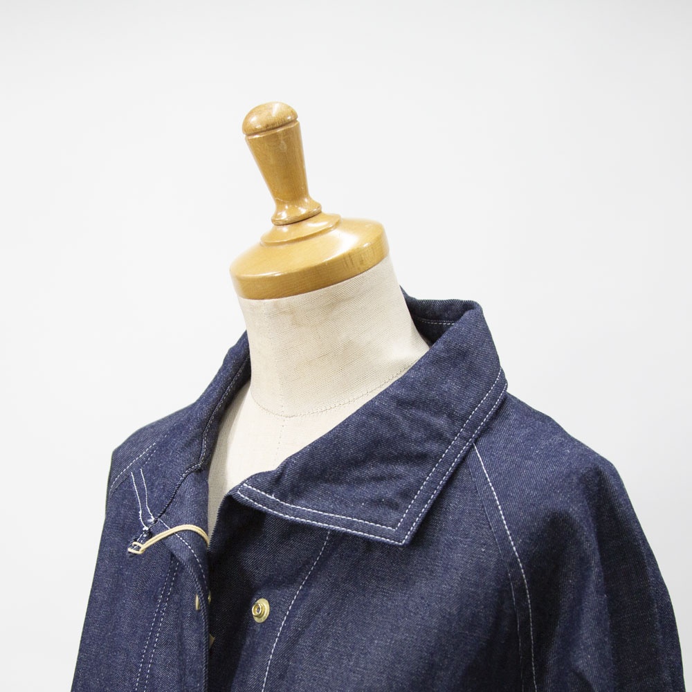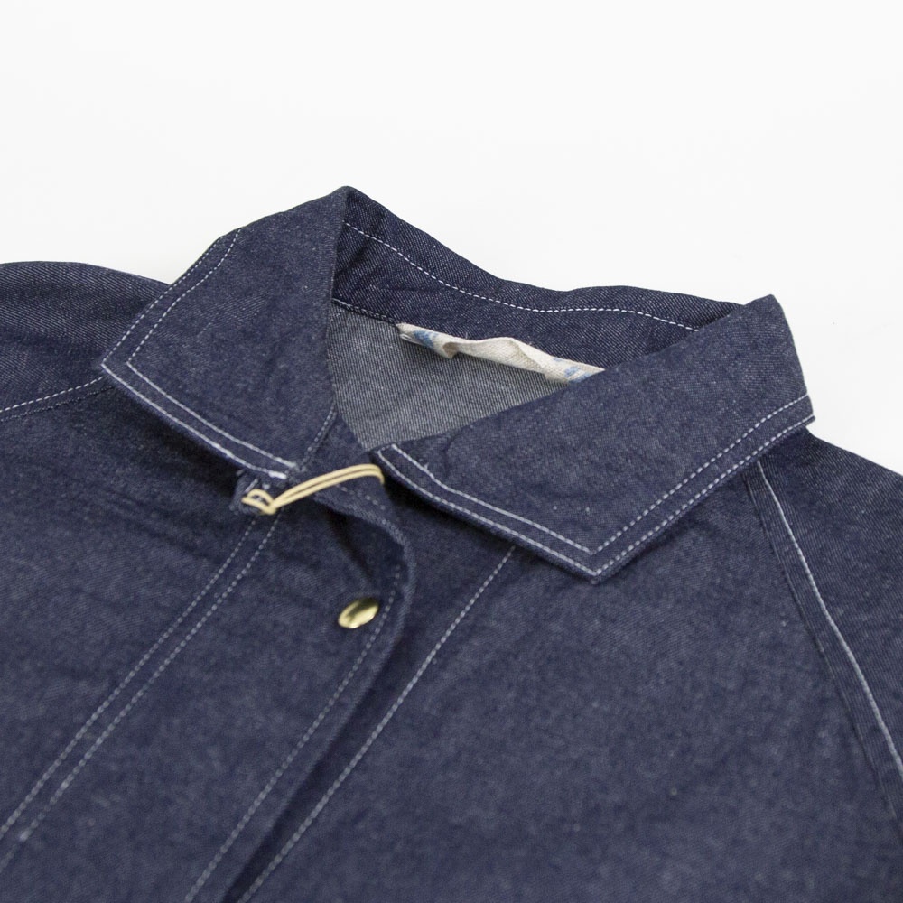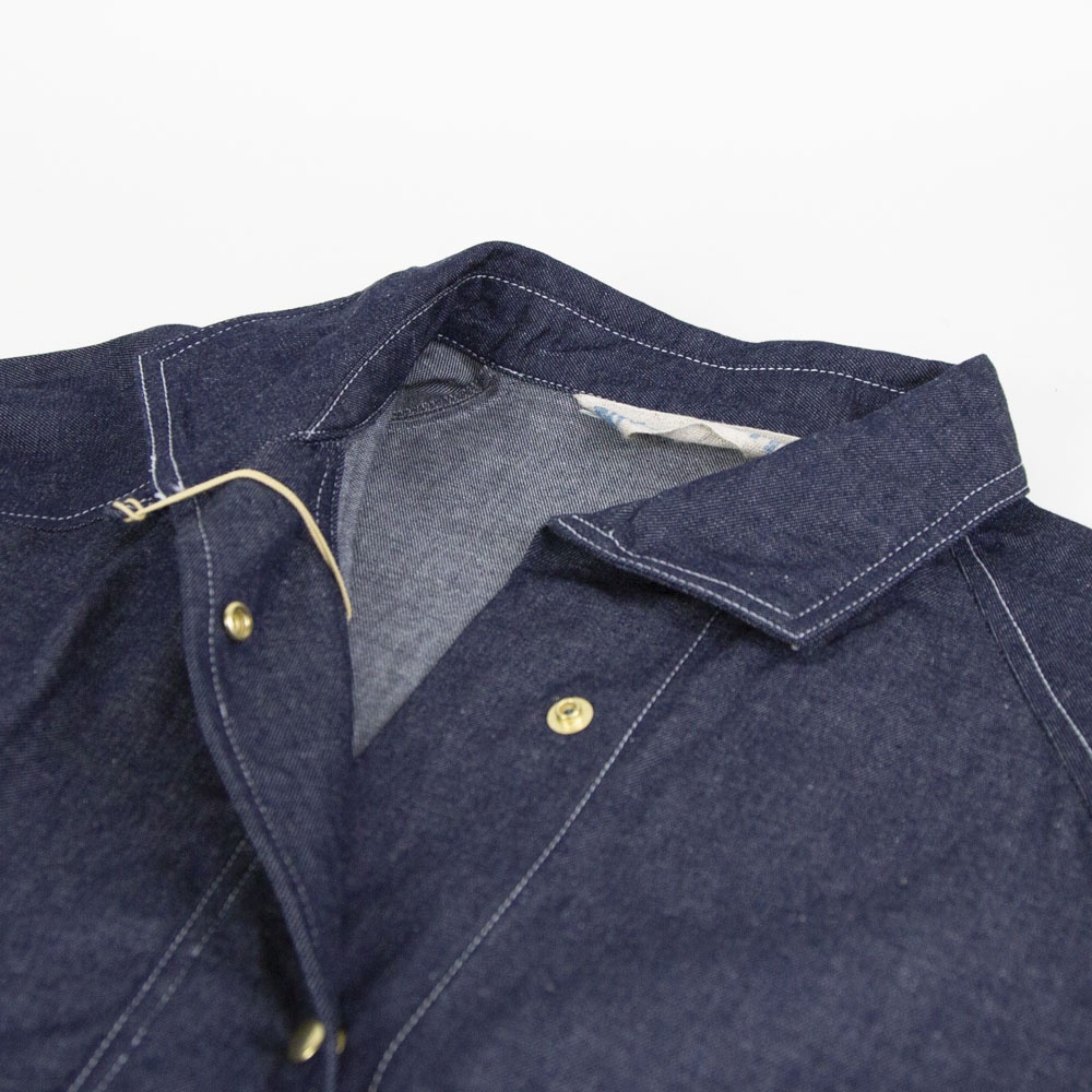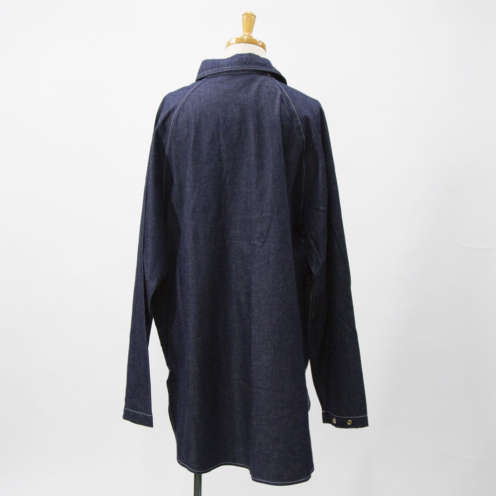 8ozライトオンスデニム素材のデニムカバーオールです。厚すぎず扱いやすいデニム生地。めずらしいプルオーバー型のカバーオールで襟元を開けるとラフに着こなせます。身頃は前後差のある丸みのある裾ラインで腰位置から切り替えたデザインが特徴的です。ヒップの隠れる長めの丈と隠れフロントポケットがオススメポイントです♪