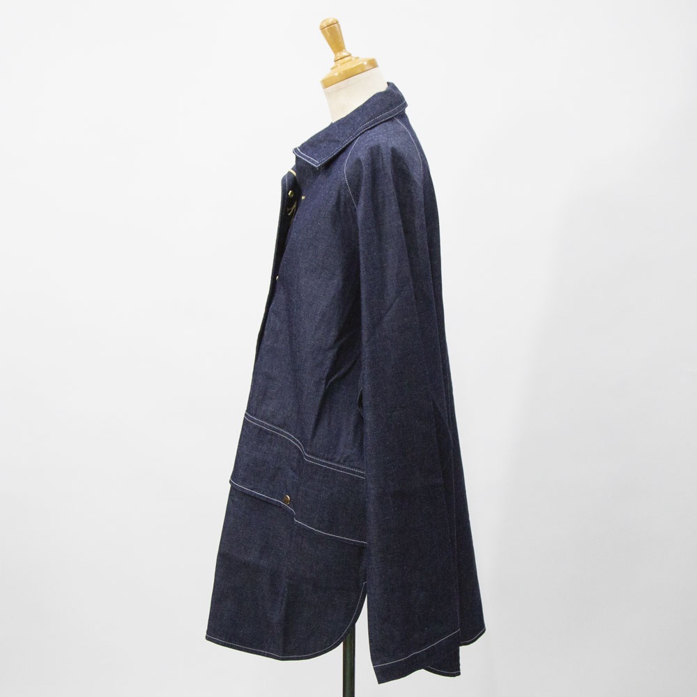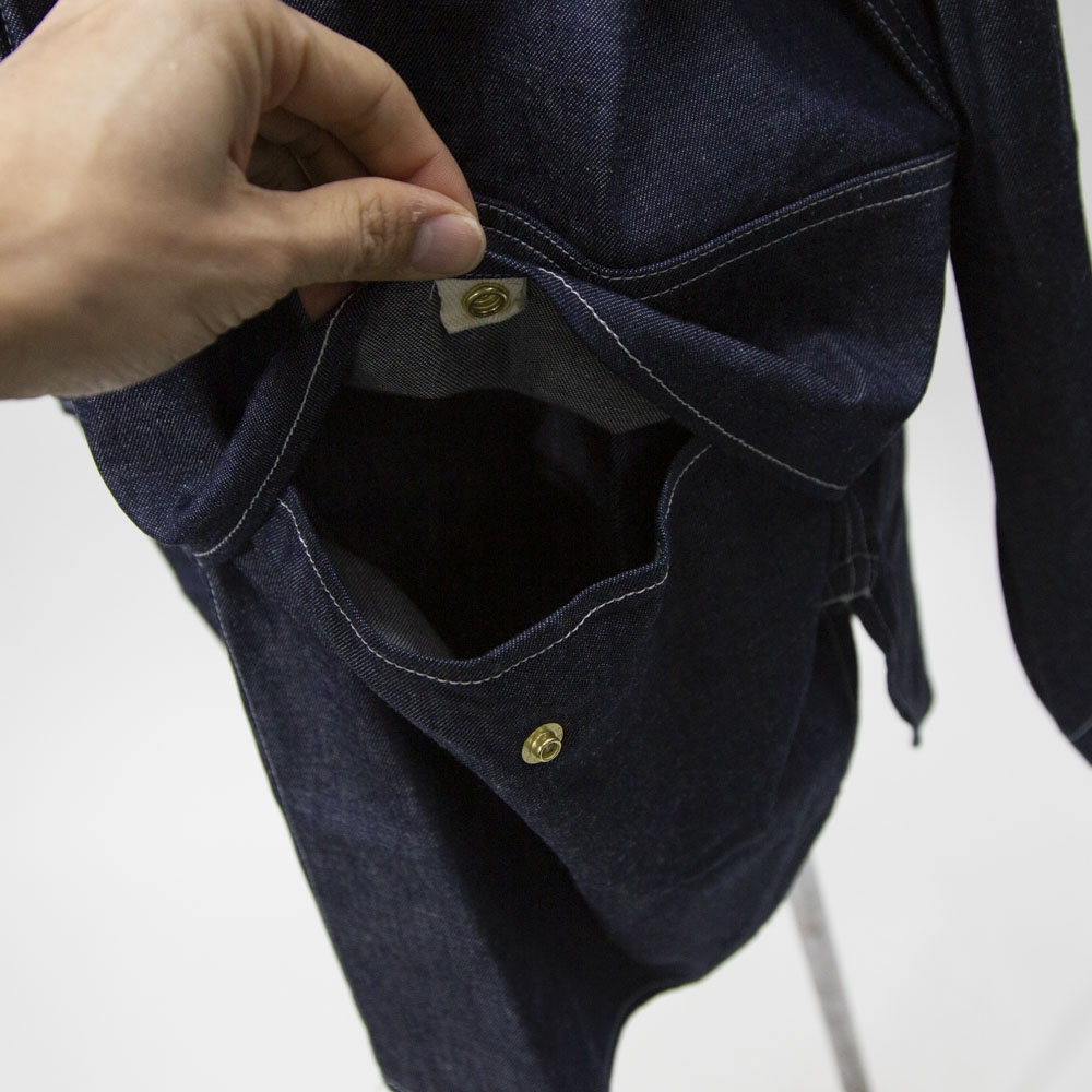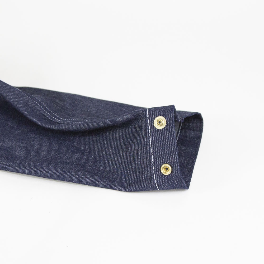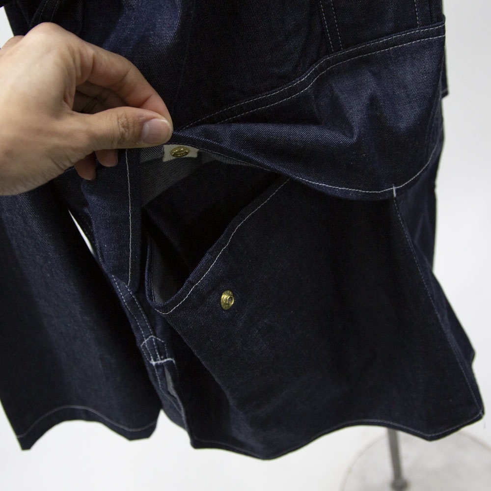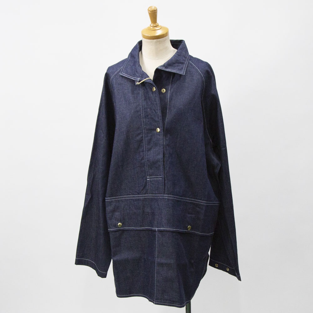 8ozライトオンスデニム素材のデニムカバーオールです。厚すぎず扱いやすいデニム生地。めずらしいプルオーバー型のカバーオールで襟元を開けるとラフに着こなせます。身頃は前後差のある丸みのある裾ラインで腰位置から切り替えたデザインが特徴的です。ヒップの隠れる長めの丈と隠れフロントポケットがオススメポイントです♪