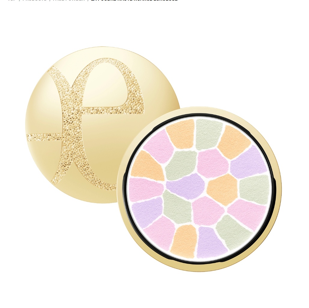 ラ プードルの上にパフをあて、パフを45度ほど回転させ、5色のペールカラーがほどよくブレンドされるようにお粉をとります。肌にのせるときは、あご先から顔全体に軽くおさえるようにつけてゆきます。