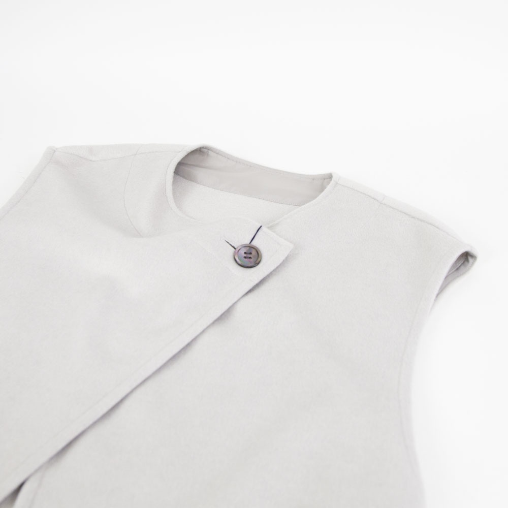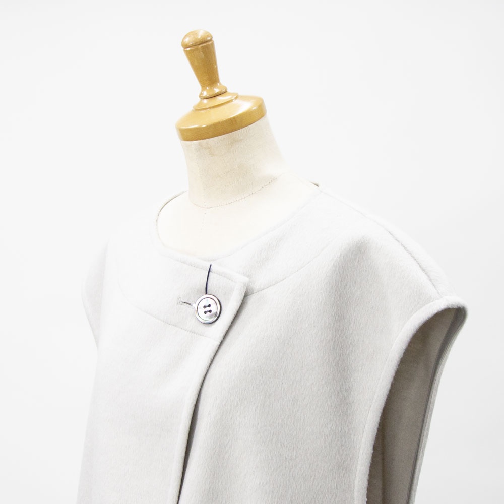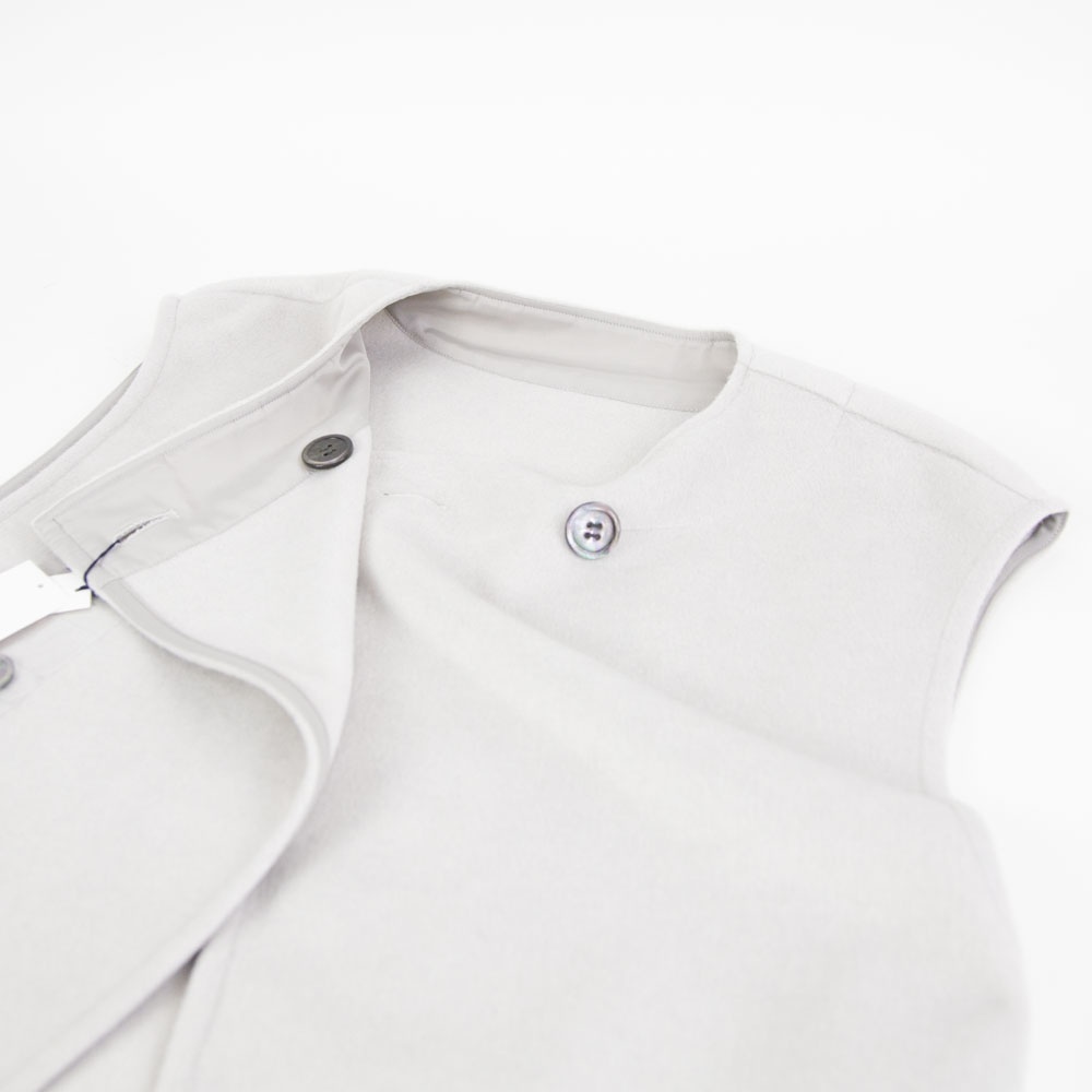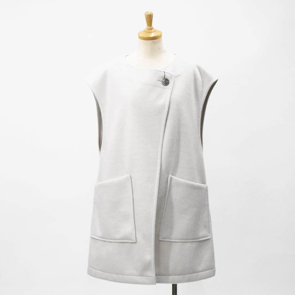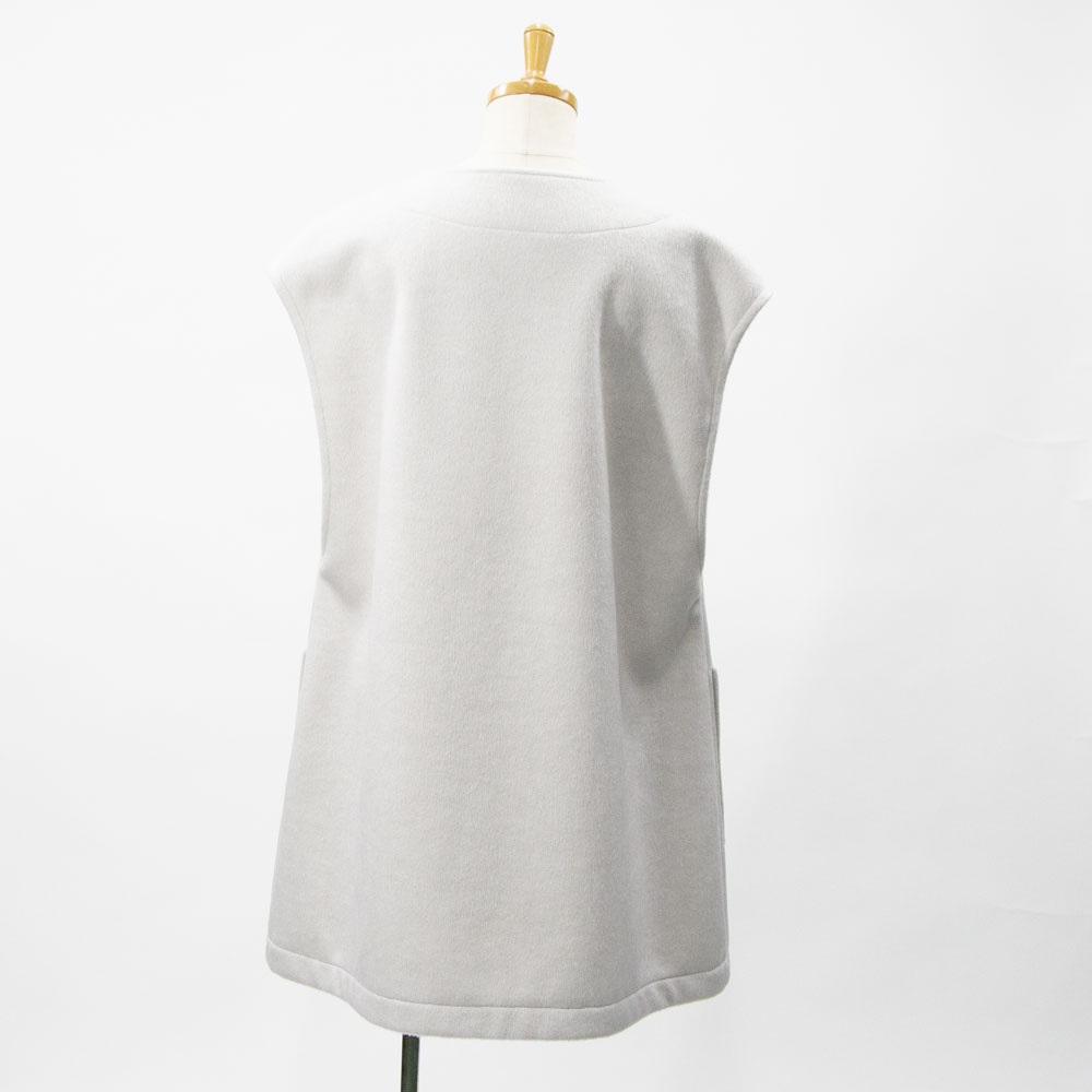 しっとりとなめらかな肌ざわりのジレです。 あたたかく軽い着心地で、やわらかく光沢のある素材がとても上品です。 前身頃左右にポケットがあります。