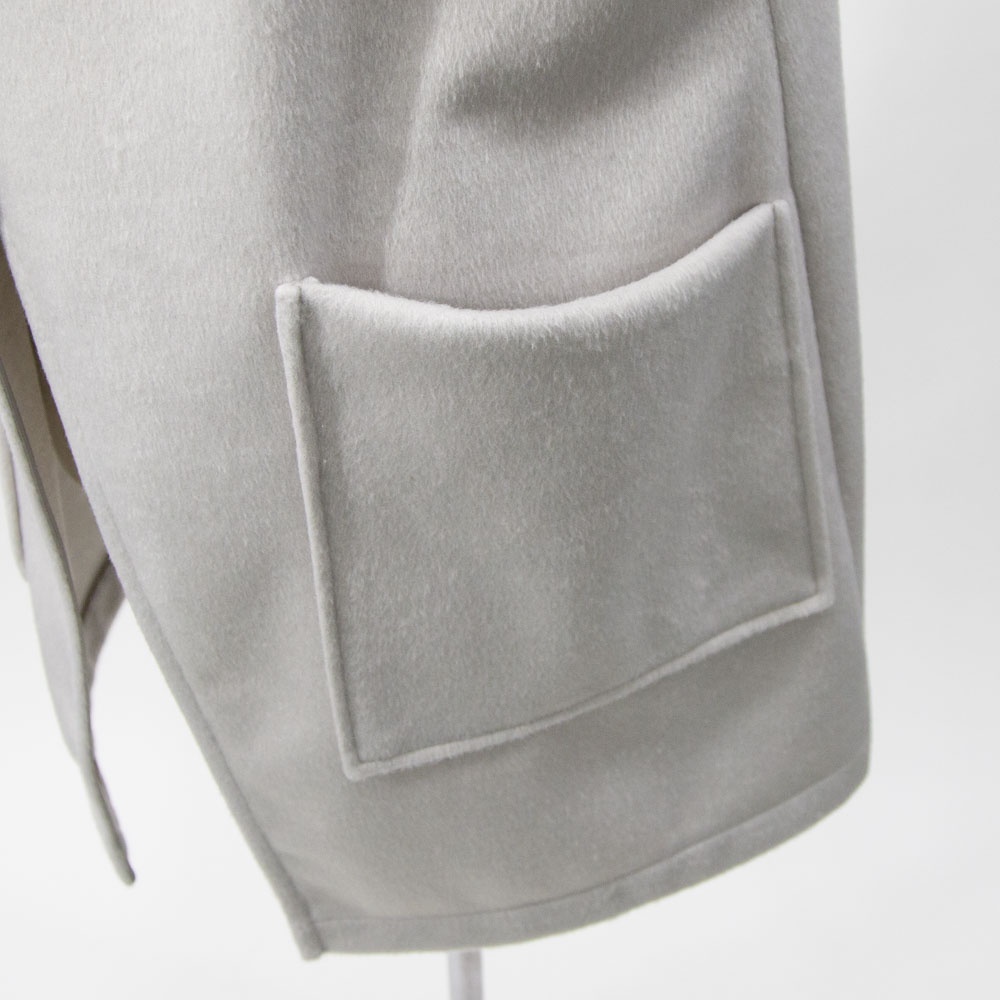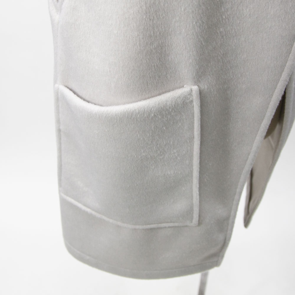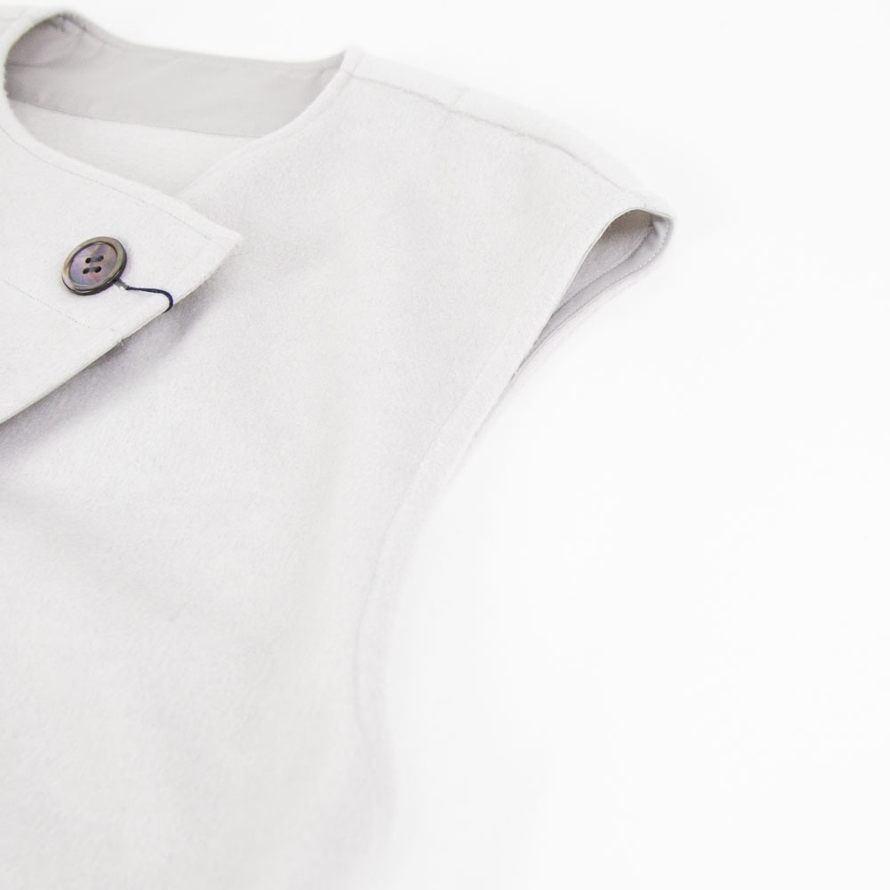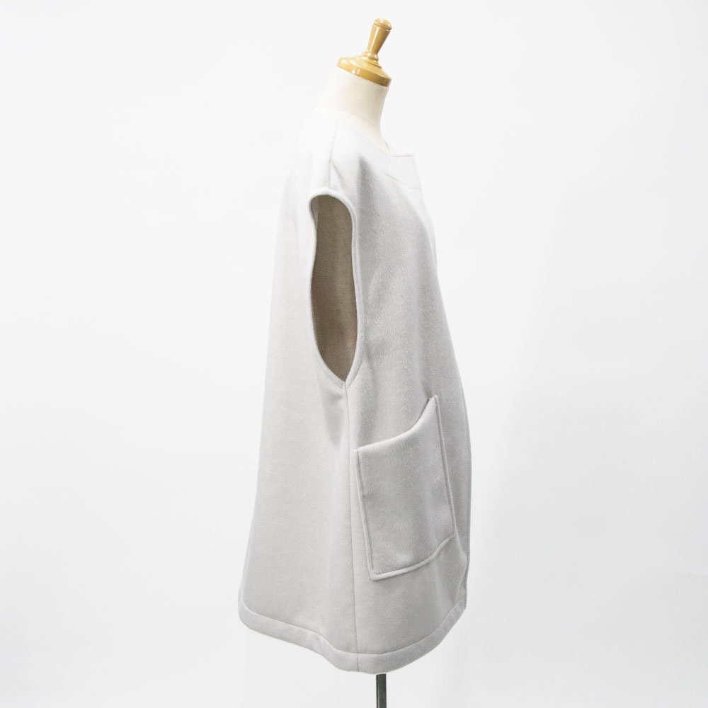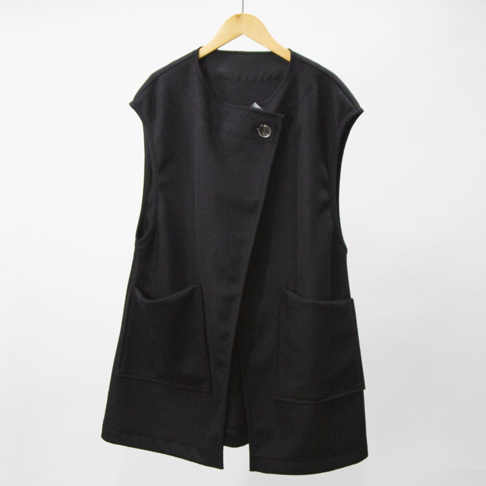しっとりとなめらかな肌ざわりのジレです。 あたたかく軽い着心地で、やわらかく光沢のある素材がとても上品です。 前身頃左右にポケットがあります。