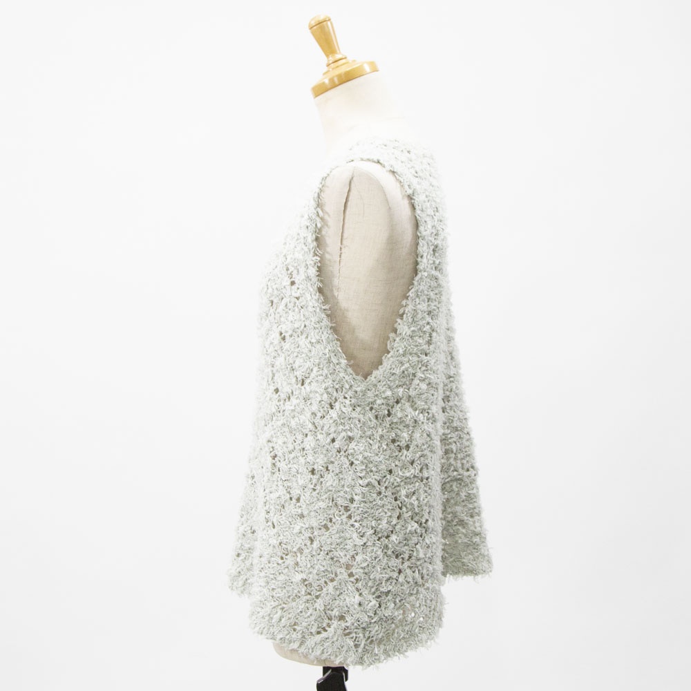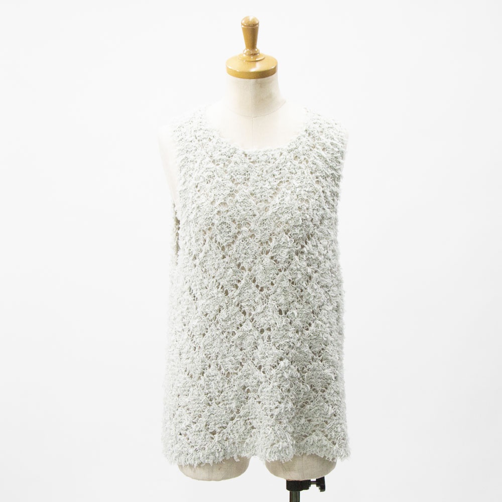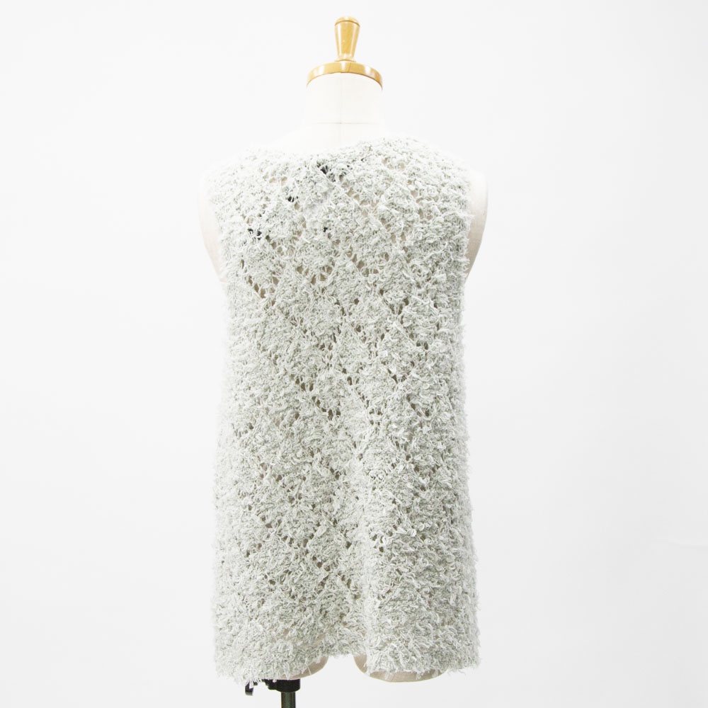 フリンジがついたテープヤーンをダイヤ柄で編んだミズイロインドらしいパターンベストです。透け感と立体感がありインナーの配色によって生地のダイヤ柄がより鮮明になります。少し長めのヒップ丈仕上げでアームが広く重ね着がしやすいのがポイントです。軽さのあるニットアイテムでお洗濯もしていただけます。