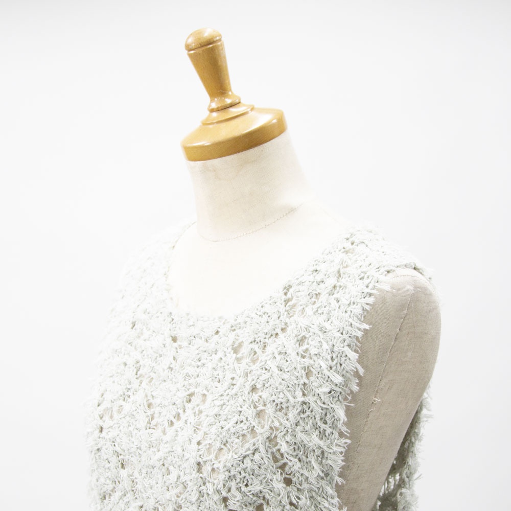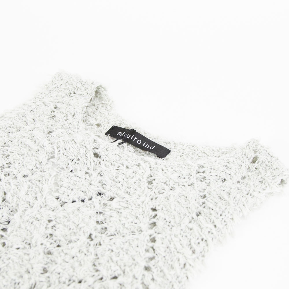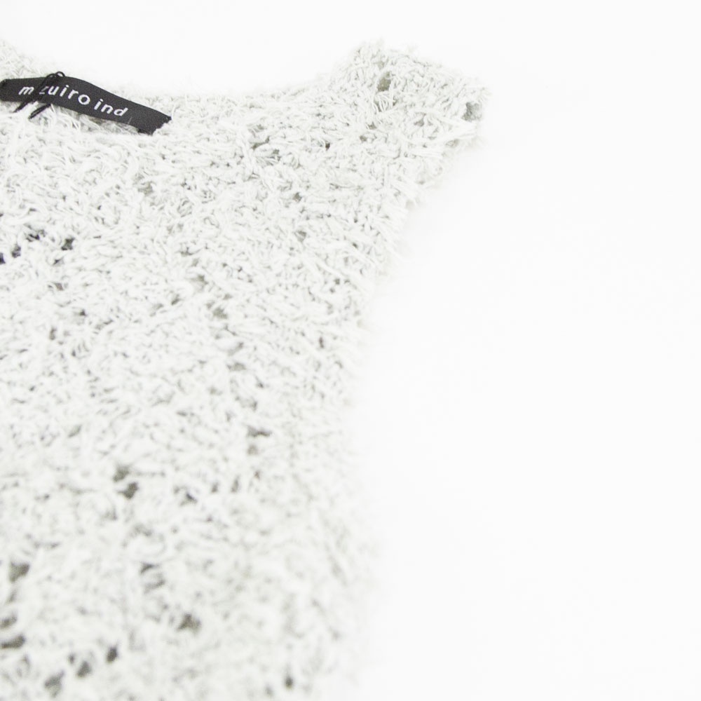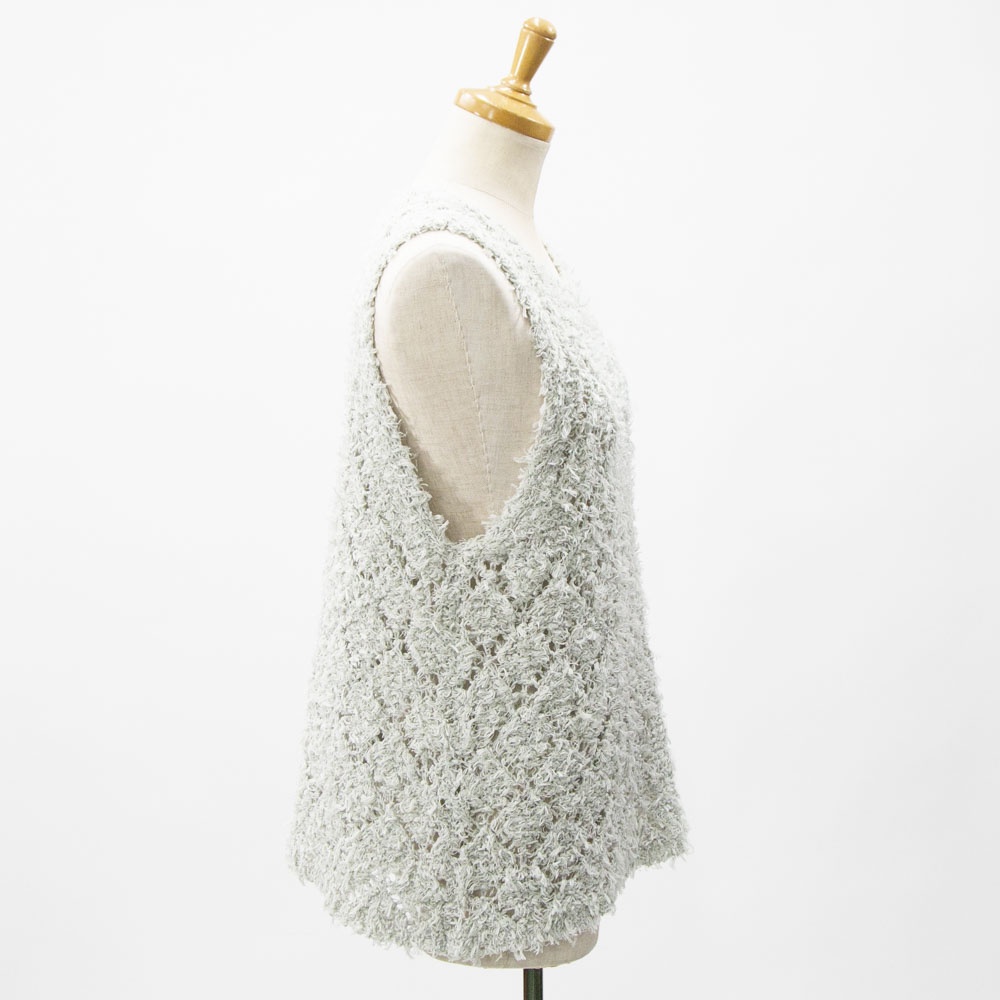フリンジがついたテープヤーンをダイヤ柄で編んだミズイロインドらしいパターンベストです。透け感と立体感がありインナーの配色によって生地のダイヤ柄がより鮮明になります。少し長めのヒップ丈仕上げでアームが広く重ね着がしやすいのがポイントです。軽さのあるニットアイテムでお洗濯もしていただけます。