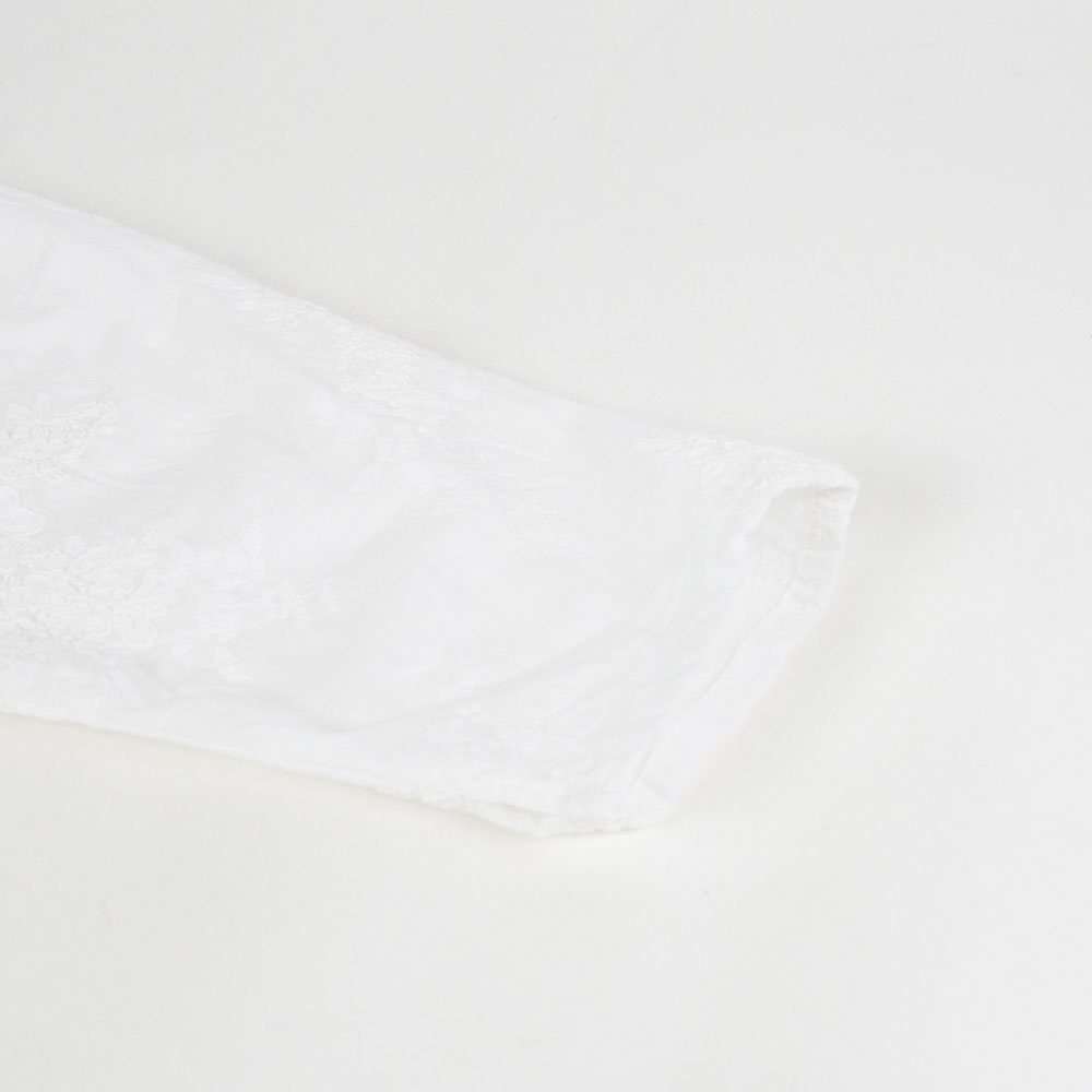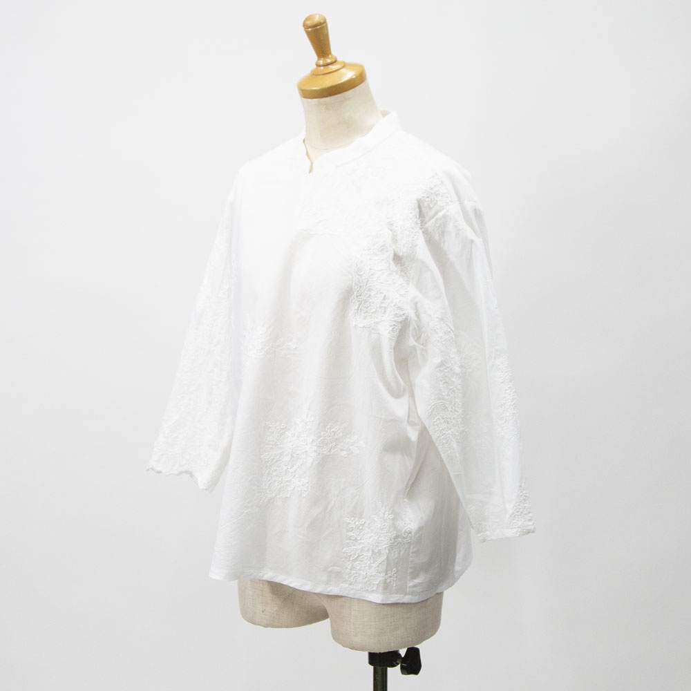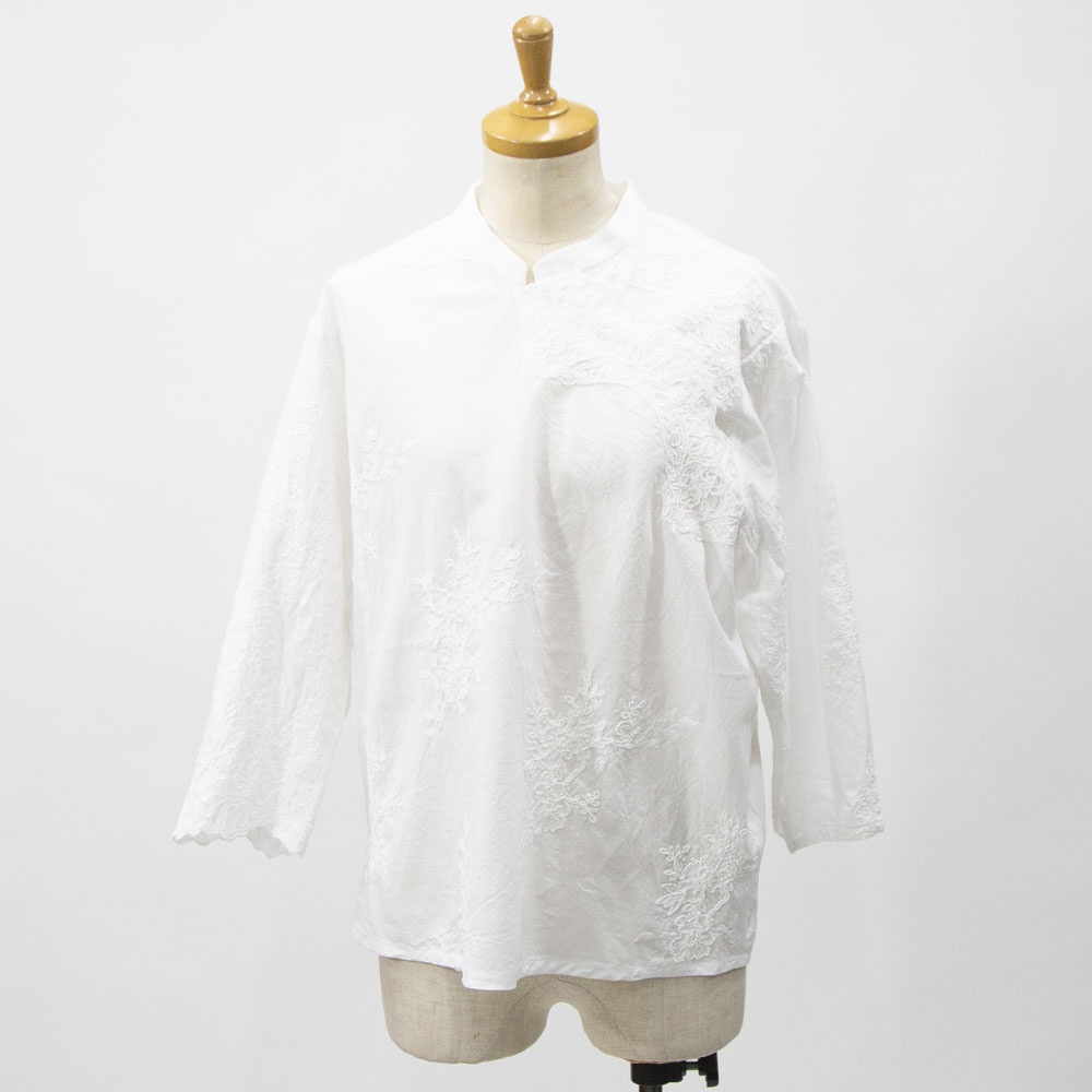アンティーク調のレース地素材のレースシノワズリシャツです。チャイナシャツ風デザインで右袖はスカラップデザインを生かした袖口が特徴。左ネックに隠れボタンが付いて留め外しのしやすいデザインがポイント。バックの身頃面のみレースの無い無地になっています。シンプルなデザインですがレースの華やかさと上品な雰囲気のある1枚です。