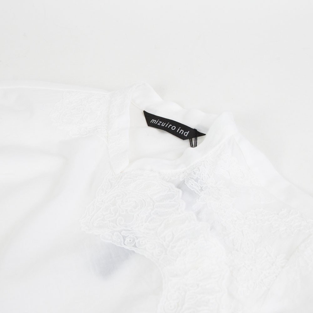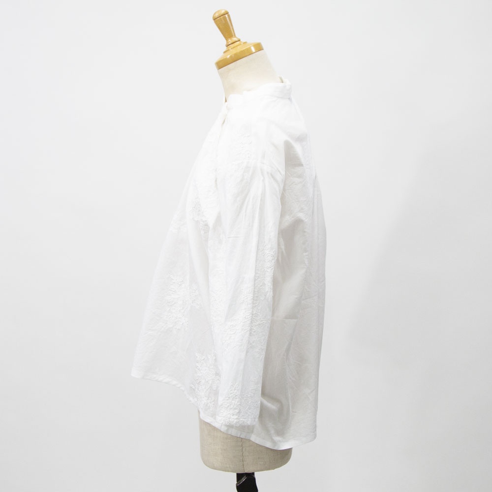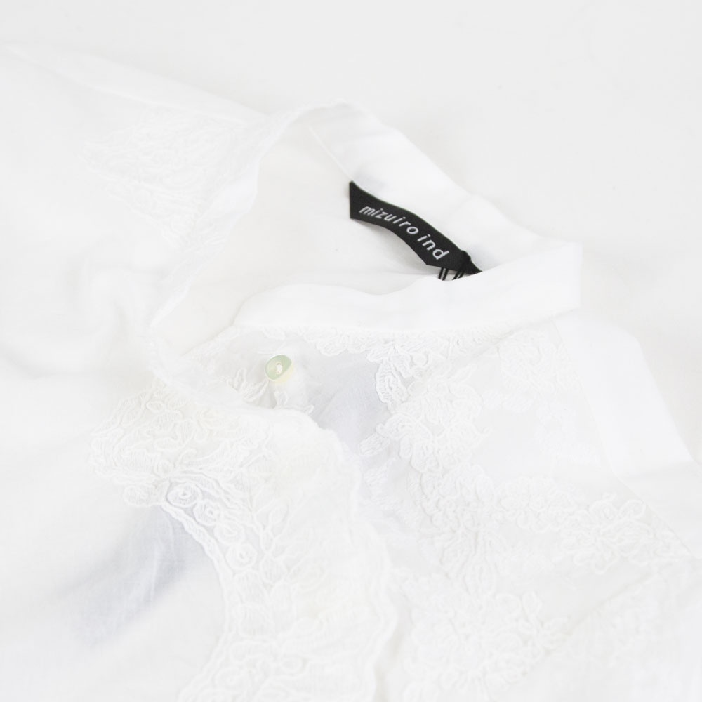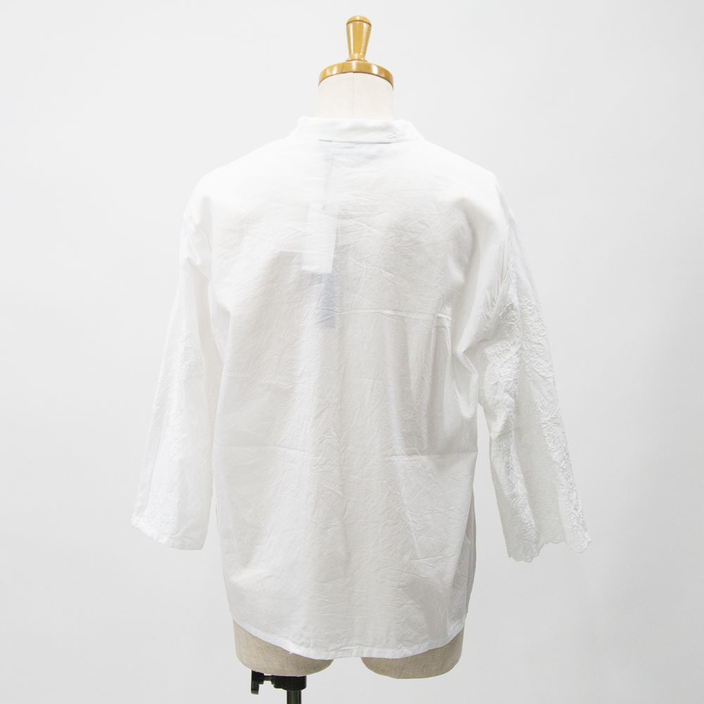 アンティーク調のレース地素材のレースシノワズリシャツです。チャイナシャツ風デザインで右袖はスカラップデザインを生かした袖口が特徴。左ネックに隠れボタンが付いて留め外しのしやすいデザインがポイント。バックの身頃面のみレースの無い無地になっています。シンプルなデザインですがレースの華やかさと上品な雰囲気のある1枚です。