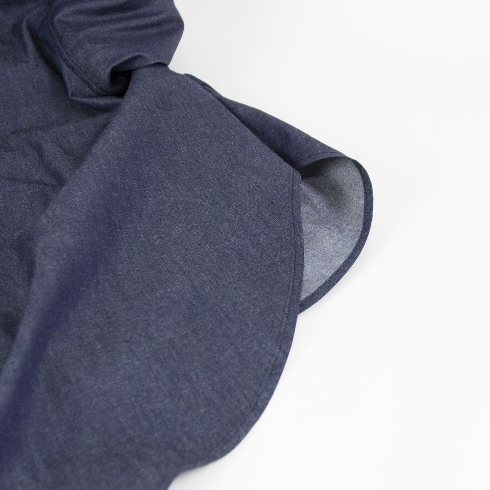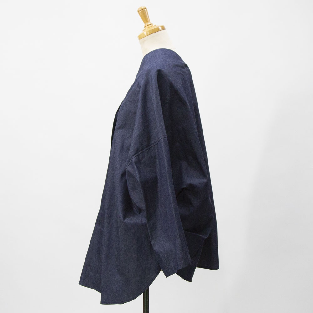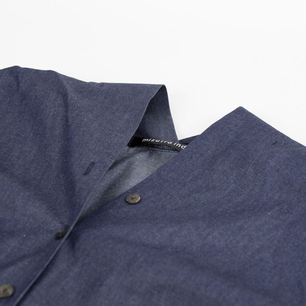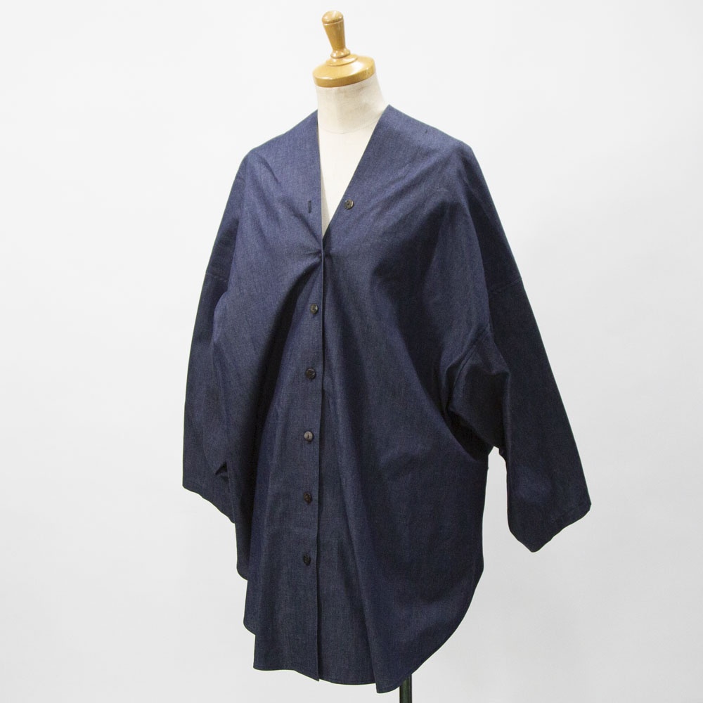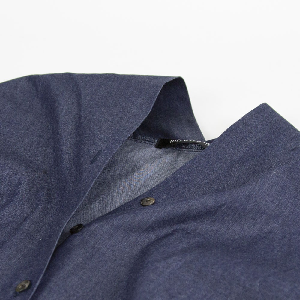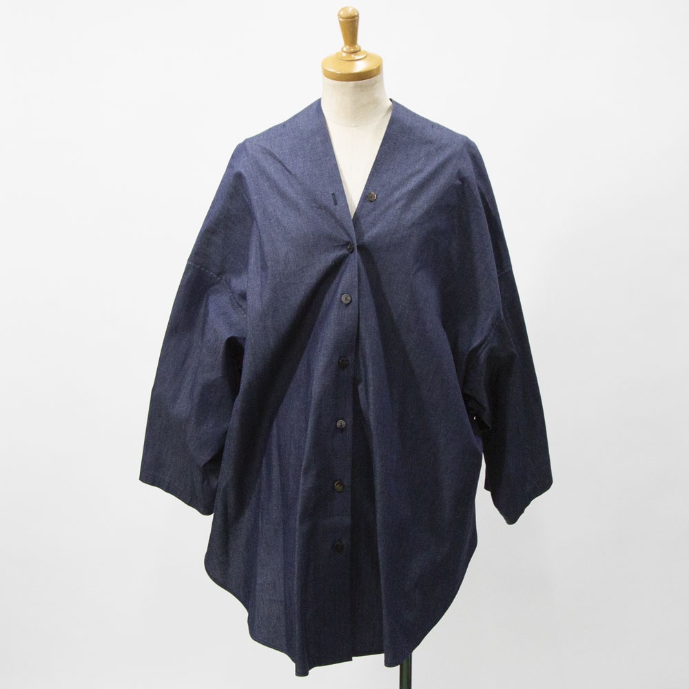 軽さのある4.5OZのデニム素材のVネックデニムシャツです。程よく光沢もあり上品な質感。首元のV開きが女性らしく脇にタックの入ったデザインが印象的。鎖骨辺りから飾りボタンで裾までボタン使いをしたフロントのデザインと、ふんわりと丸みのあるバックのデザイン。前後で表情の違うシルエットはmizuiro indらしい1枚。デニムのカジュアルな印象を感じさせないデニムシャツとなっています。