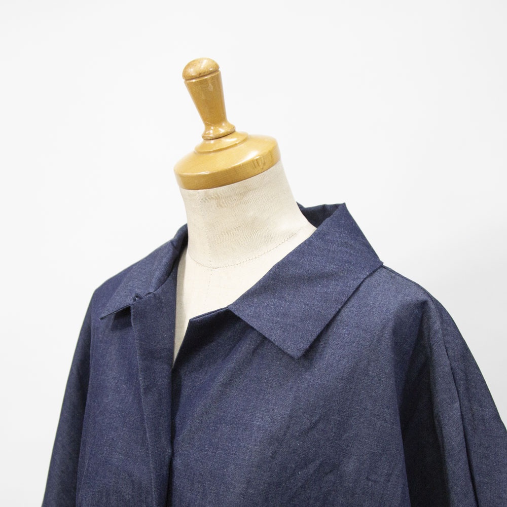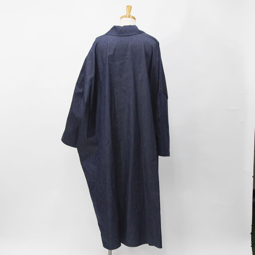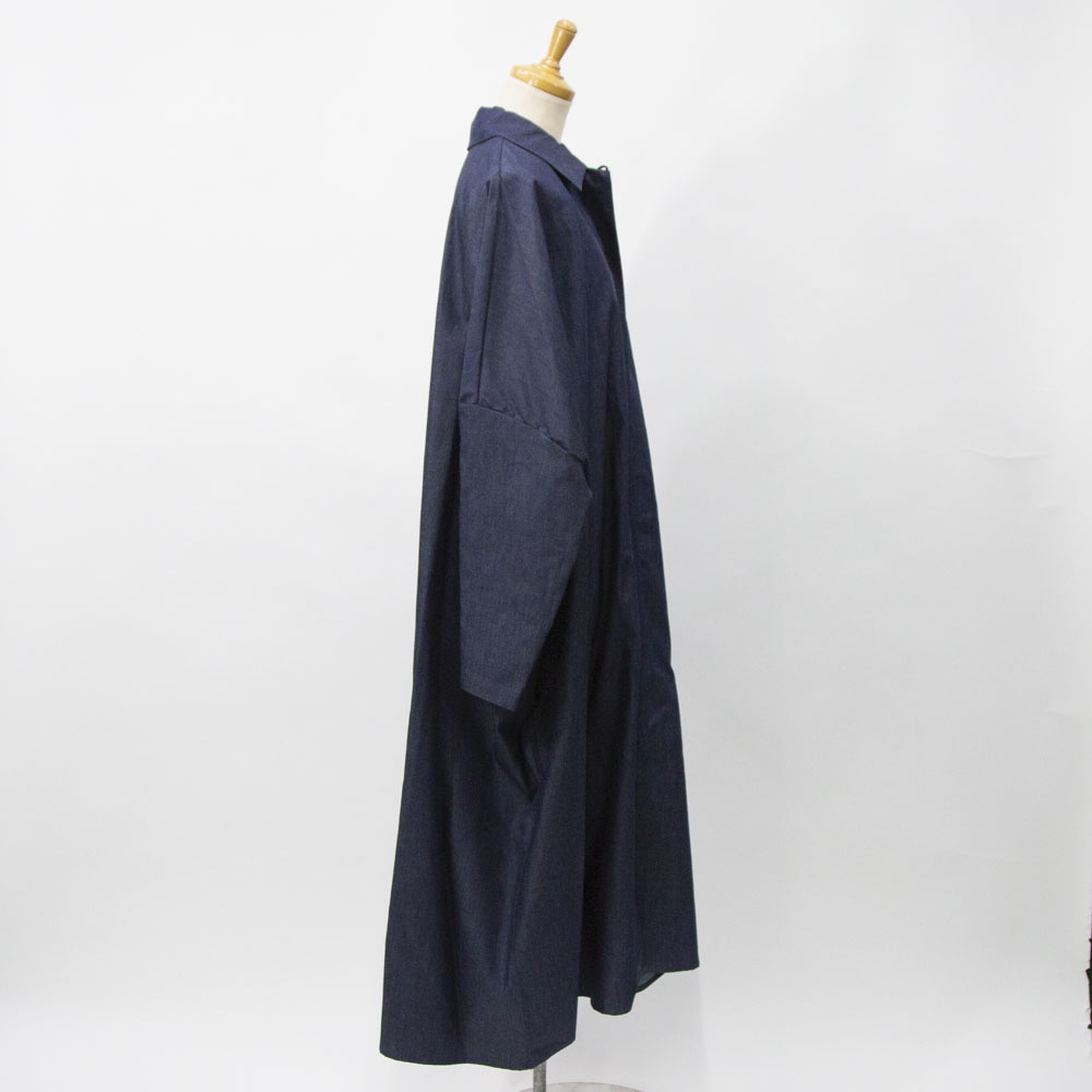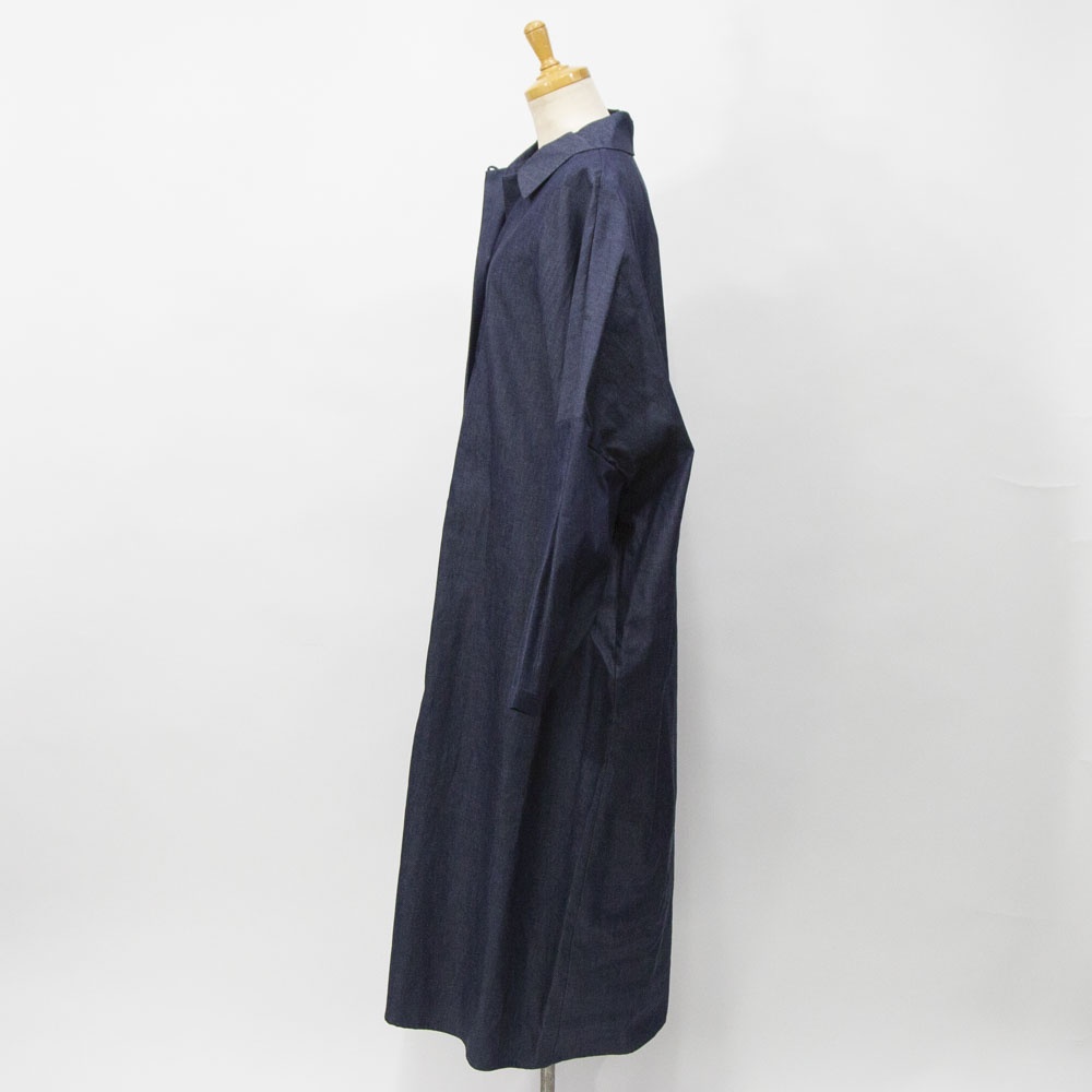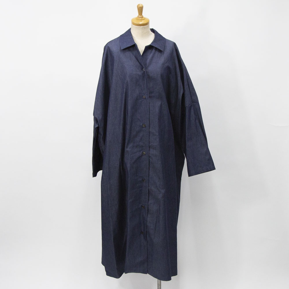 4.5OZのデニム素材を使用したデニムワイドシャツワンピースです。程よい光沢もあり上品な質感が特徴。袖も太めで軽めのアウターとしても使えるシャツワンピース。裾の広がりのないシルエットでワンピースとしてもコートとしてもコーディネートができる1枚です。