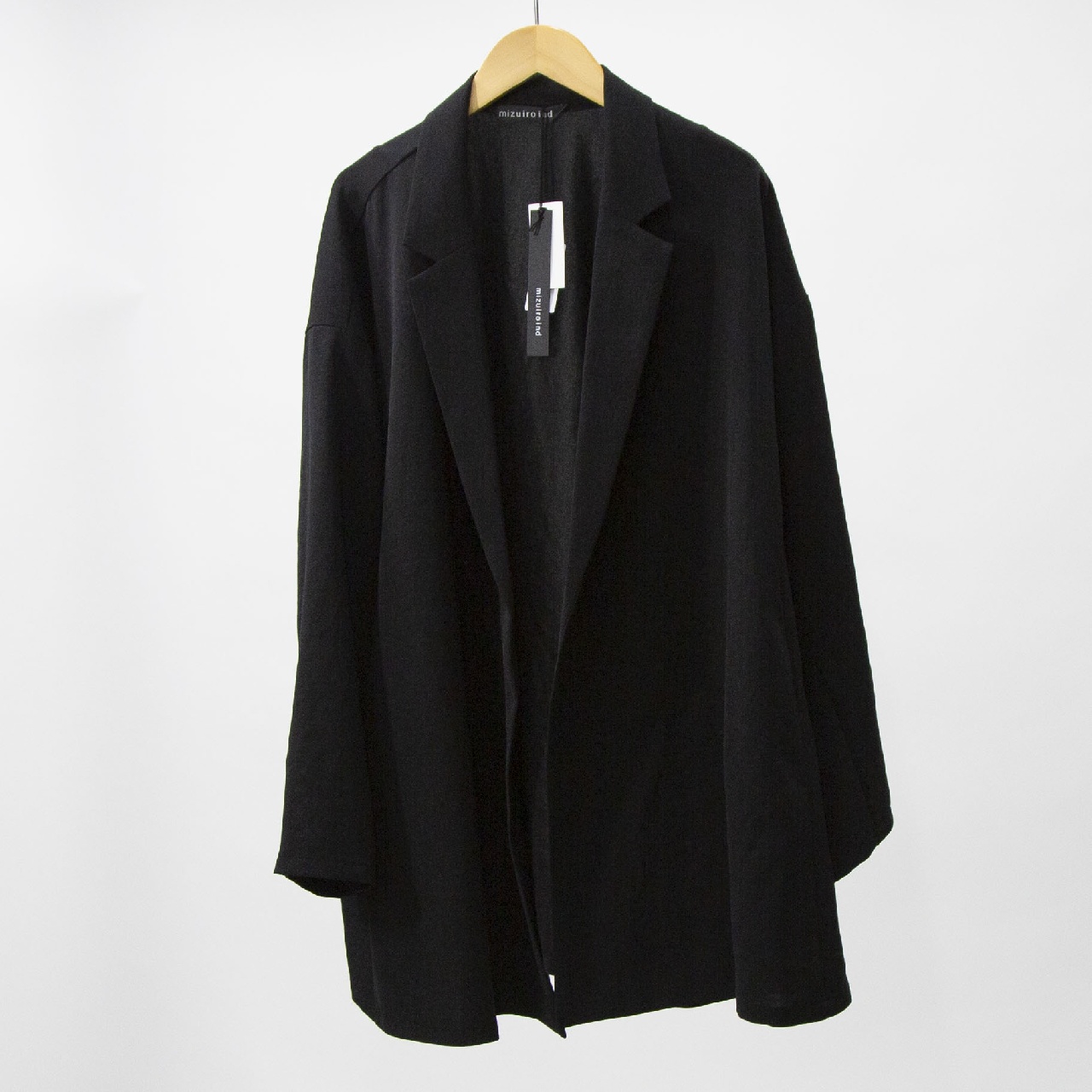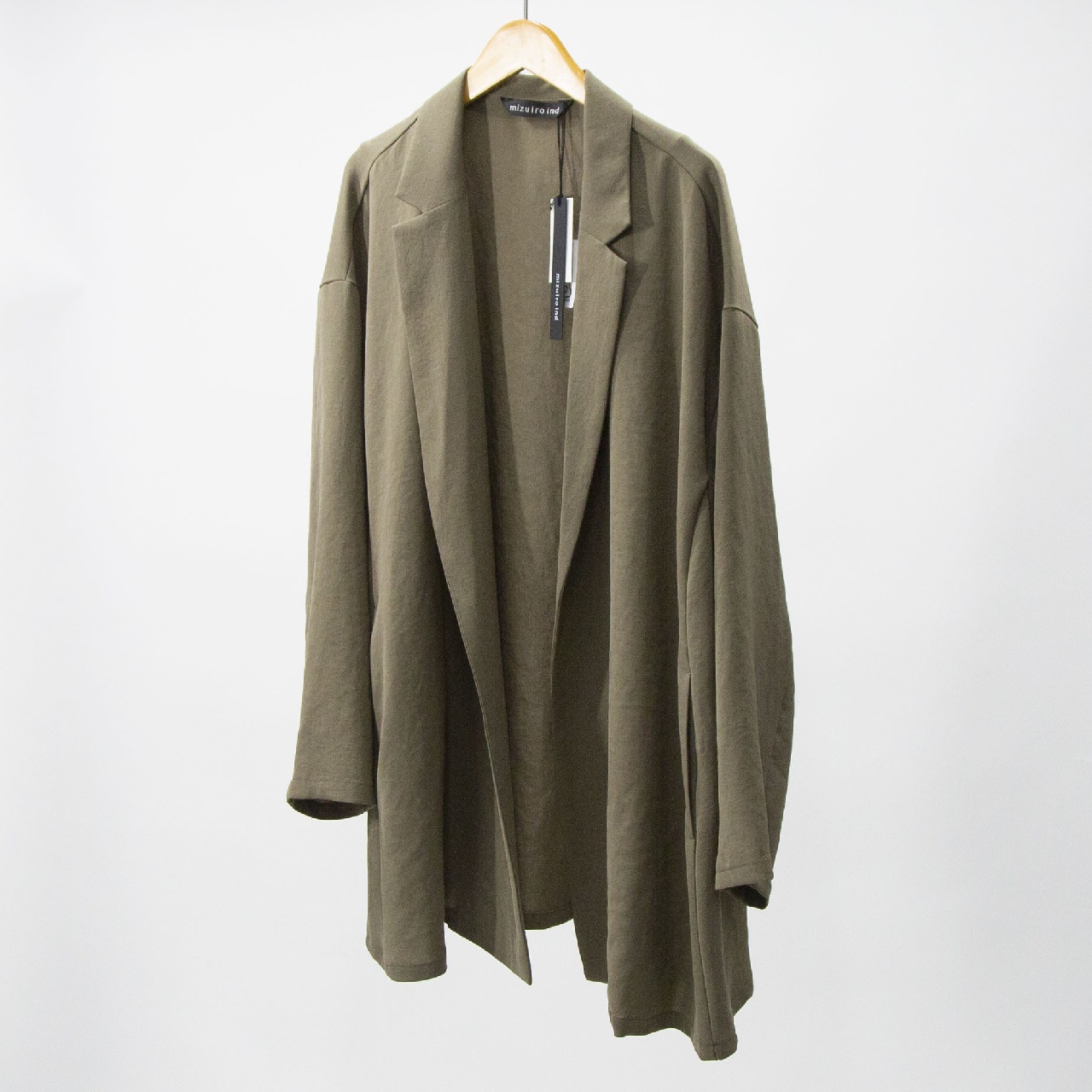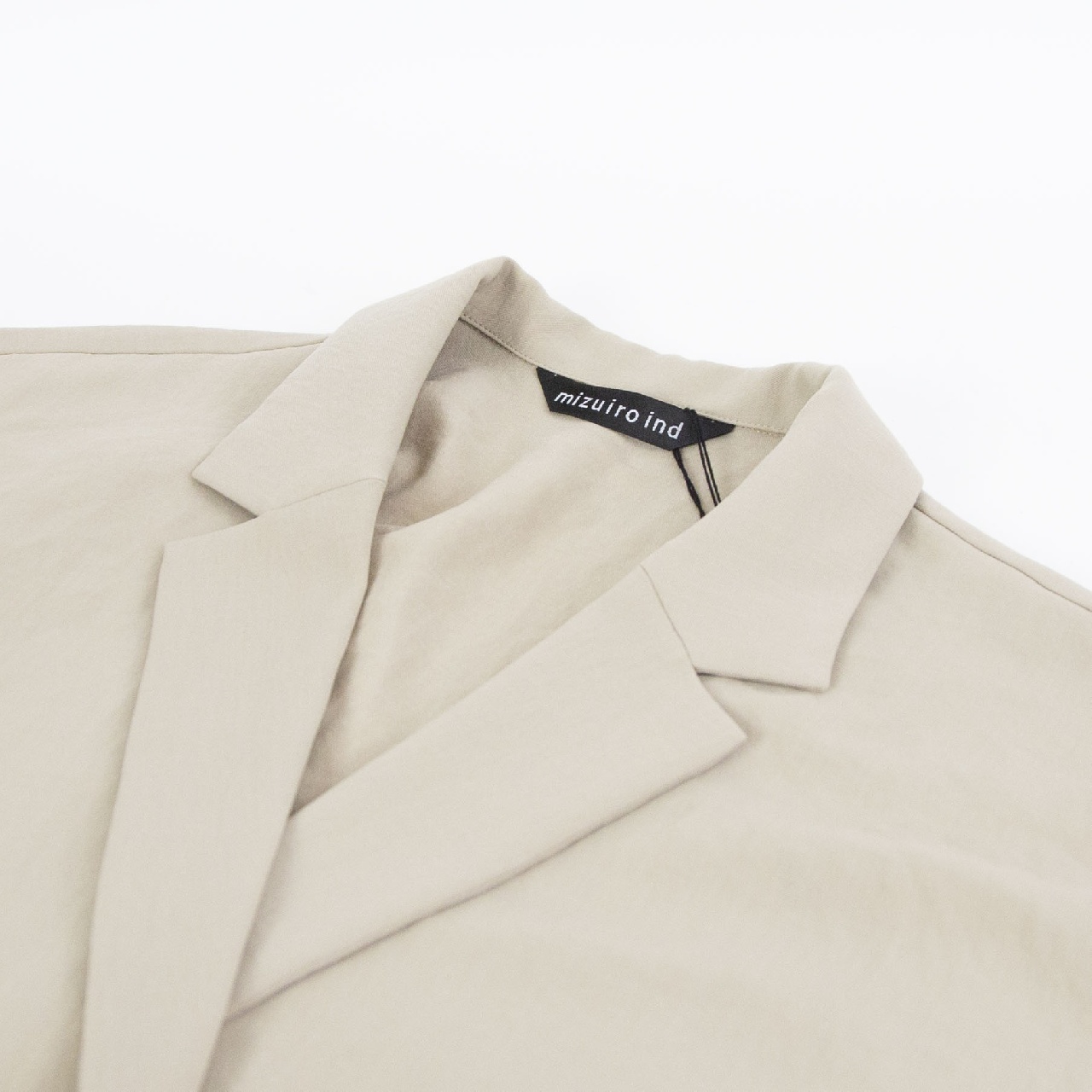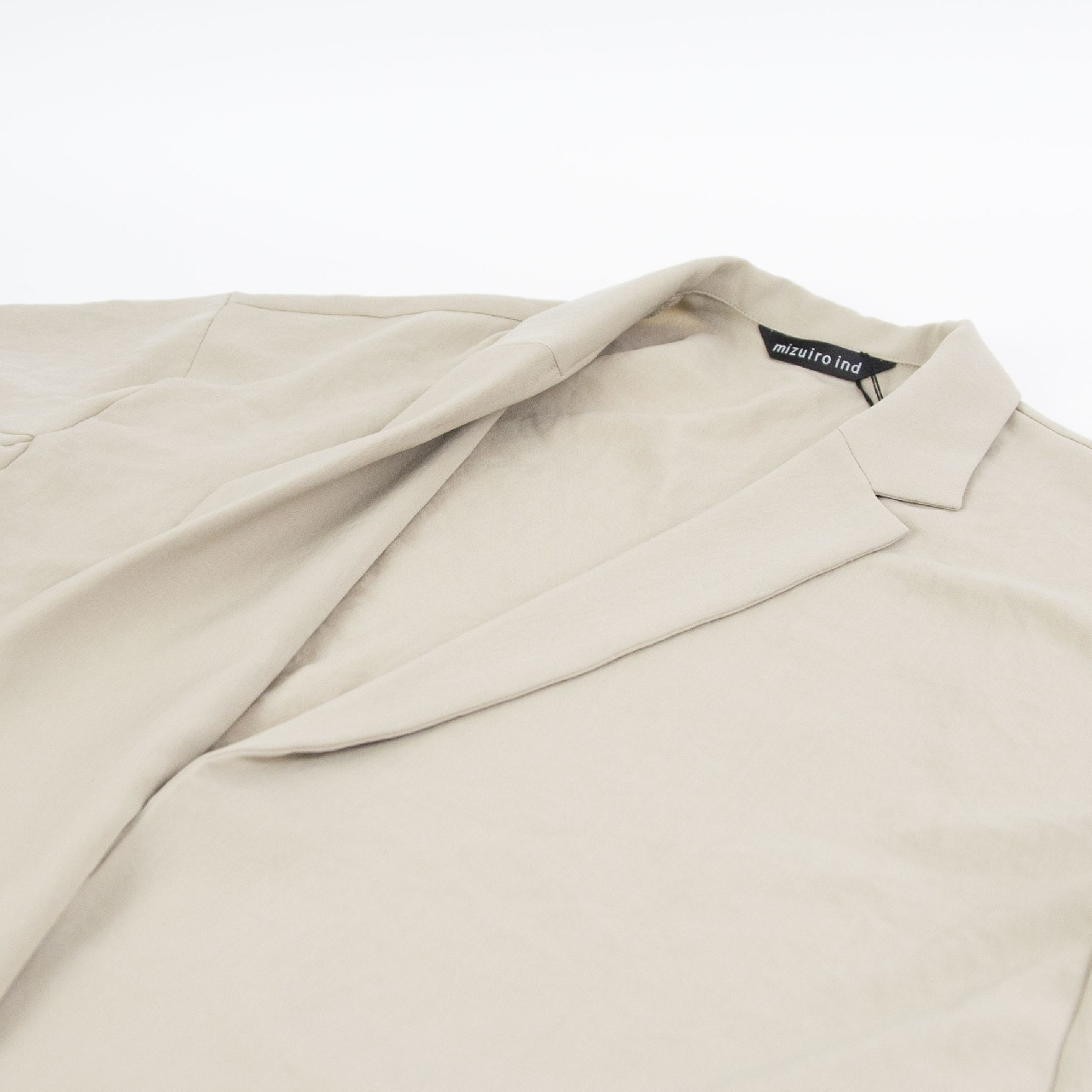 mizuiro ind定番のデザインで、ドライツイルワッシャー素材のテーラードシャツジャケットです。さらっとした肌触りが特徴。ボタンはなくすっきりとしたヒップの隠れる少し長めのデザイン。広がりのあるフレアラインが上品で印象的。上下セットアップもオススメで、1-260109/ラップライクイージーパンツとオケージョン対応に活躍していただけます。