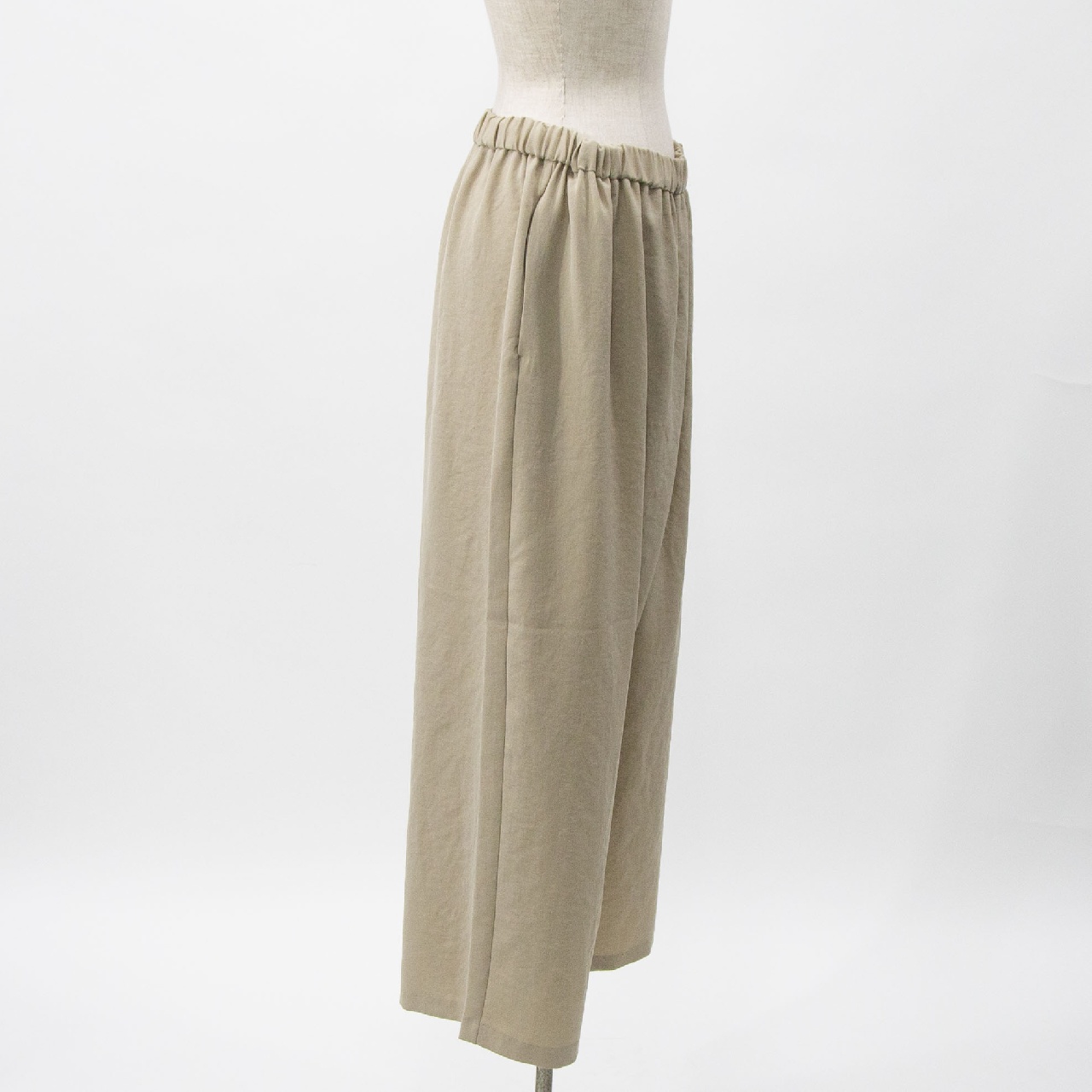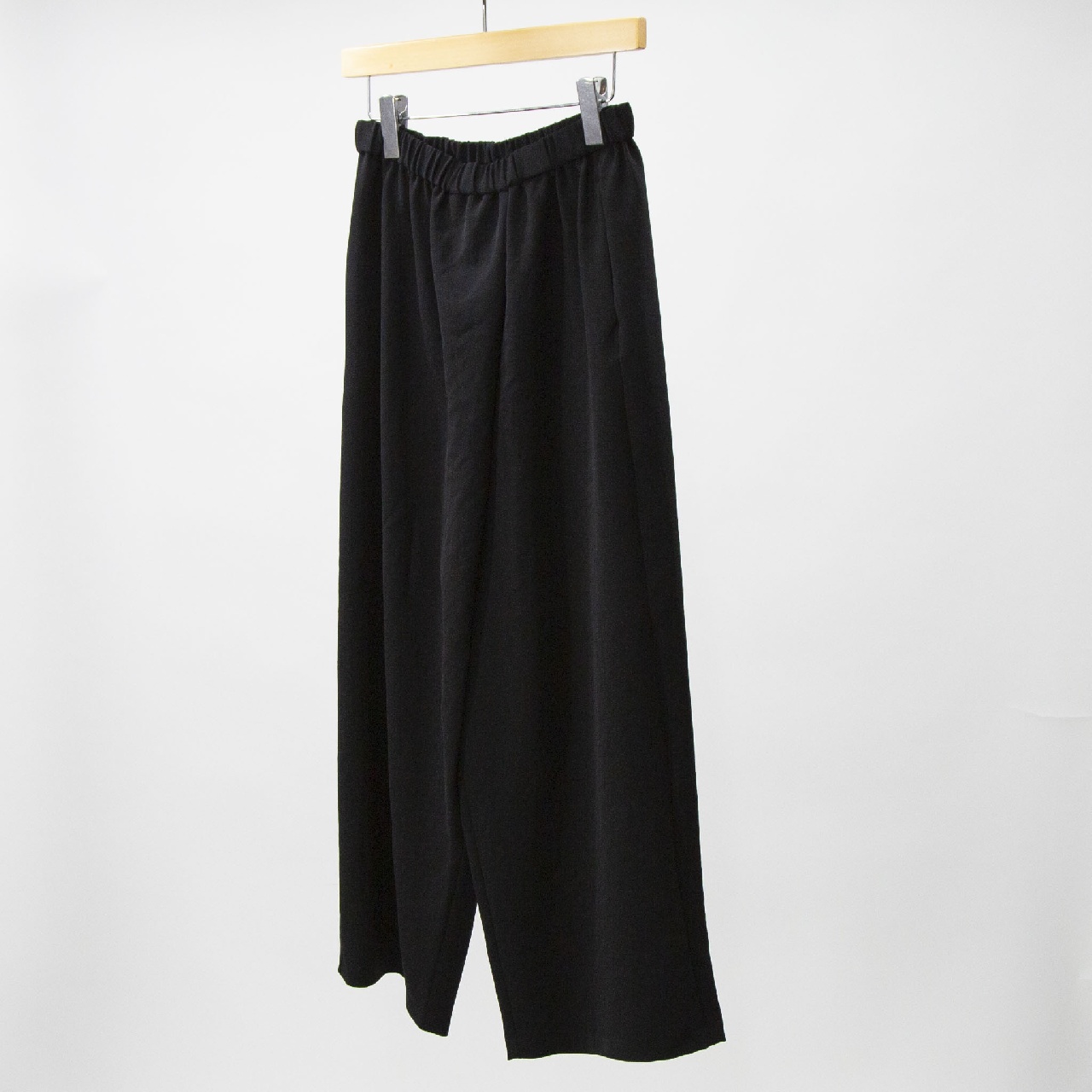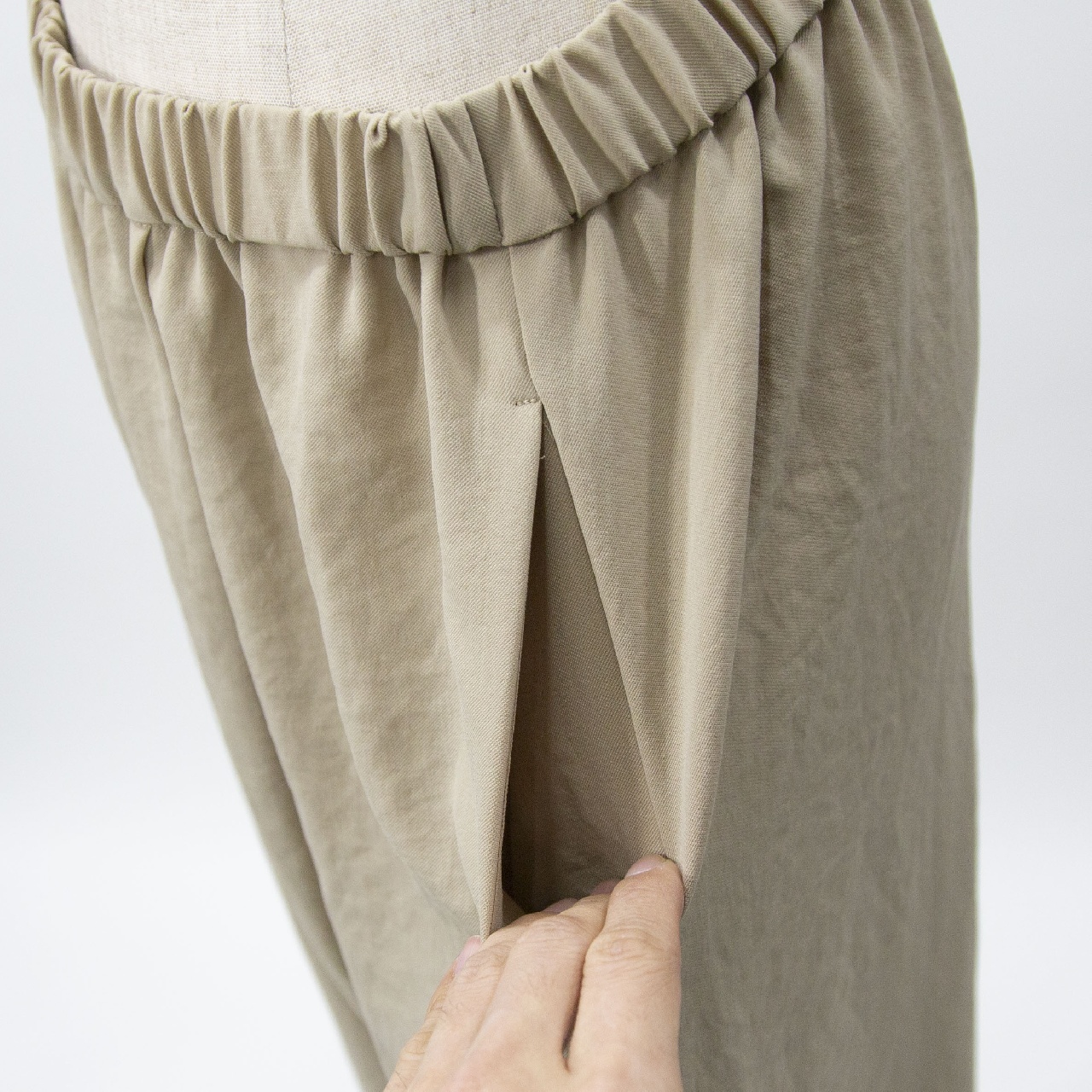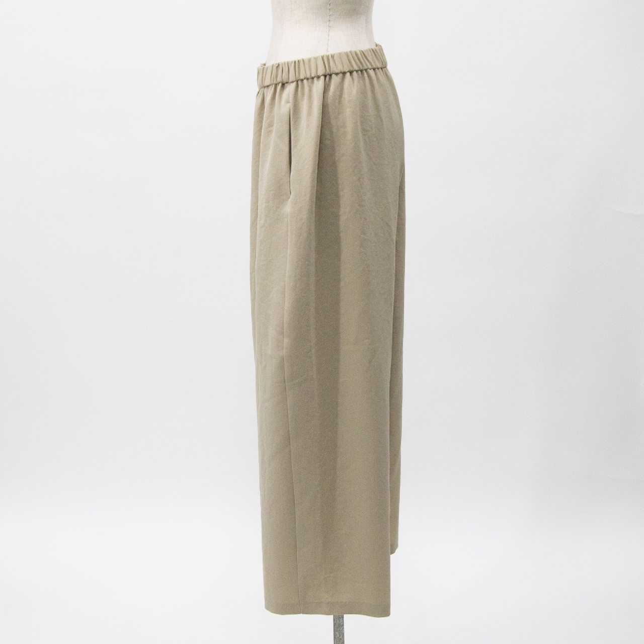 巻きスカートタイプのラップライクイージーパンツです。mizuiro ind定番商品でフルレングスの上品な1枚。ドライツイルワッシャー素材でさらっとした肌触りが特徴。ほどよく広いパンツ幅になっており、ウエストはリラックス感のあるゴム使用。上下セットアップでお勧めで、1-230170/テーラードシャツジャケットとオケージョン対応に活躍していただけます。