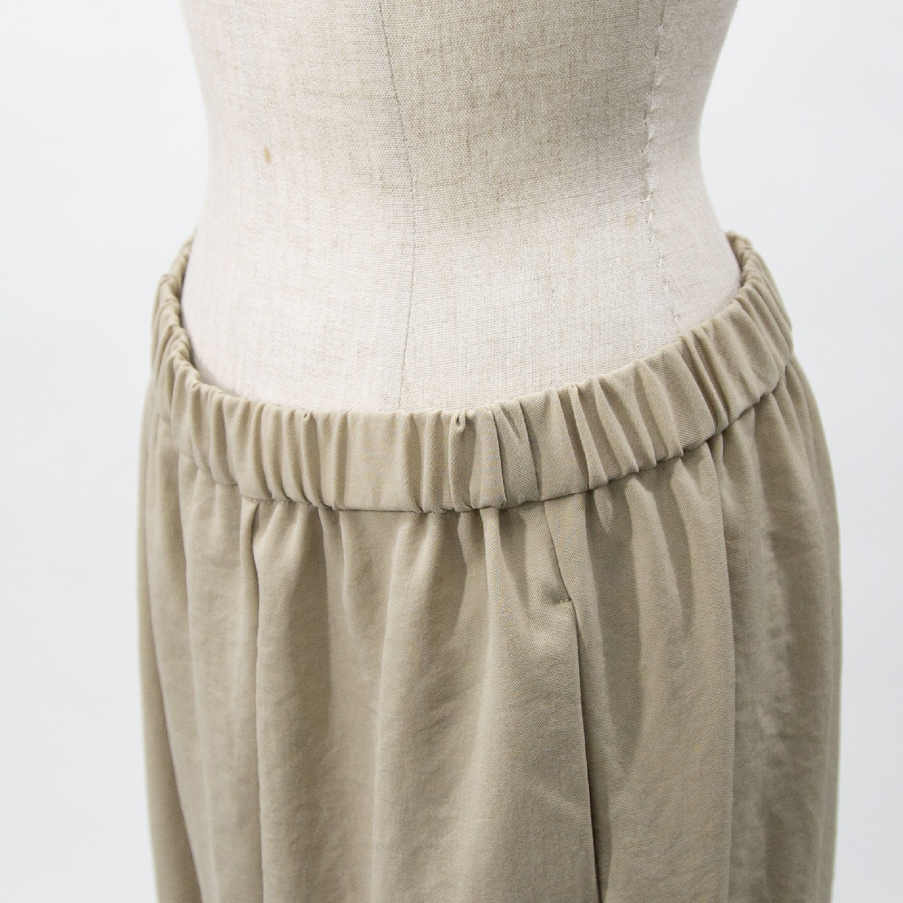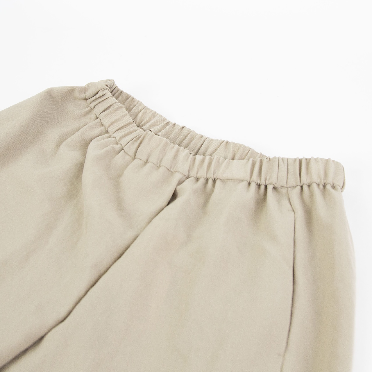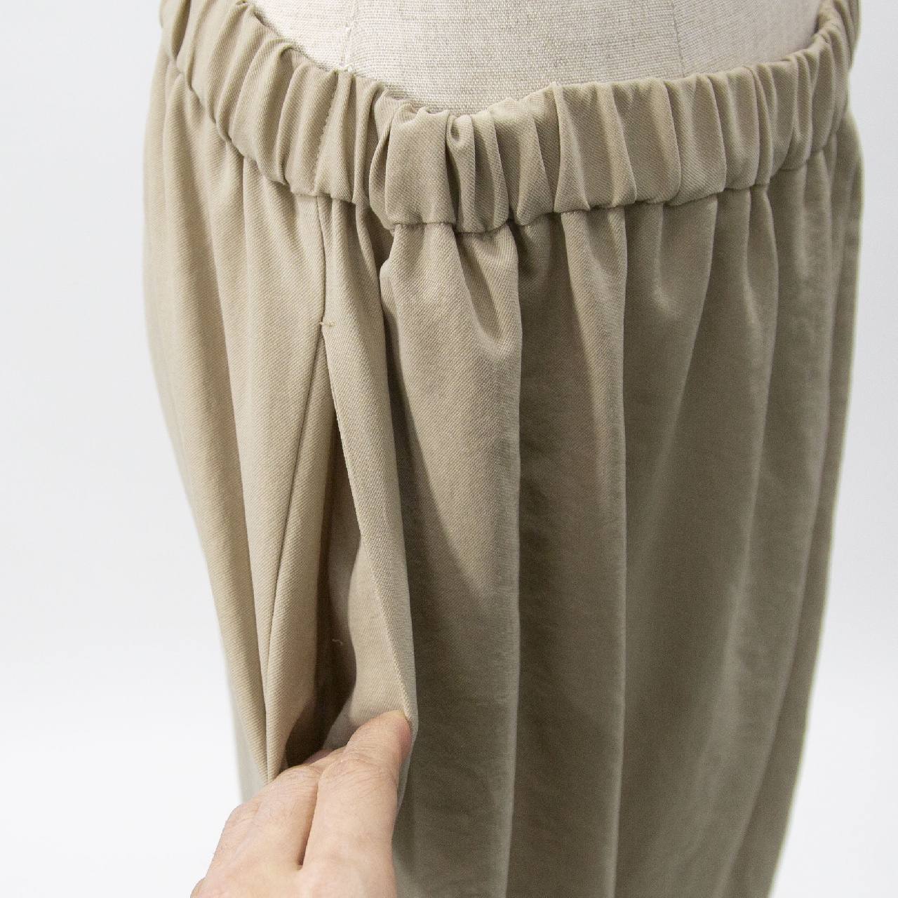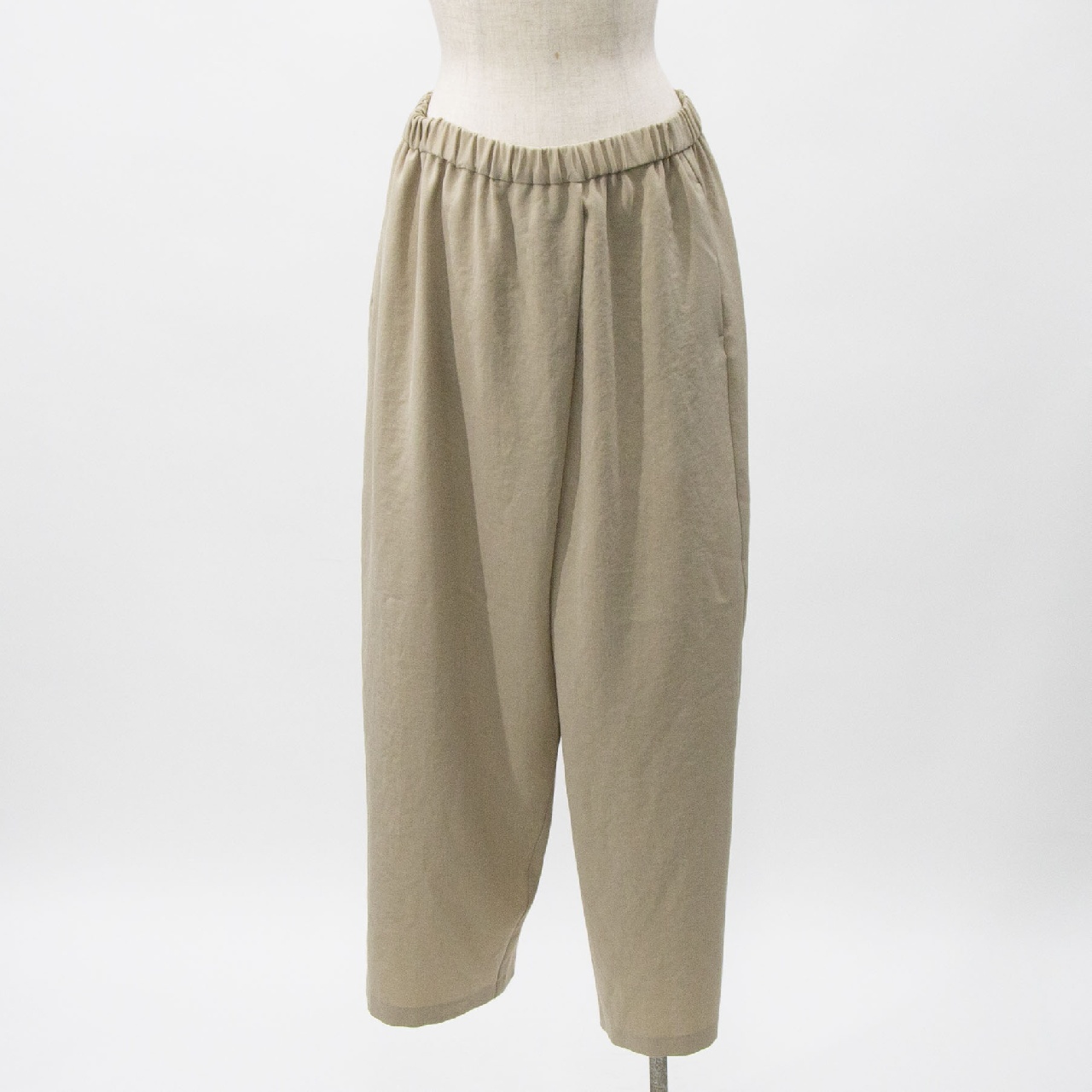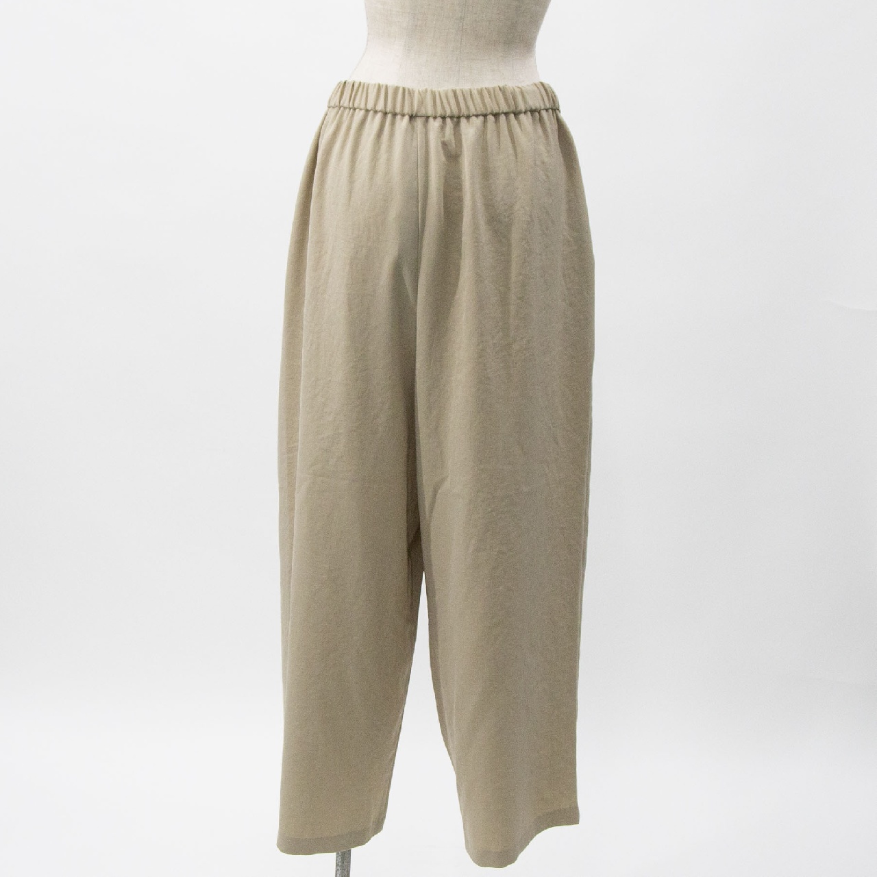 巻きスカートタイプのラップライクイージーパンツです。mizuiro ind定番商品でフルレングスの上品な1枚。ドライツイルワッシャー素材でさらっとした肌触りが特徴。ほどよく広いパンツ幅になっており、ウエストはリラックス感のあるゴム使用。上下セットアップでお勧めで、1-230170/テーラードシャツジャケットとオケージョン対応に活躍していただけます。