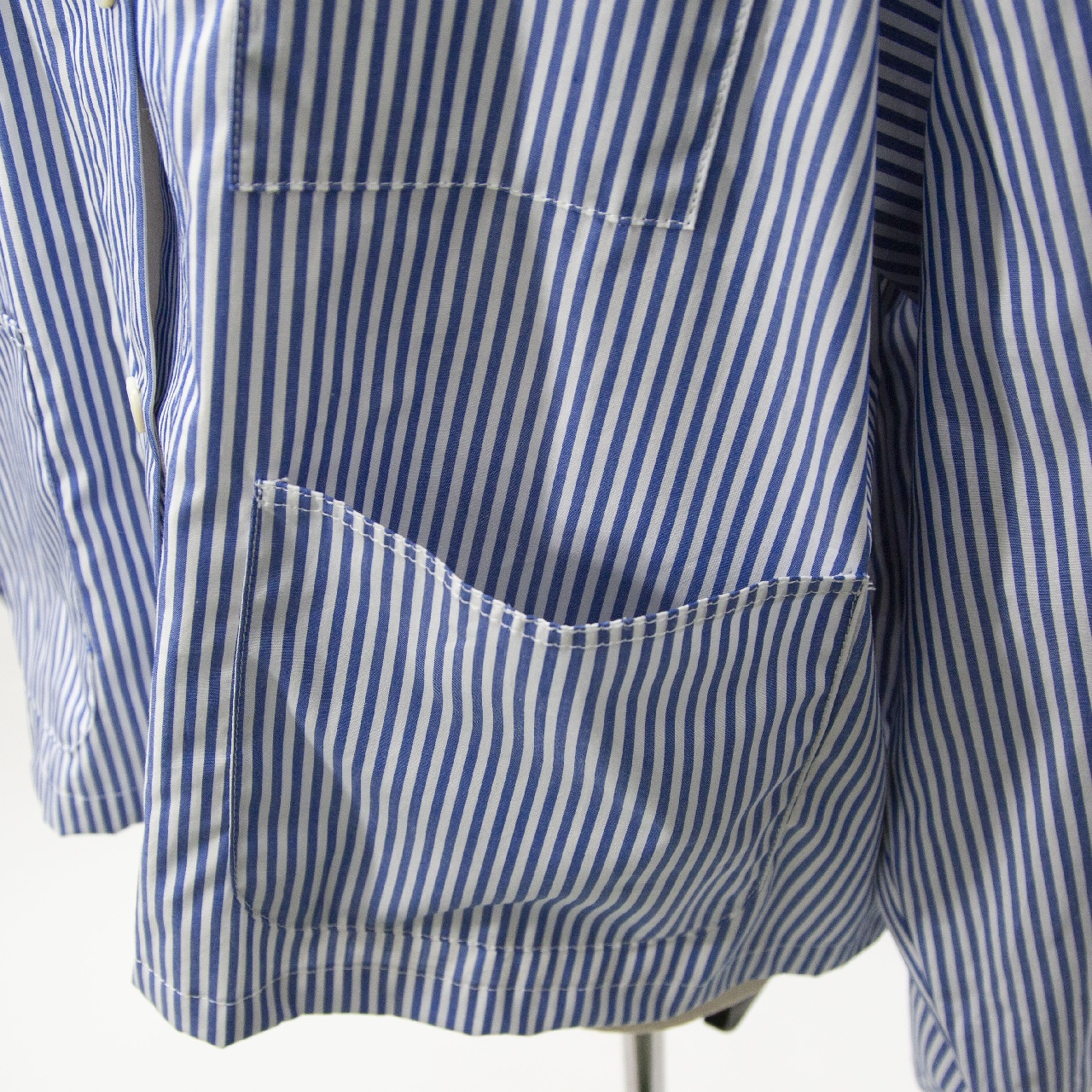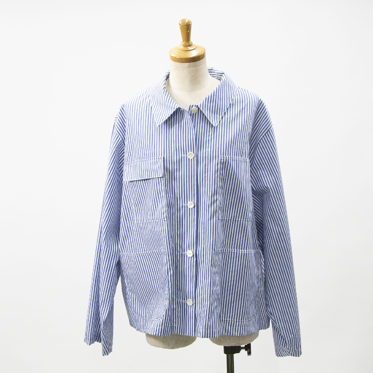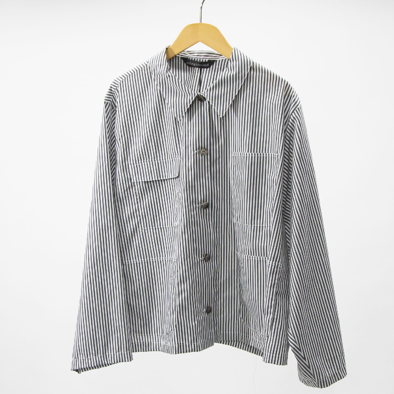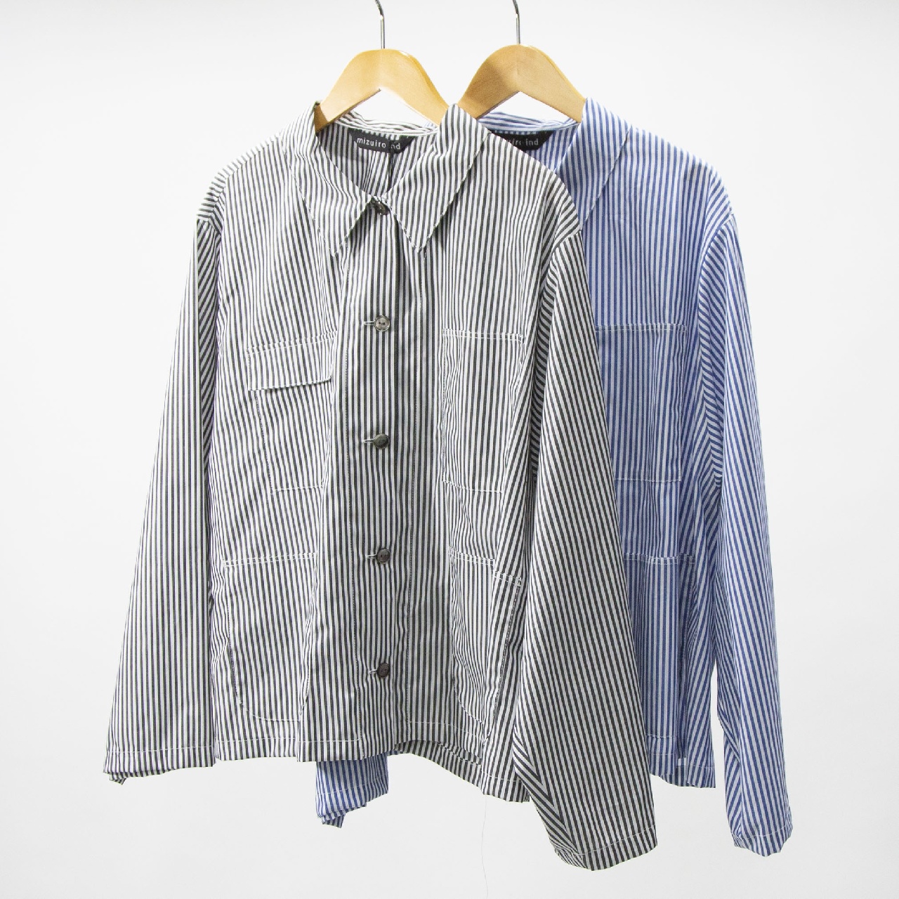 mizuiro indらしいストライプアイテムとしてストライプカバーオール入荷しました。30番のステッチ糸を使用してフロントポケットが4つ付いたシャツジャケット。コンパクトなジャケット仕様で軽めのアウターとして羽織って着こなしてもOK◎インナーを見せたりコーディネートも幅広く楽しんでいただける1枚です。