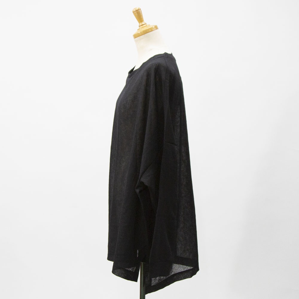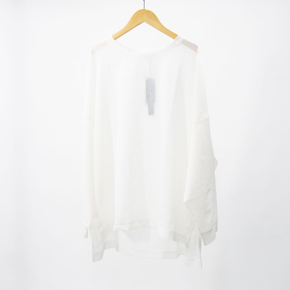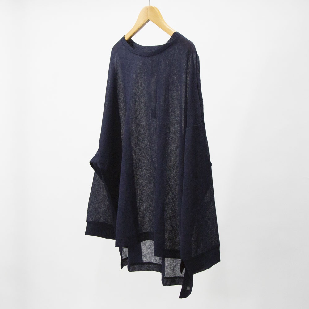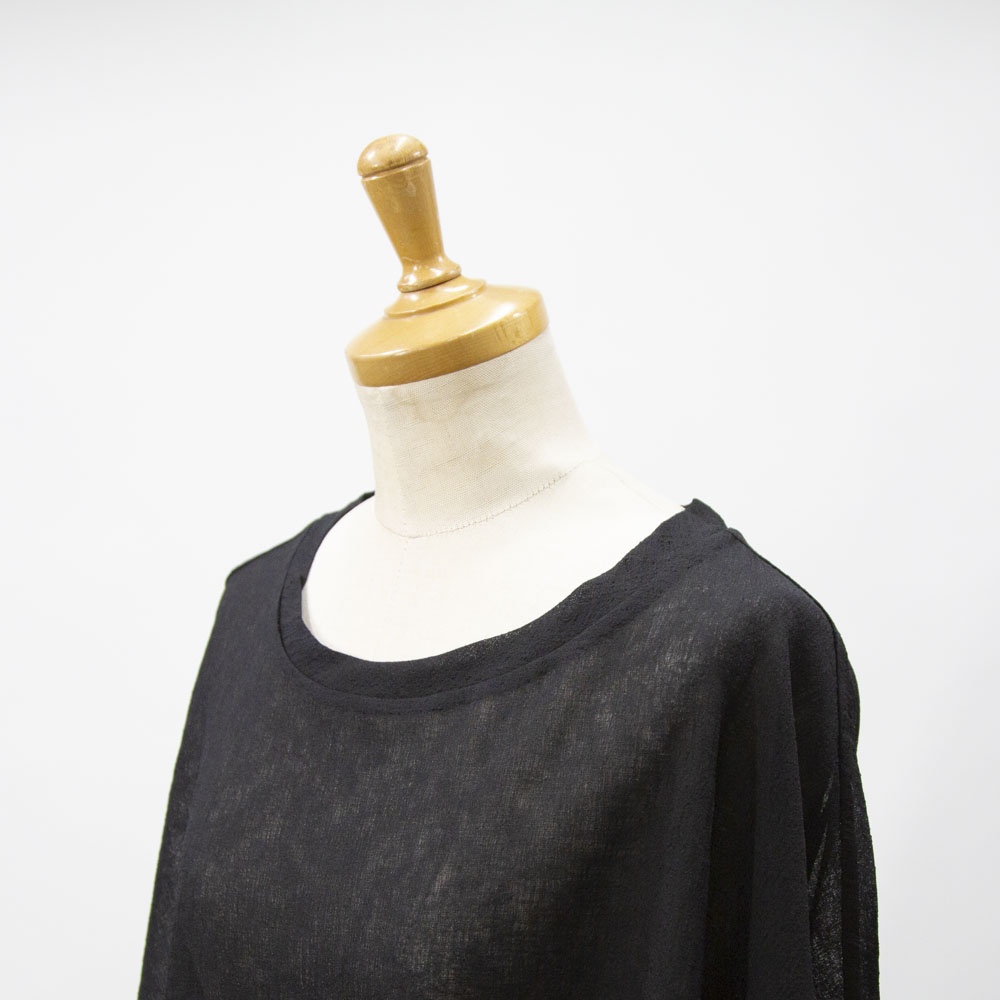 洗い加工が施されたワッシャーボイルクルーネックワイドプルオーバーです。和紙のようなシアーな質感が特徴的。透け感と通気性があるので暑い時期はインナーはキャミソールで◎日焼け対策にも役立ちます。前後差を付けた動きのあるデザインとサイズ感なので、長袖との重ね着にもお勧め。シンプルに着回しがきくので長く愛用していただけます。