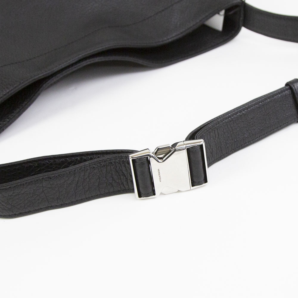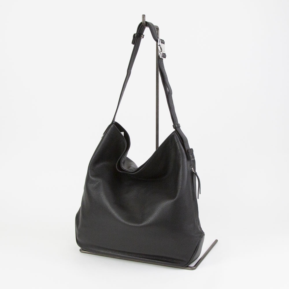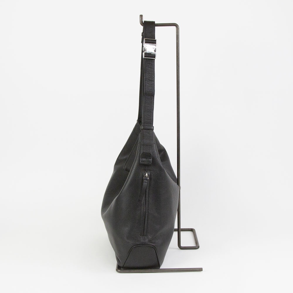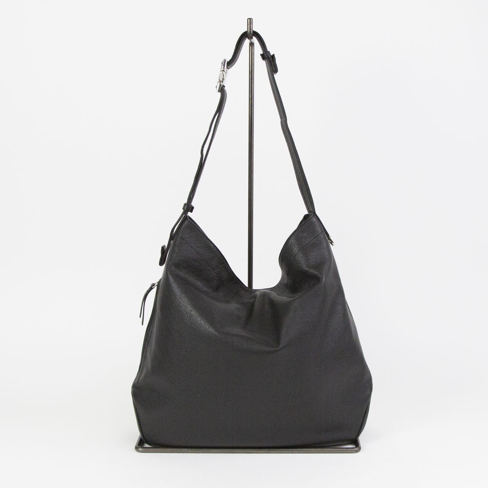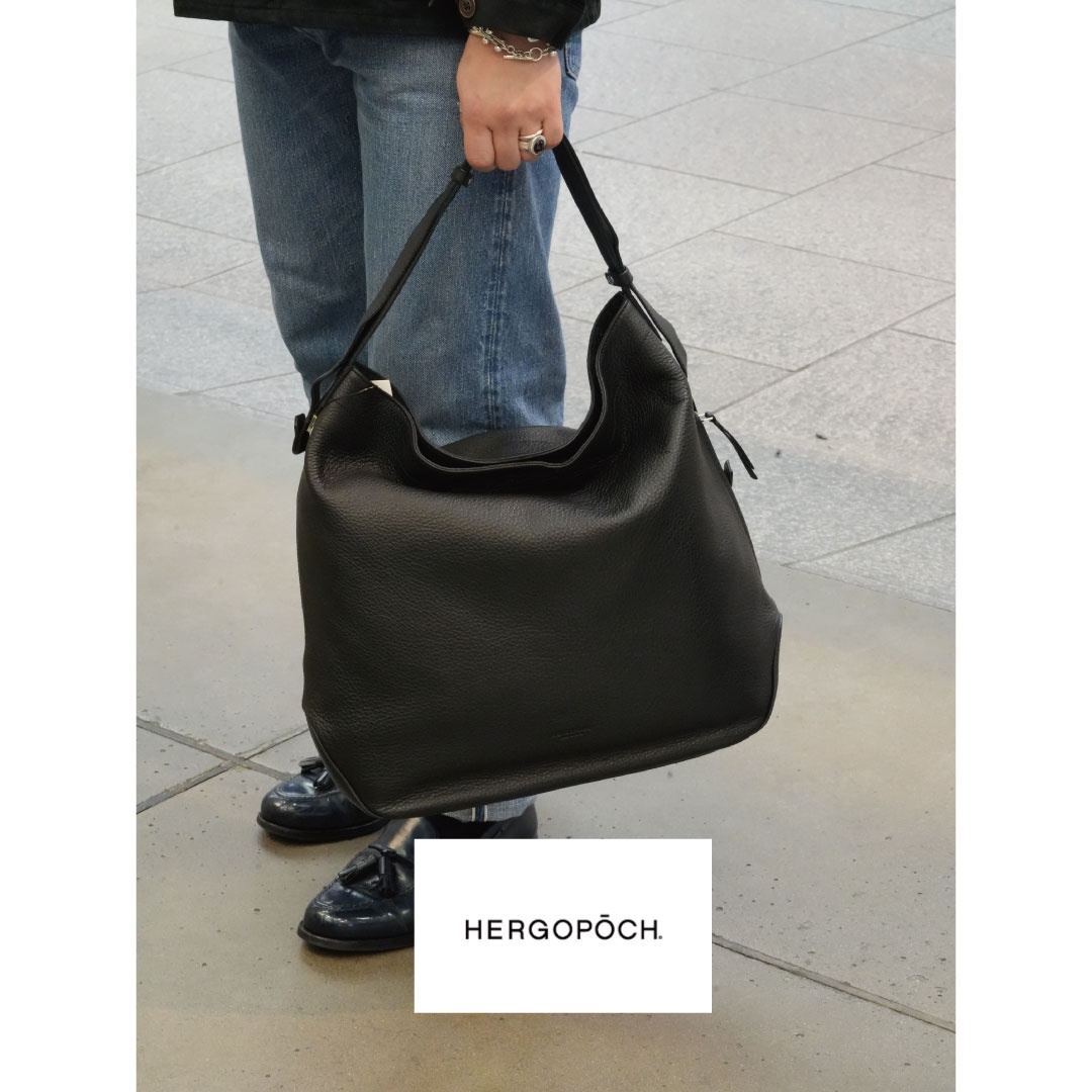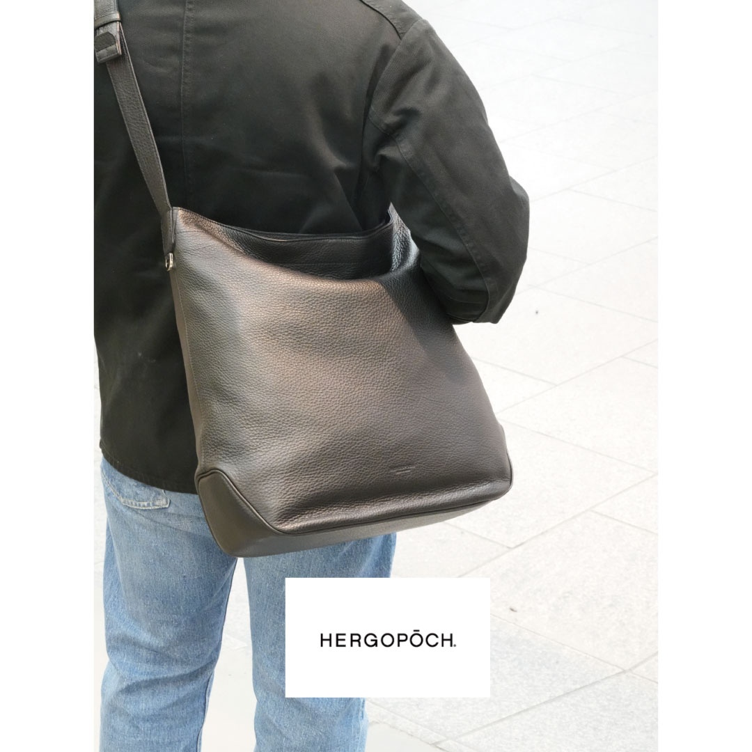 ソフトシュリンクレザーを使用したミディアムサイズのショルダーバッグ。柔らかなレザーを生かしたドレープの入り方が雰囲気良し。バックル式で着脱しやすいショルダーストラップは長さ調整域が広く、ハンドル持ち、肩掛け、斜め掛けまで多様な持ち方が可能です。外装のサイドにはアクセスしやすいファスナーポケット、メインルームには14インチ対応のPCポケットまで備えます。ざっくりしたルックスながら、デイリーに持ちやすい機能も有する万能なバッグです。