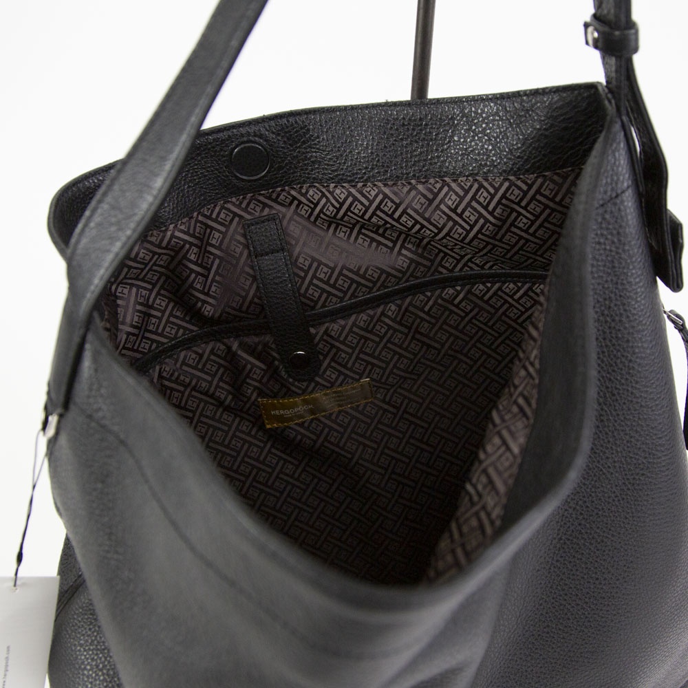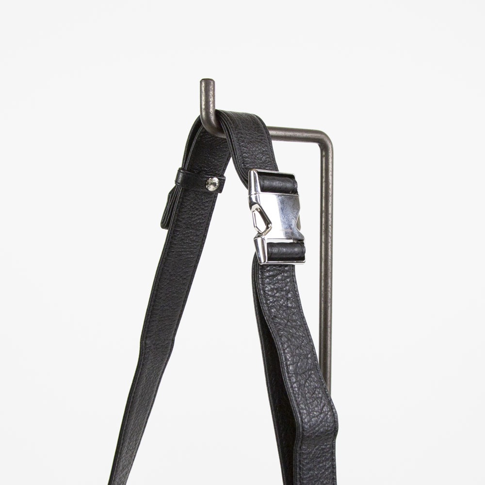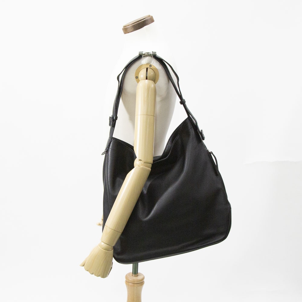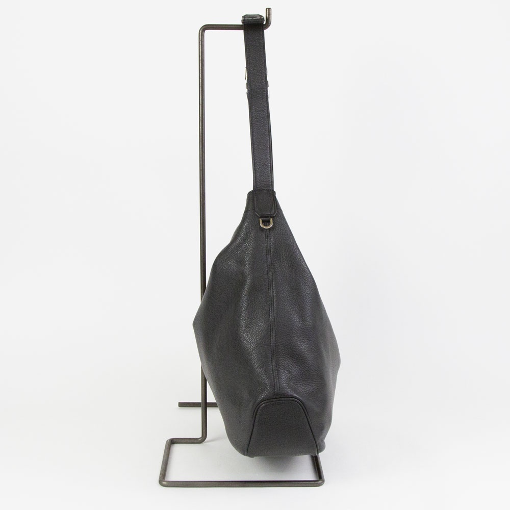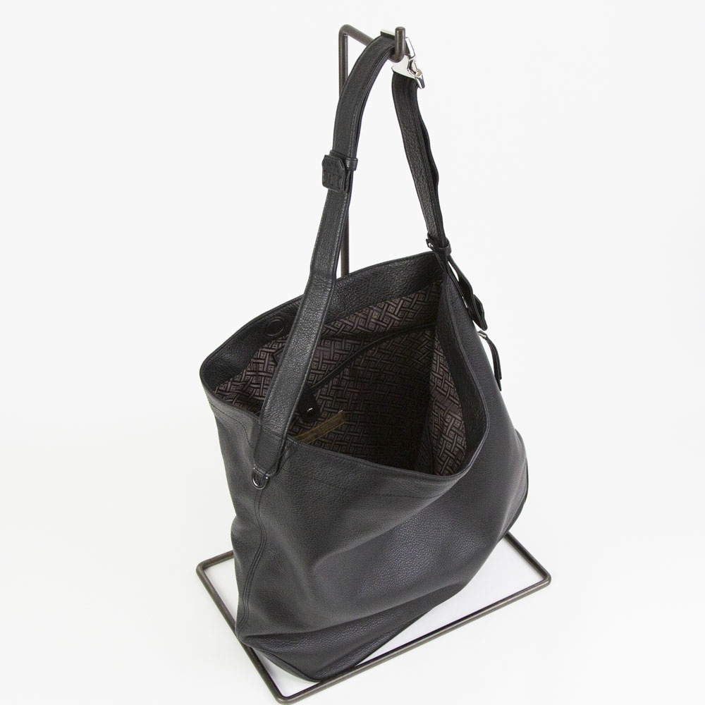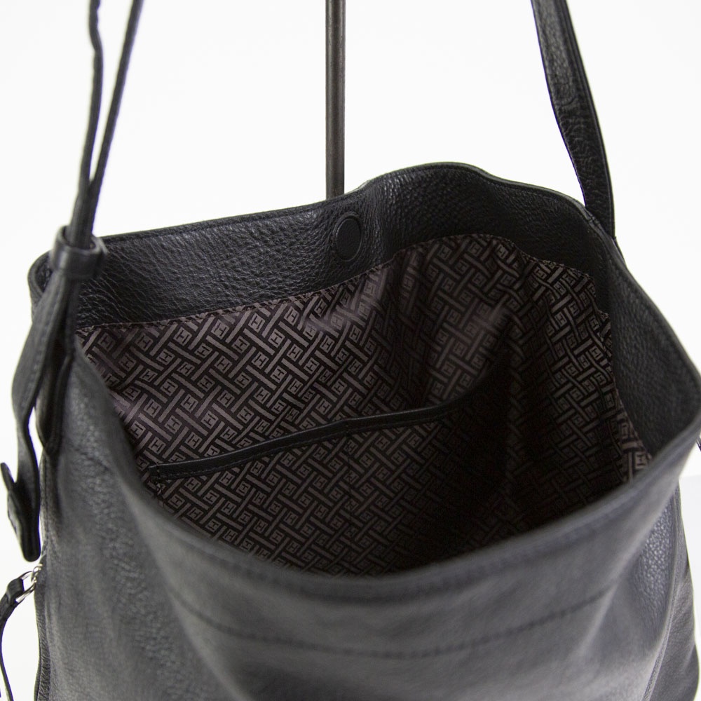 ソフトシュリンクレザーを使用したミディアムサイズのショルダーバッグ。柔らかなレザーを生かしたドレープの入り方が雰囲気良し。バックル式で着脱しやすいショルダーストラップは長さ調整域が広く、ハンドル持ち、肩掛け、斜め掛けまで多様な持ち方が可能です。外装のサイドにはアクセスしやすいファスナーポケット、メインルームには14インチ対応のPCポケットまで備えます。ざっくりしたルックスながら、デイリーに持ちやすい機能も有する万能なバッグです。