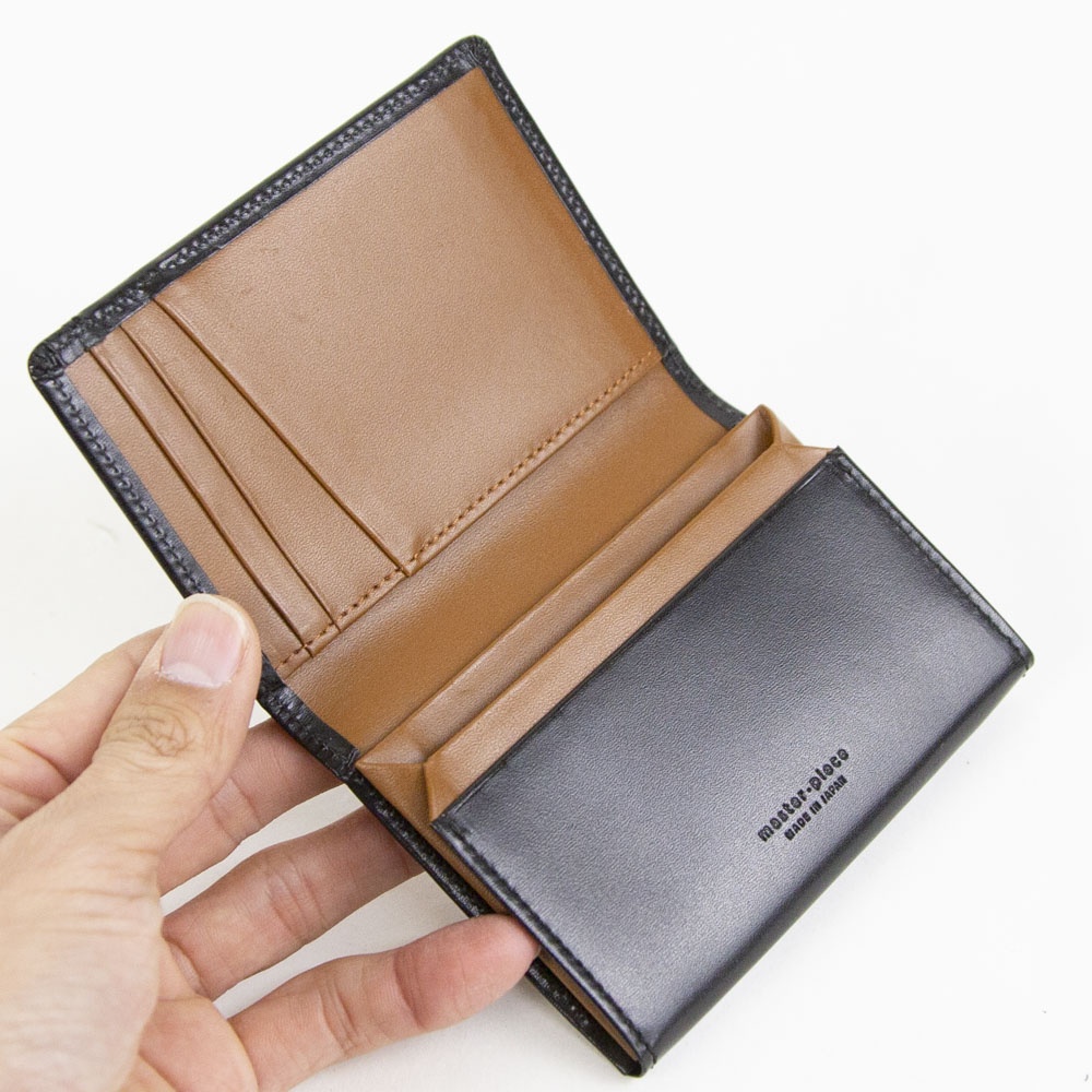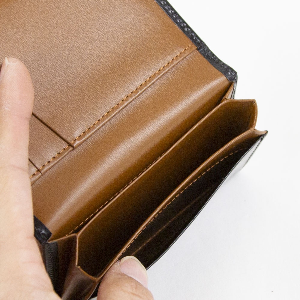 本体素材は日本で唯一LWG(レザーワーキンググループ)と取得しているタンナーで作られており、ステアレザーにクロム鞣しをして染色し、銀面を擦って浮きが出ない様に特殊な薬品を使いタイトコート加工をしています。 バインダーで銀面を平らに滑らかにならしていき、塗料を吹き付けることにより綺麗な発色のレザーになります。 表面にはキップ調の型押しをすることでキメの整った仕上がりとなっています。