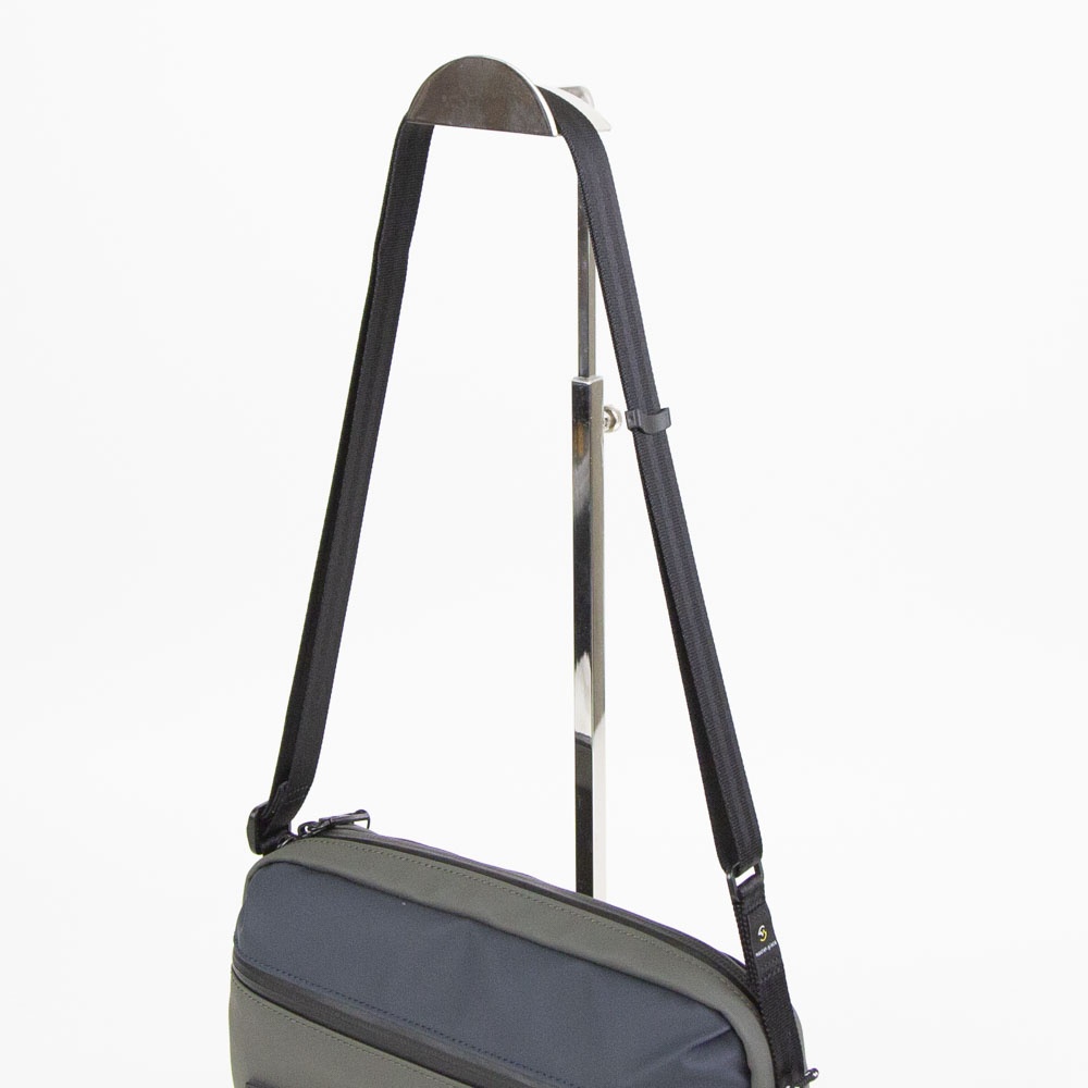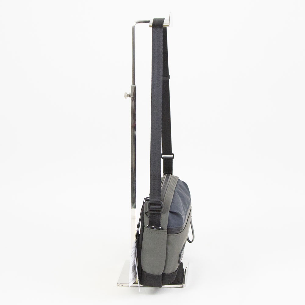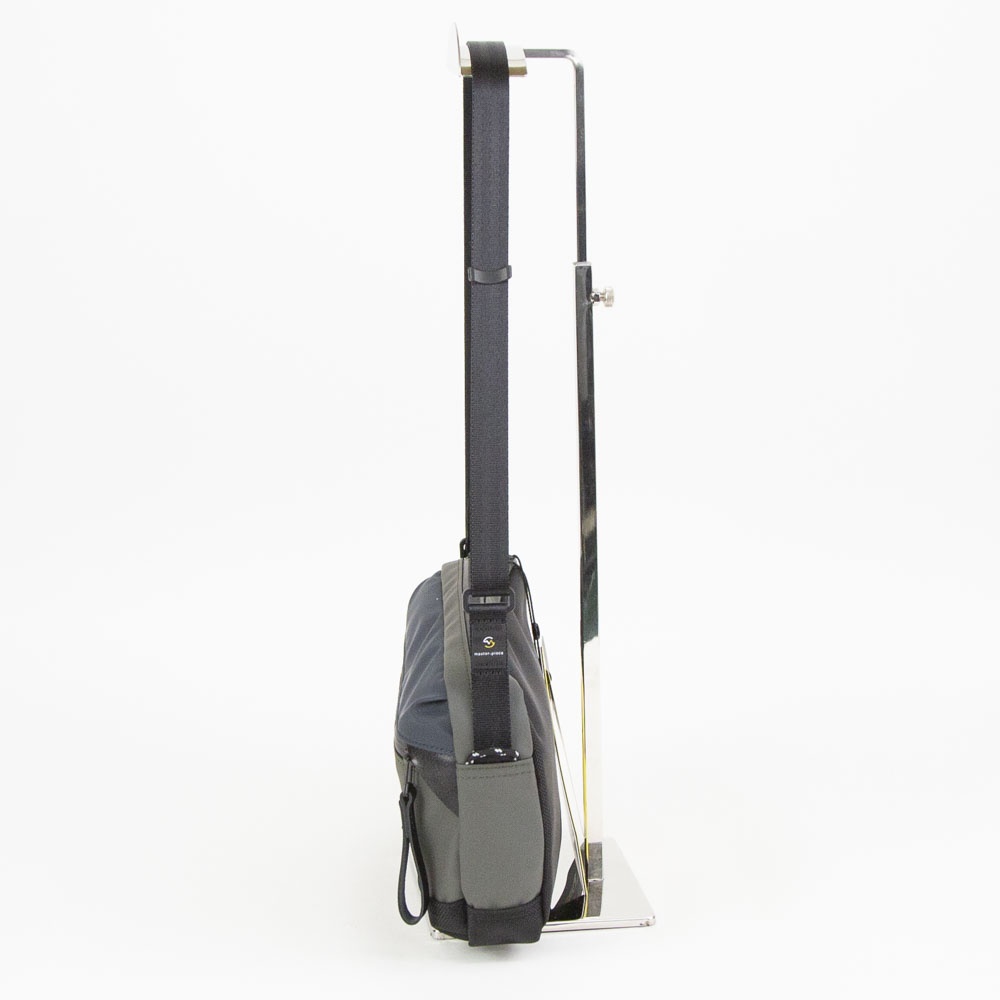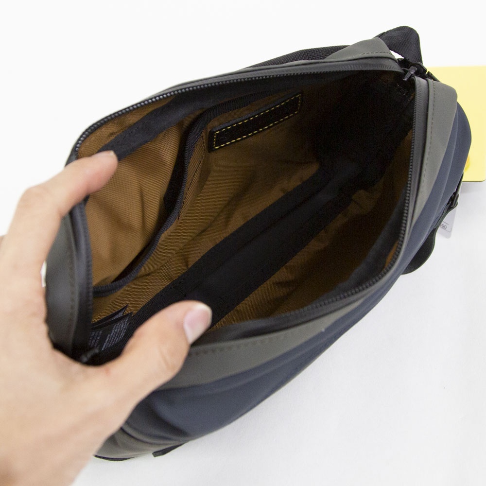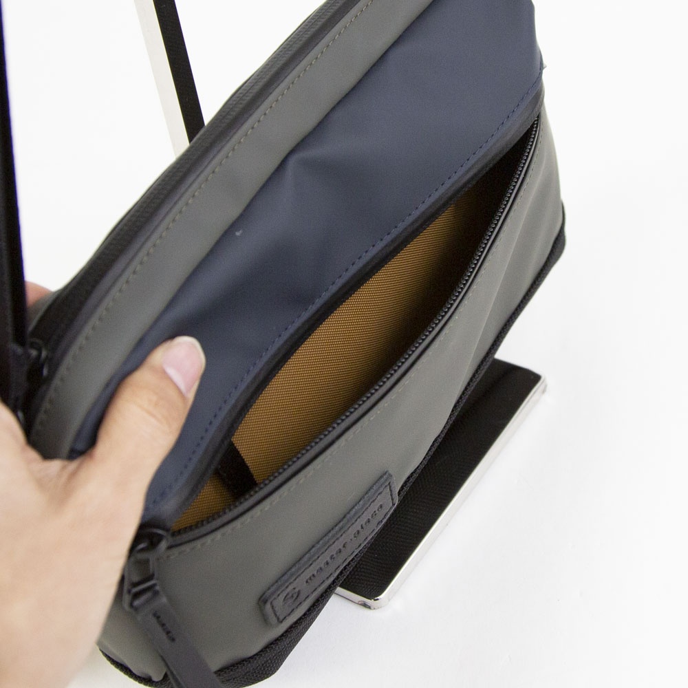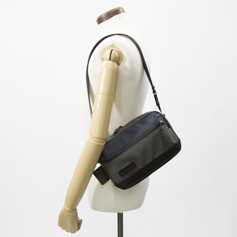 メイン収納内には、ガジェット類などの小物を整理して収納できるポケットを備えています。フロントにも出し入れの多い小物に便利なポケットを配置し、必要なアイテムをスムーズに取り出せる仕様です。 本体サイドにはカラビナなどを装着できるコードを付けており、鍵や小物を外付けできる実用性も備えています。素材にはマットな質感のコーティング素材を採用し、落ち着いた印象に。