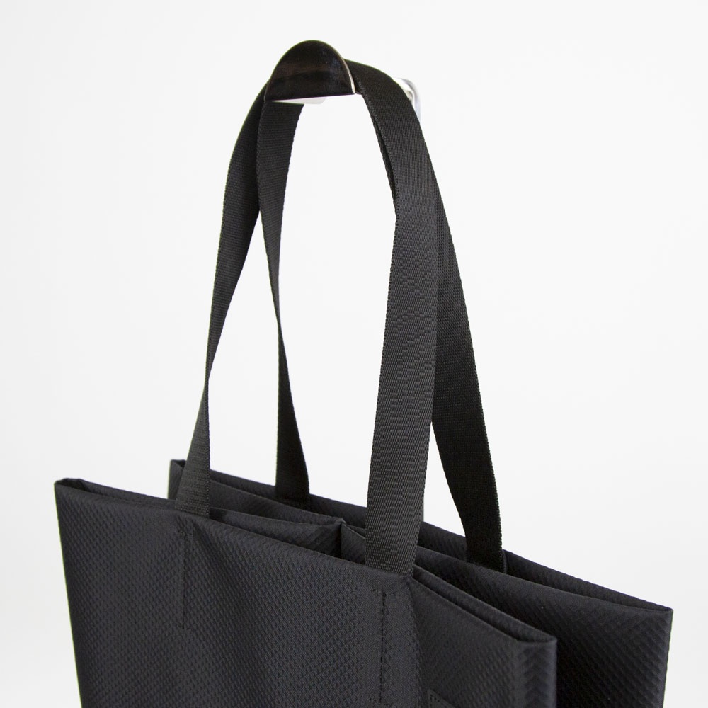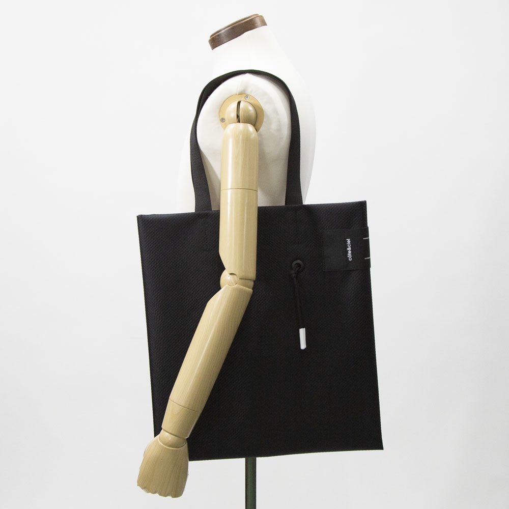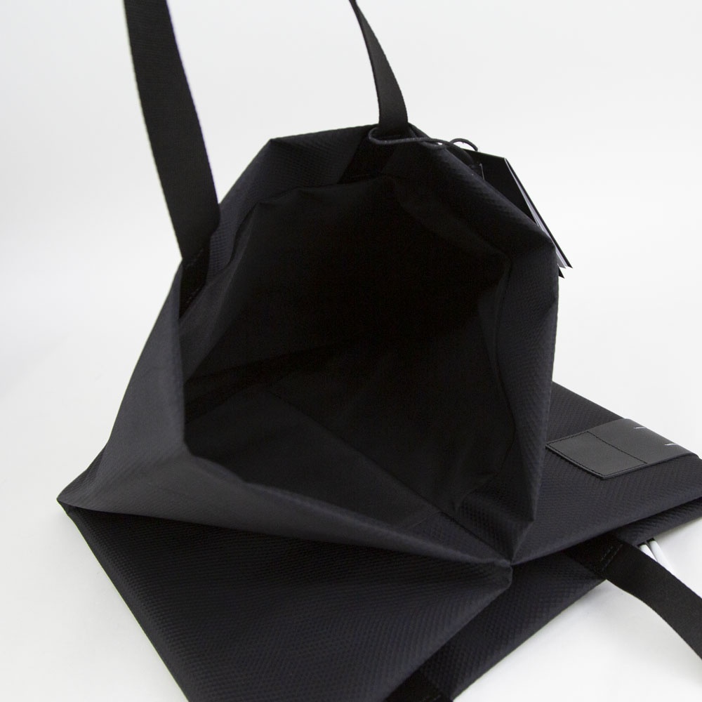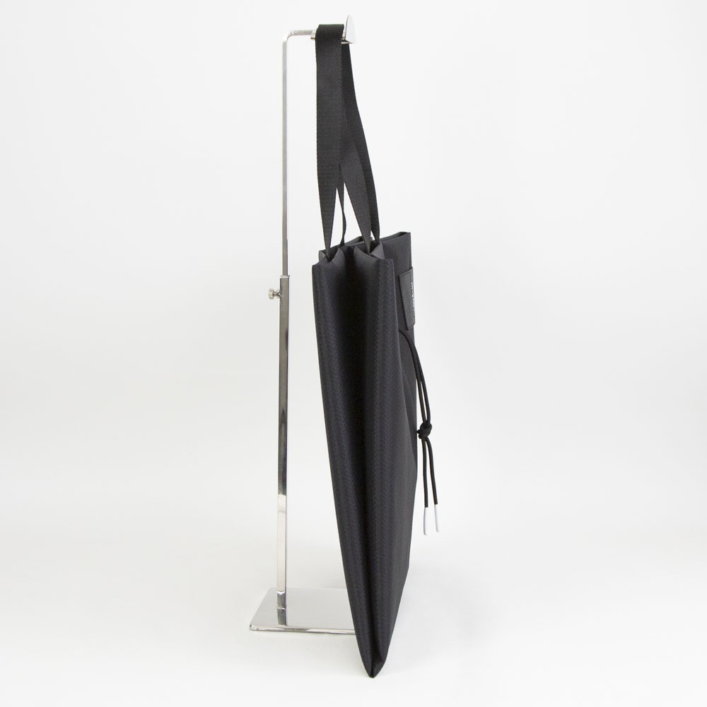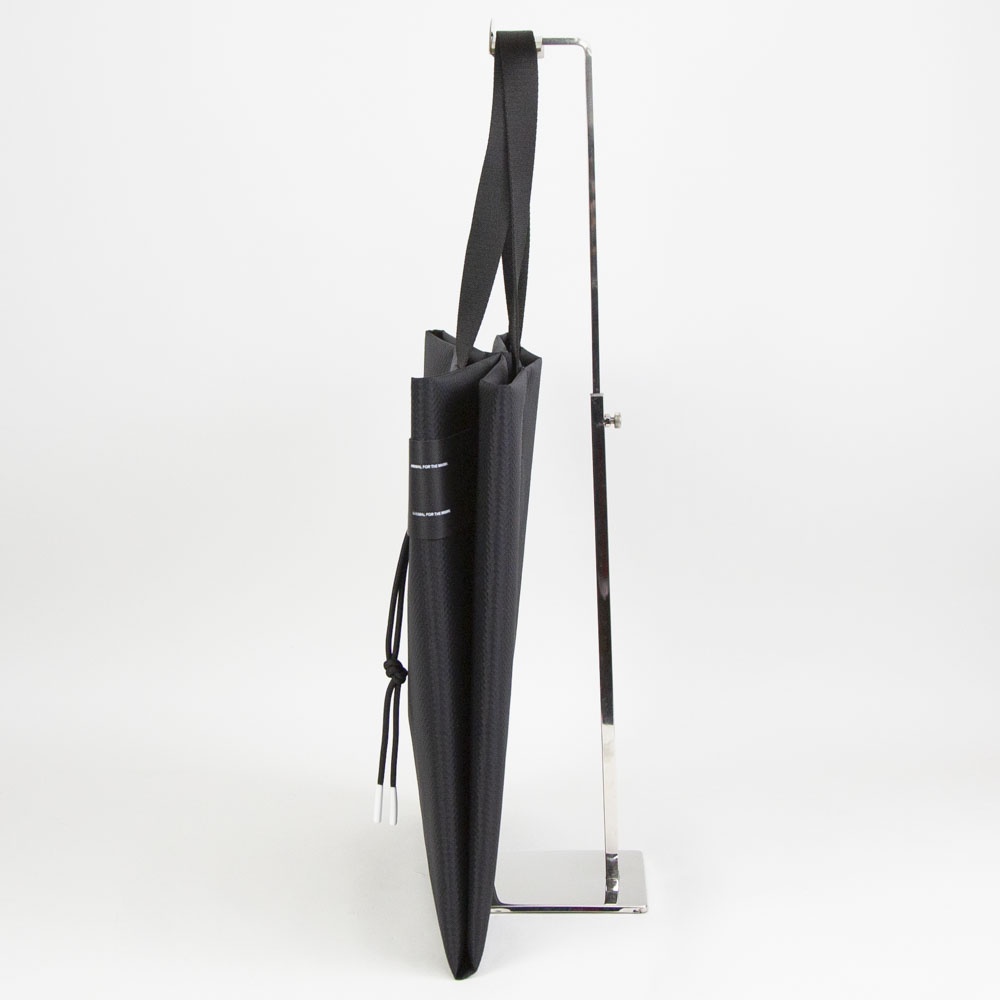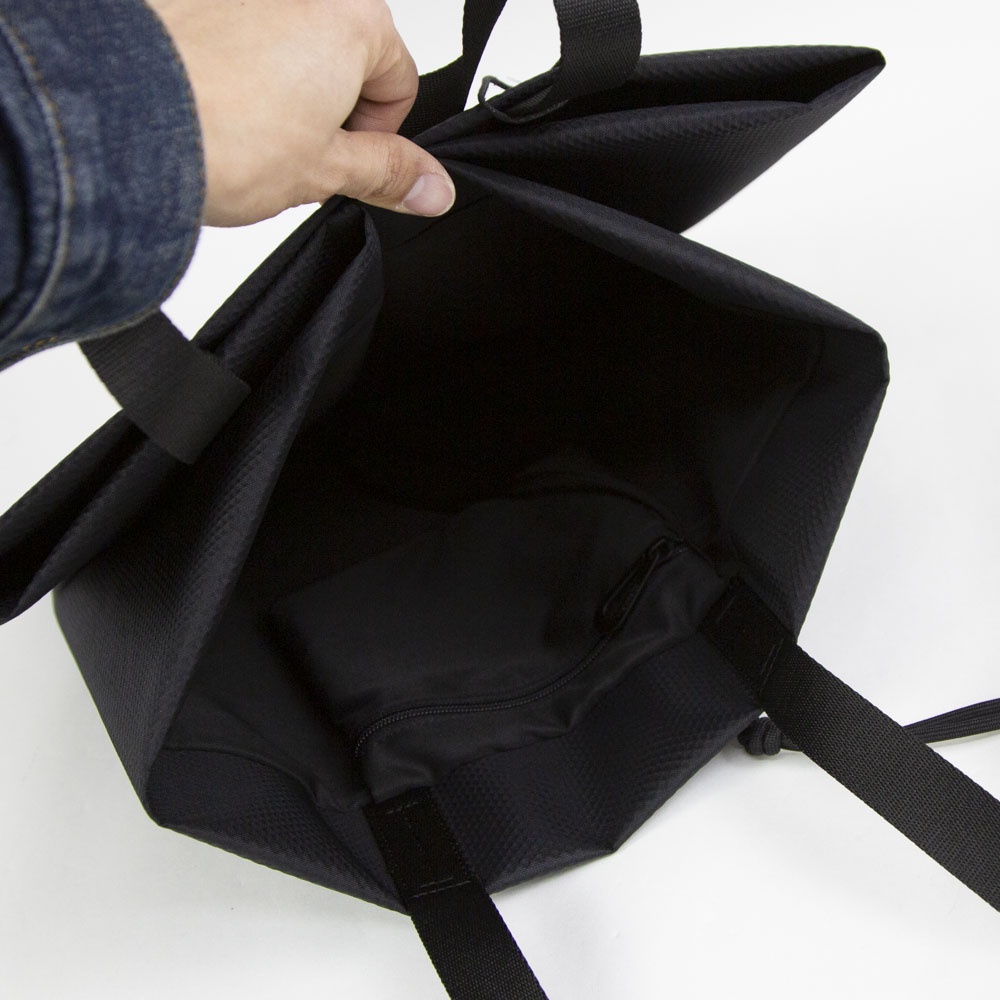 「The TODD」は、1枚の平面を折りたたむことで立体的なボリュームを生み出すという、独自のデザインプロセスから誕生した大型のトートバッグです。本モデルには、軽量でハリのある質感と撥水加工を兼ね備えた新素材「Satellite Blackナイロン」を採用しています。