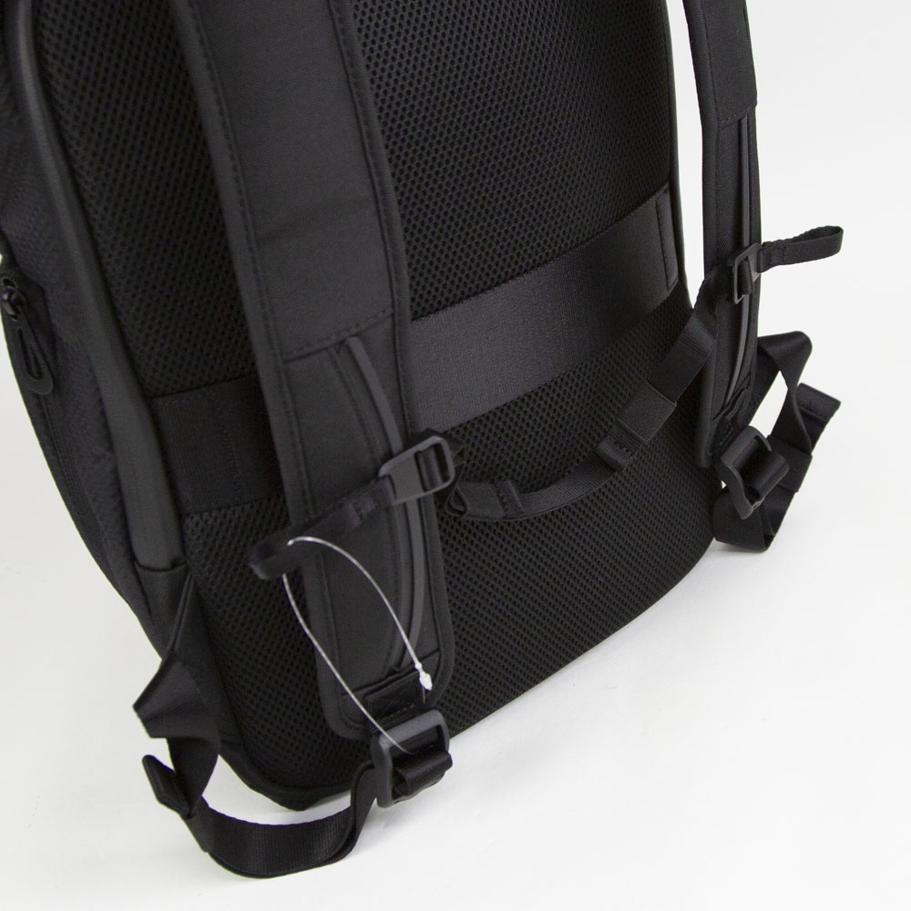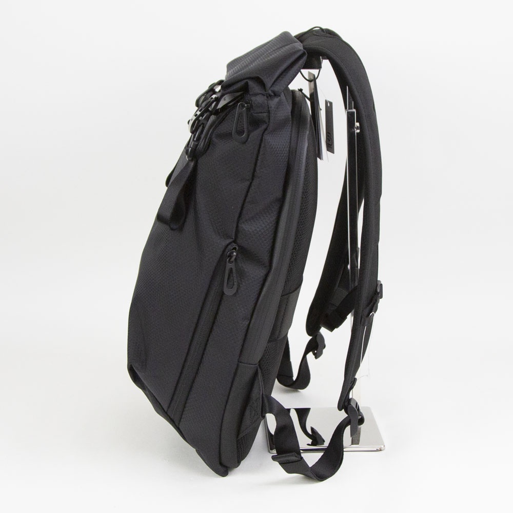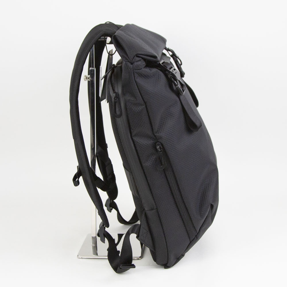「VENTA」は、独特のマットな光沢を持つ、テクニカルで質感豊かな新素材「Satellite Blackナイロン」を採用した軽量なバックパックです。前面の2本のバックルストラップを開けると広々としたコンパートメントが現れ、日々の必需品にスムーズにアクセスできます。