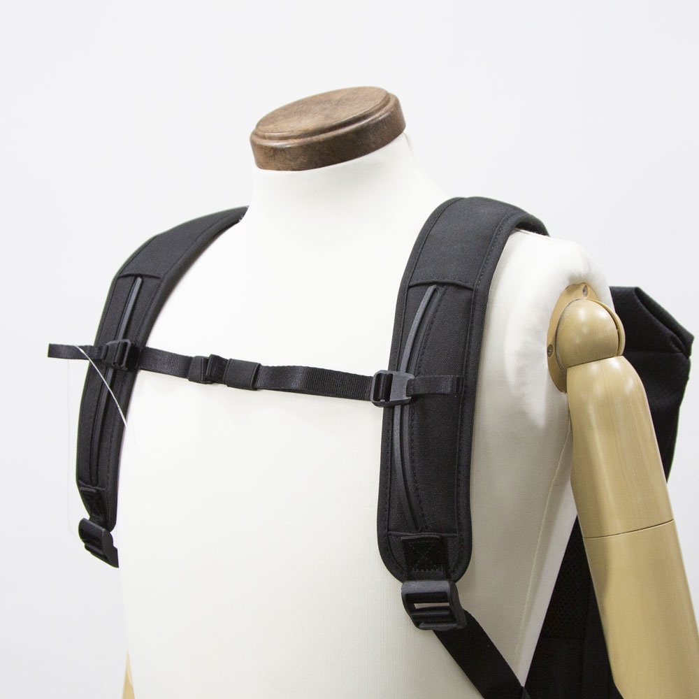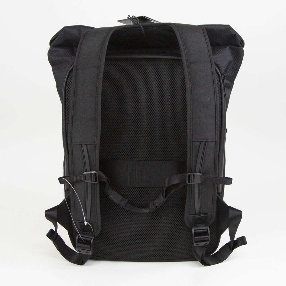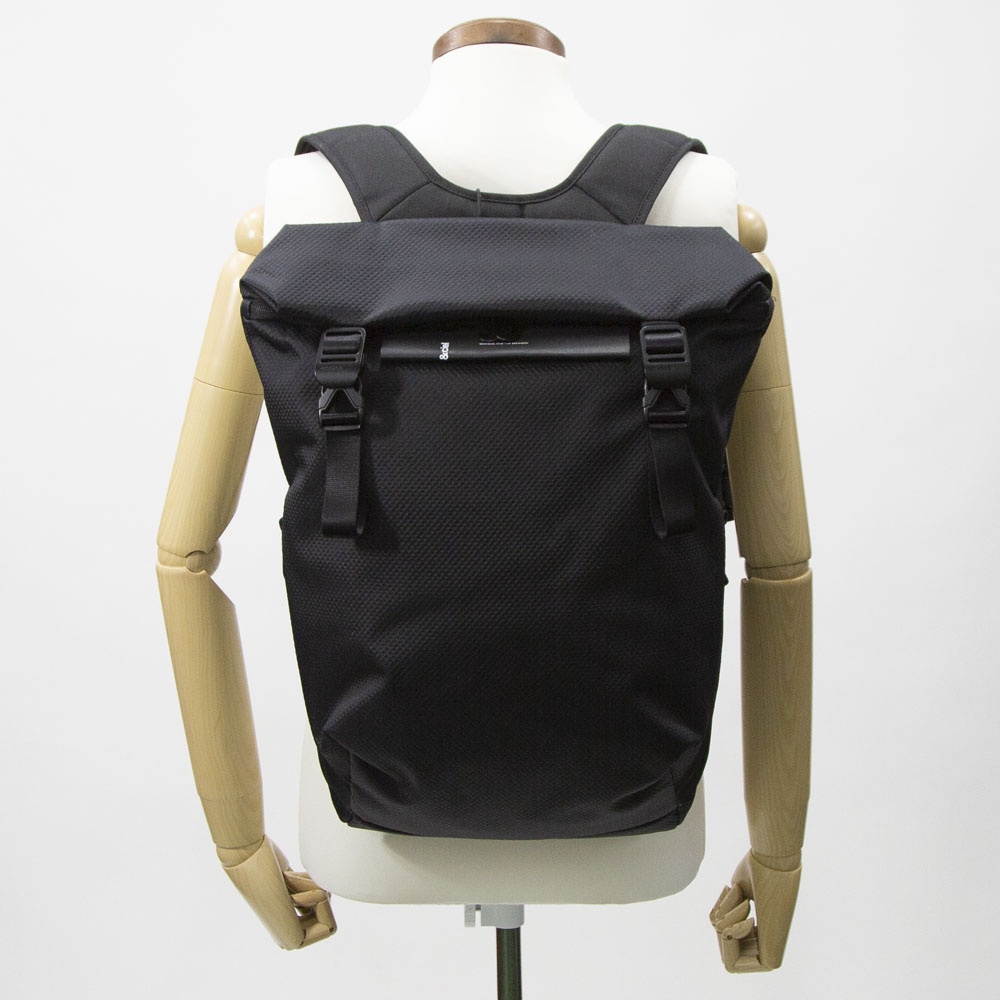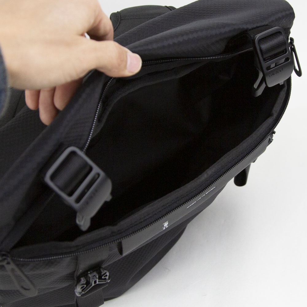 「VENTA」は、独特のマットな光沢を持つ、テクニカルで質感豊かな新素材「Satellite Blackナイロン」を採用した軽量なバックパックです。前面の2本のバックルストラップを開けると広々としたコンパートメントが現れ、日々の必需品にスムーズにアクセスできます。