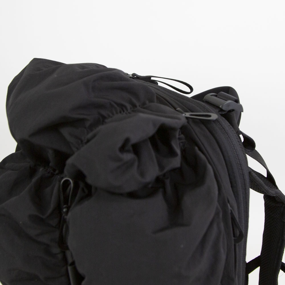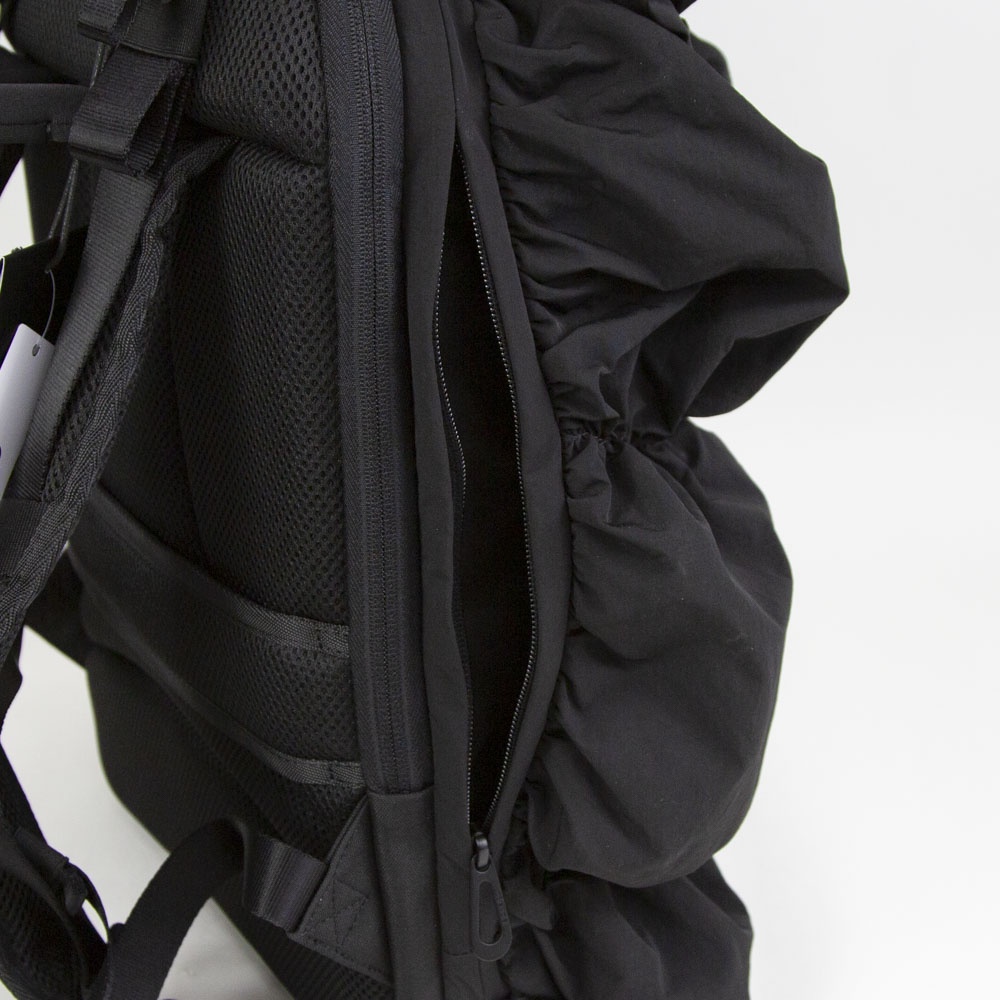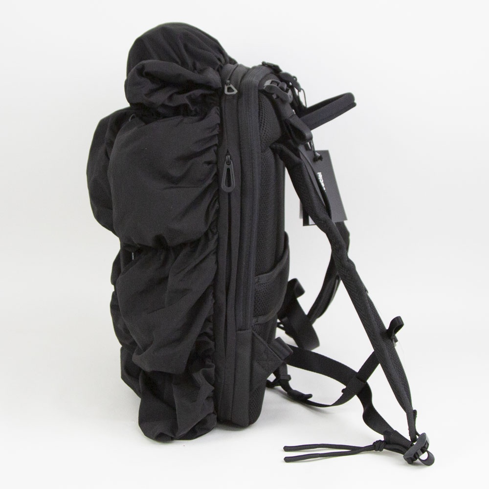 コレクションの新色・新モデルである「DRAVA Gathered Black」バックパックは、彫刻的な実用性とレイヤー状の収納構造を追求したモデルです。
