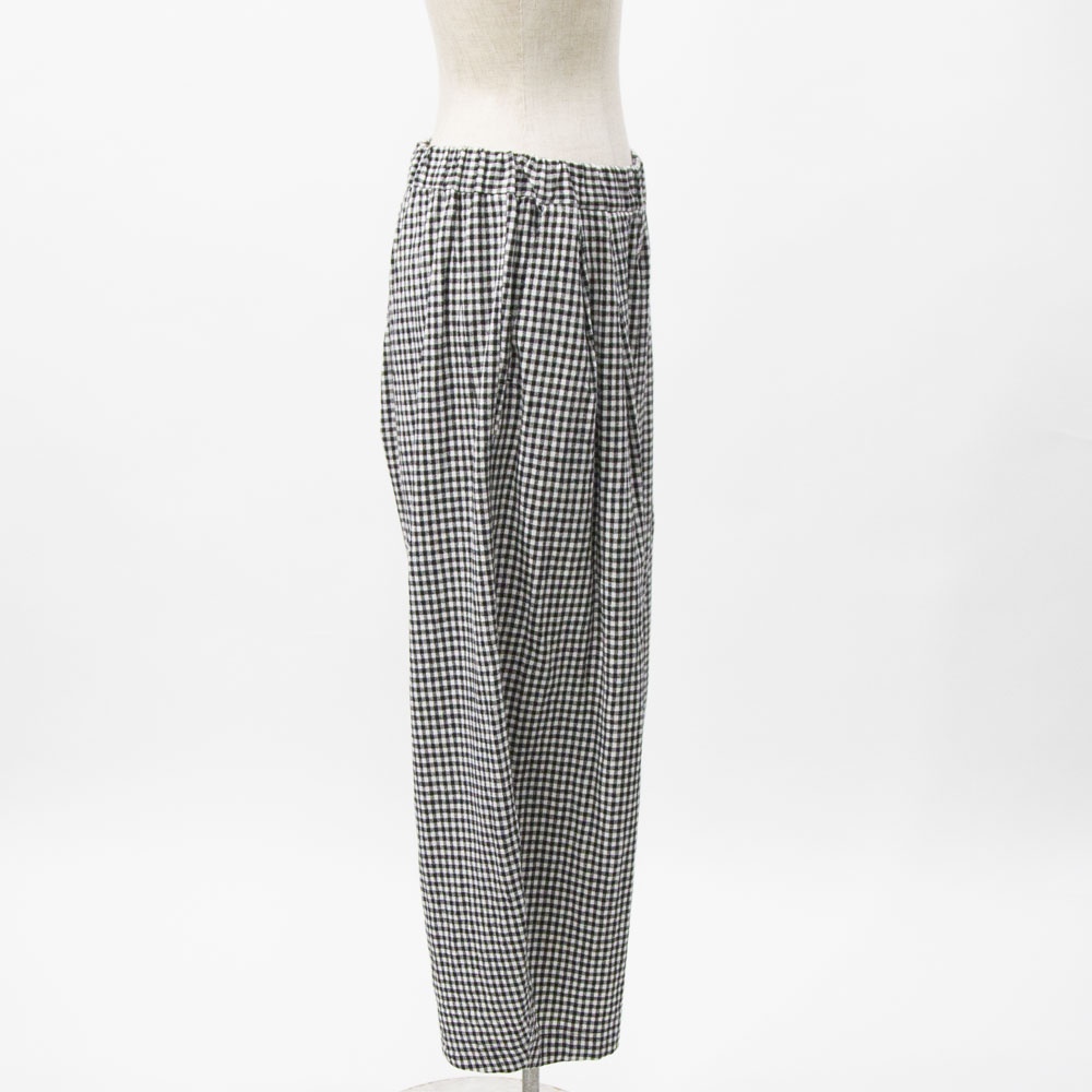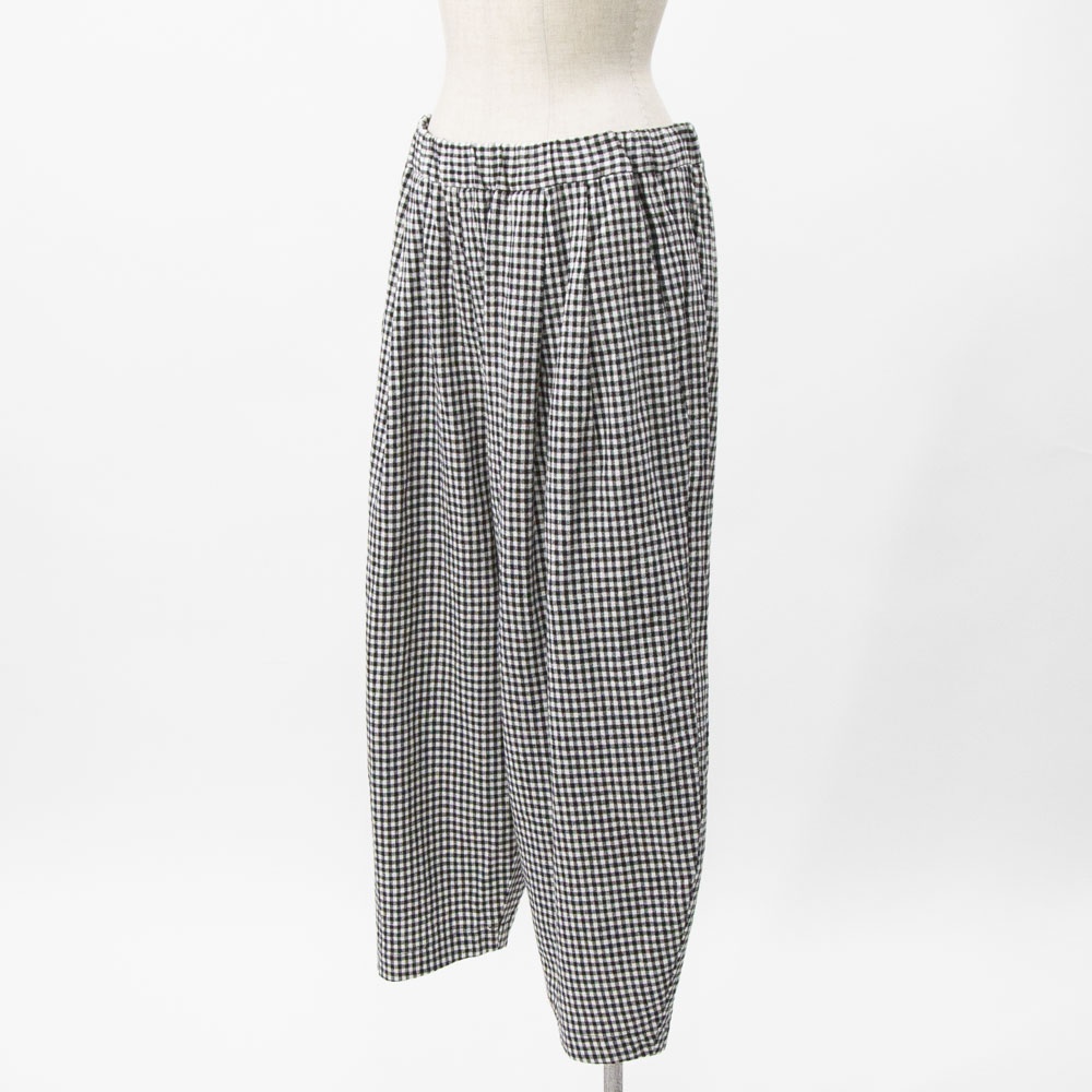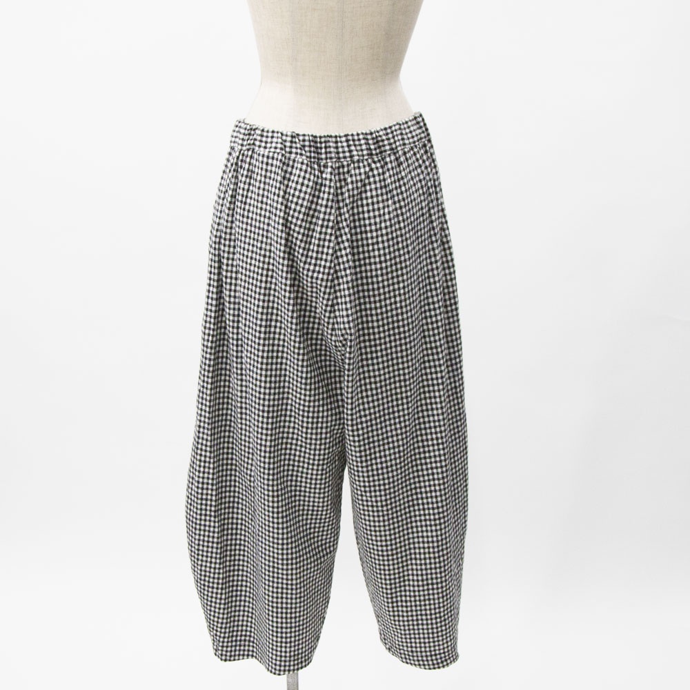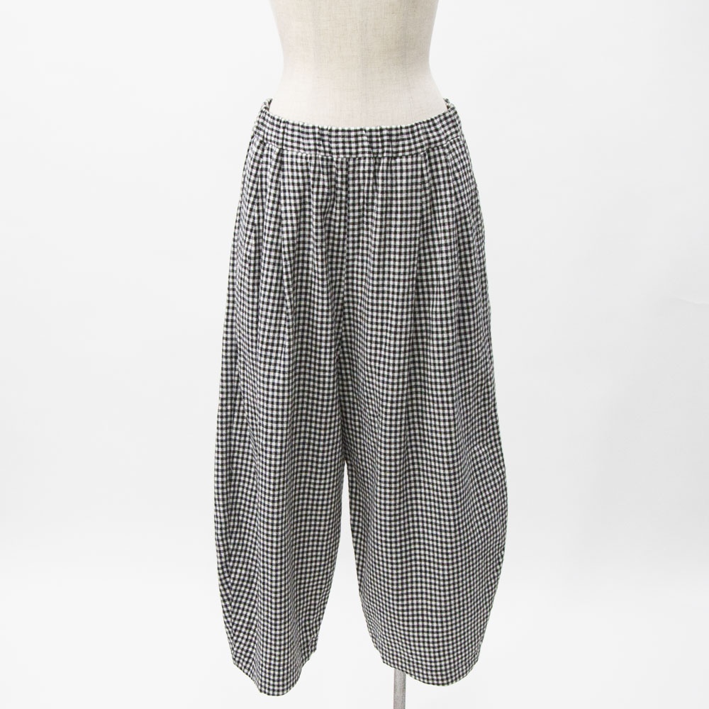 コットンリネン素材のカジュアルな風合いのパンツ。 程よいボリューム感と、丸みのあるシルエットが特徴です。 ウエストゴム仕様です。 左右脇にポケットがあります。 ウエスト左内側にゴム入替口があります。