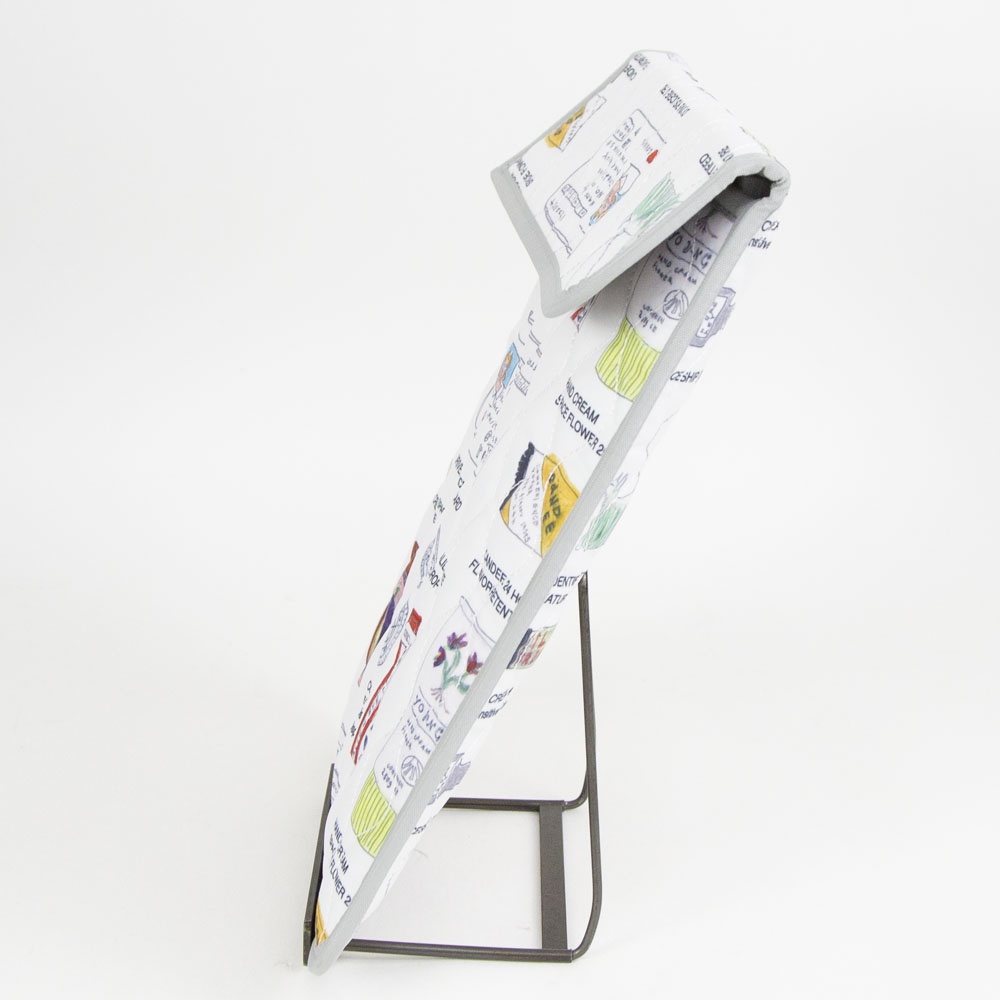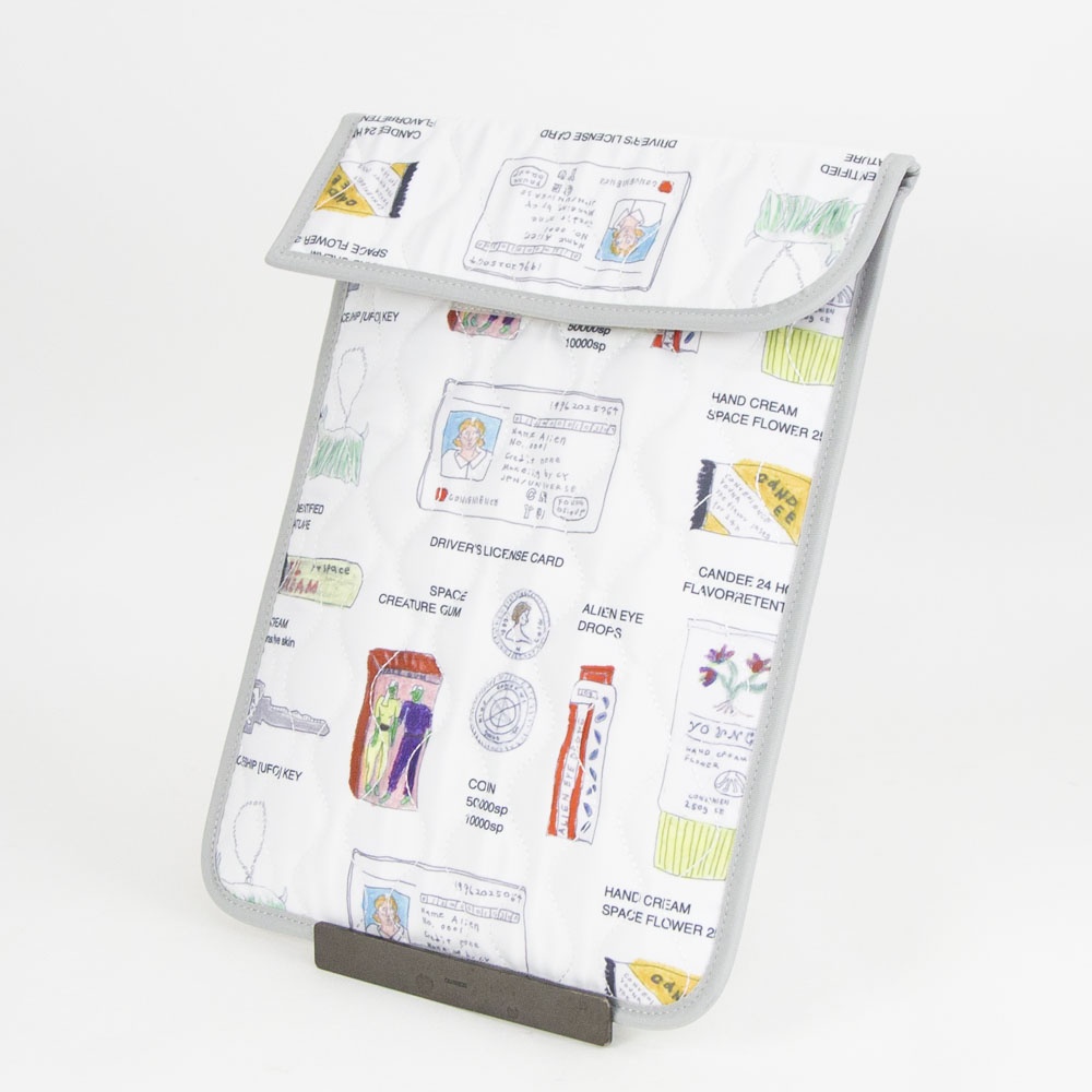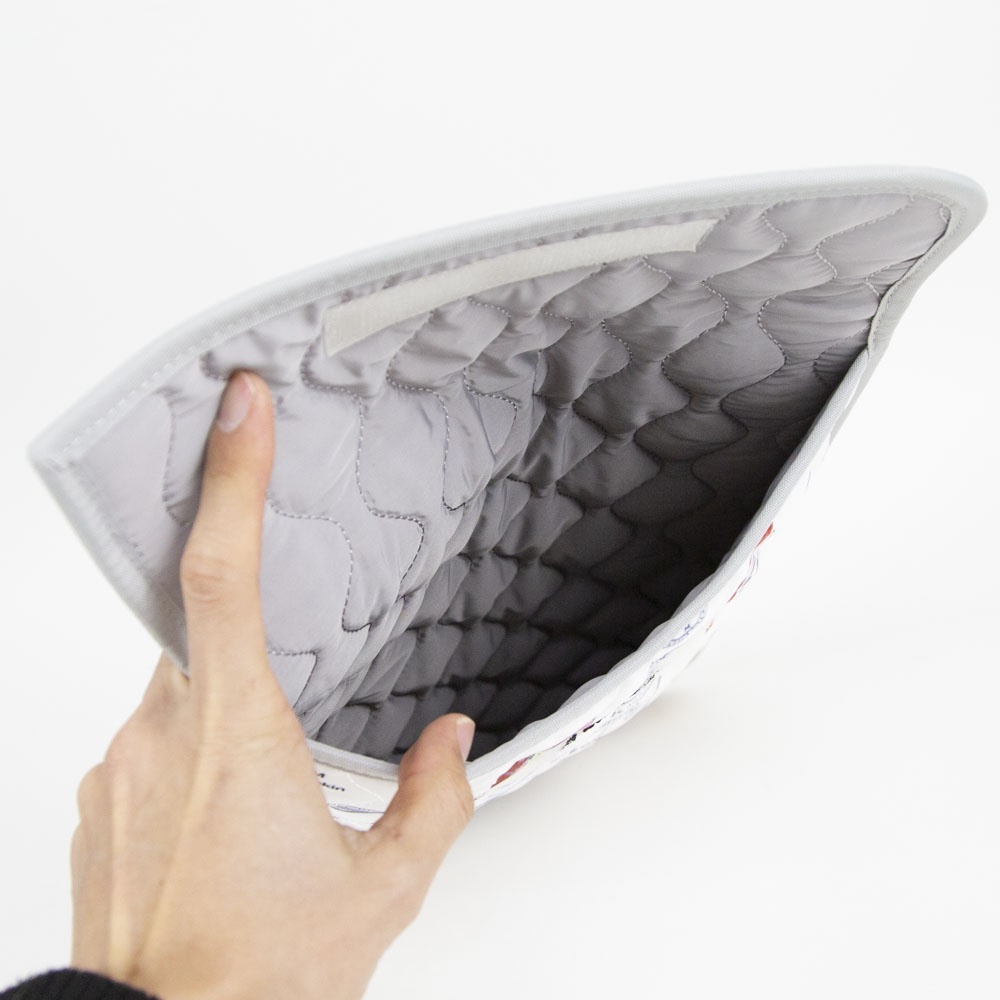 ふっくらとした中綿入りのキルティング生地が、タブレットやデバイスをやさしく保護。落ち着いたグレーのパイピングが全体を引き締め、アート性と機能性を兼ね備えたデザインに仕上げました。