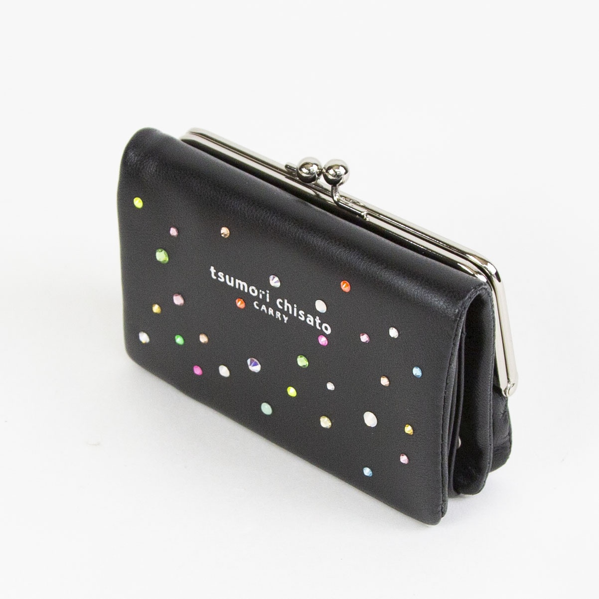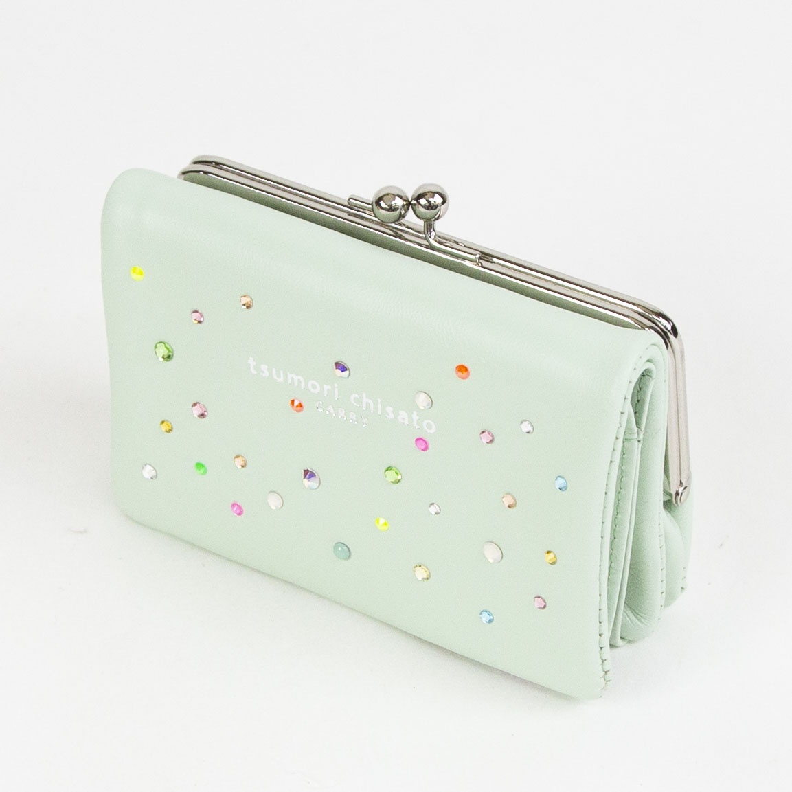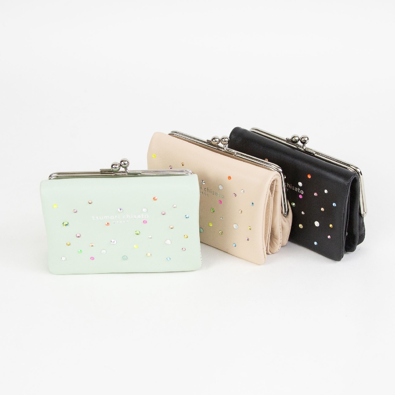 小さなキャンディーのようなキラキラの石が輝く可愛らしいお財布です。 華やかだけど、どこか控えめなところが素敵。石のパーツはひとつひとつ手作業で付けられています。 素材はソフトなラムレザーを使用しています。