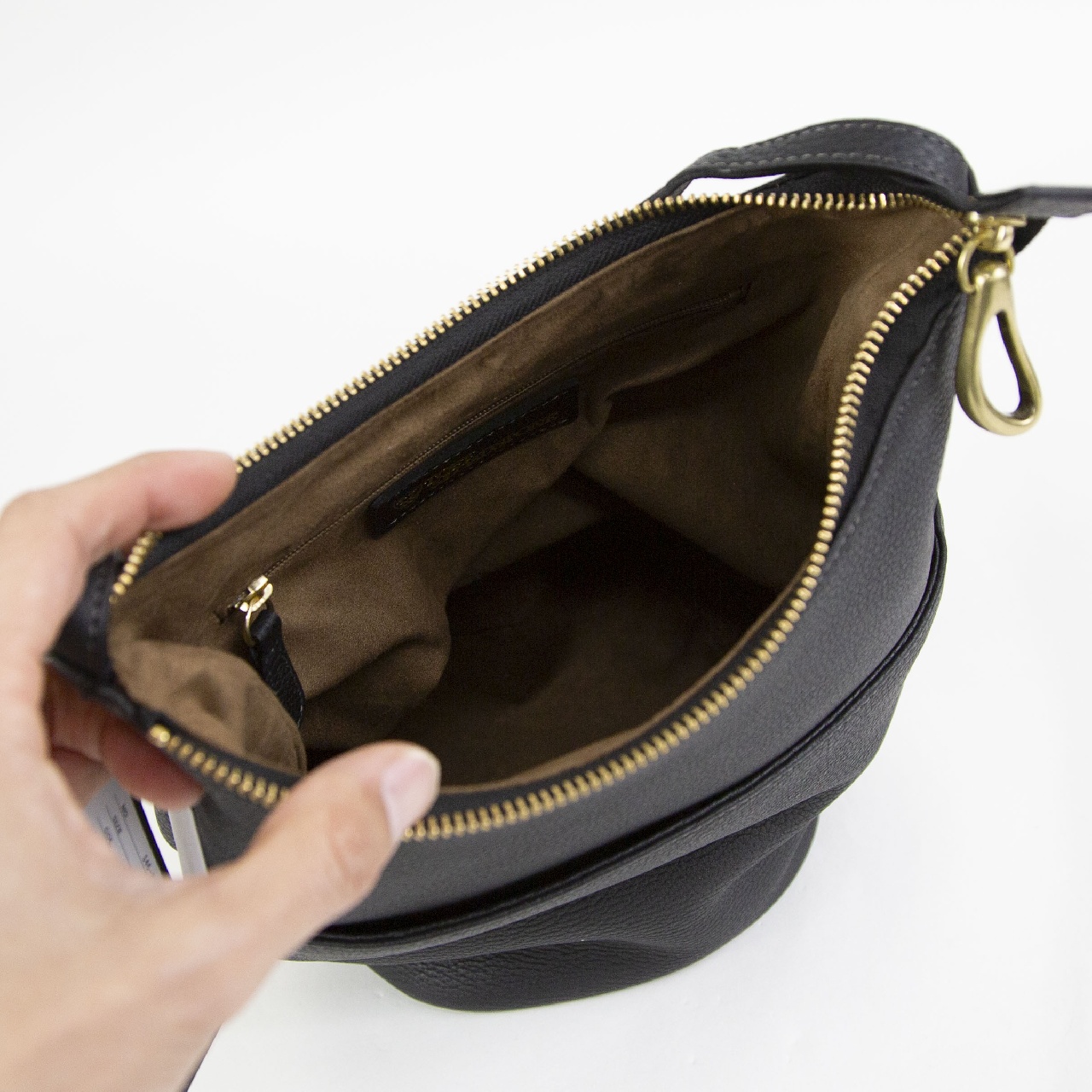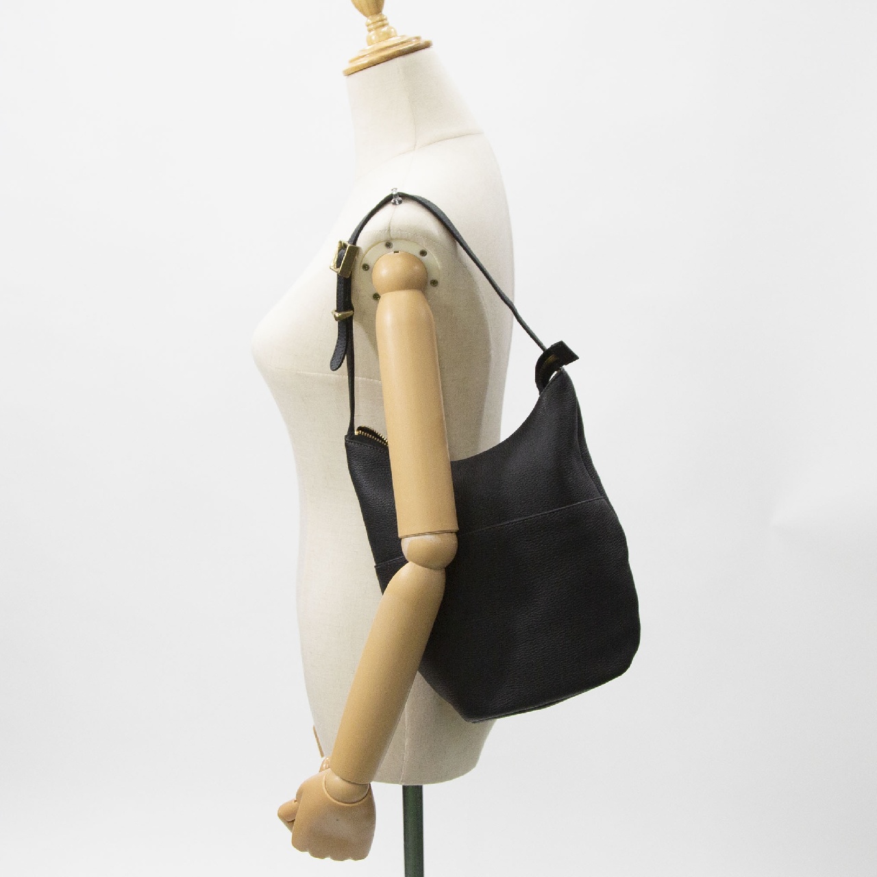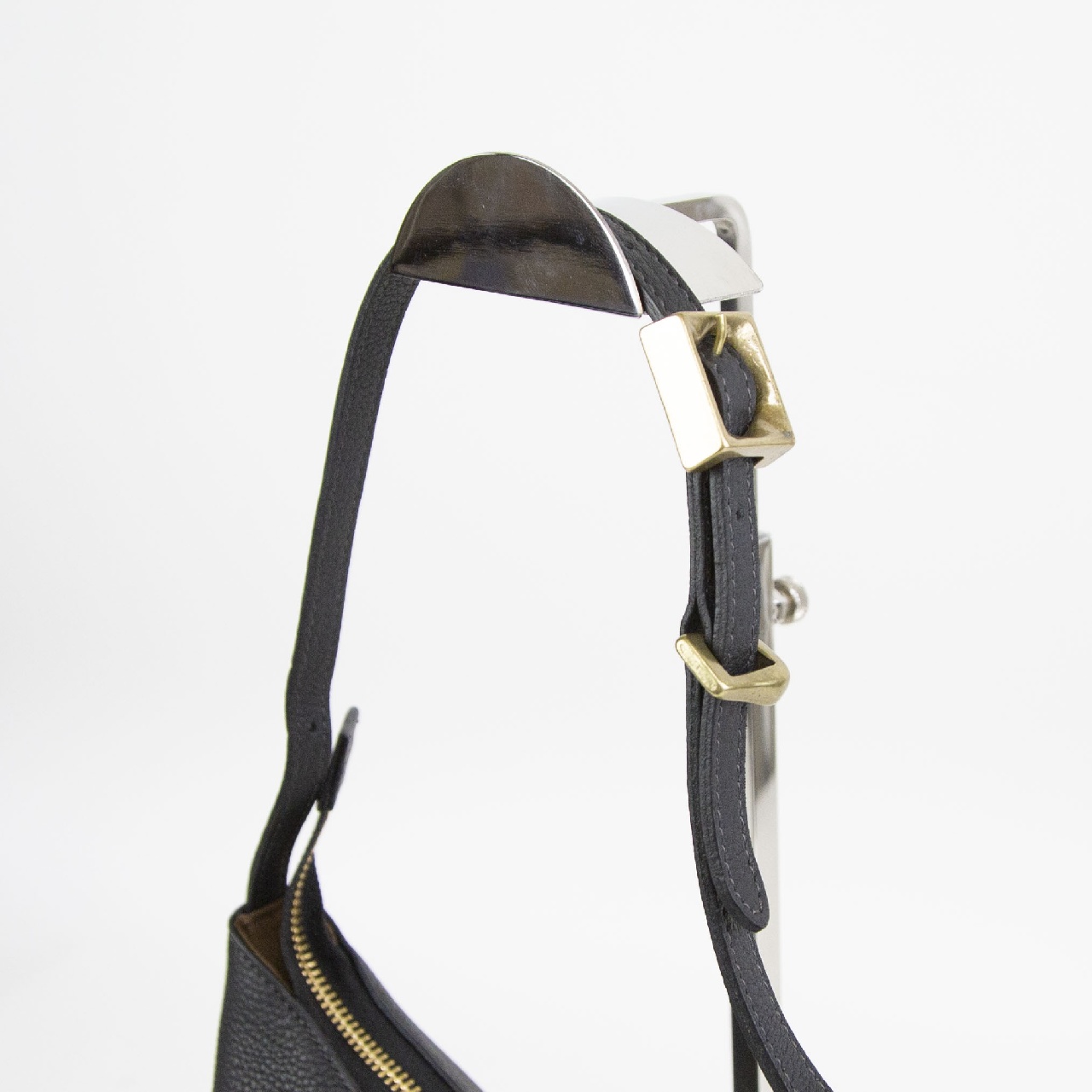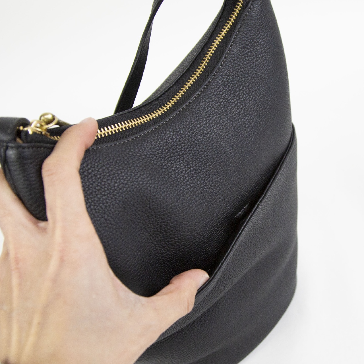 調整可能なハンドルは、肩に楽に掛けられる長さから、フォルムを変えると柔らかな素材を活かした三日月型のハンドバッグに。