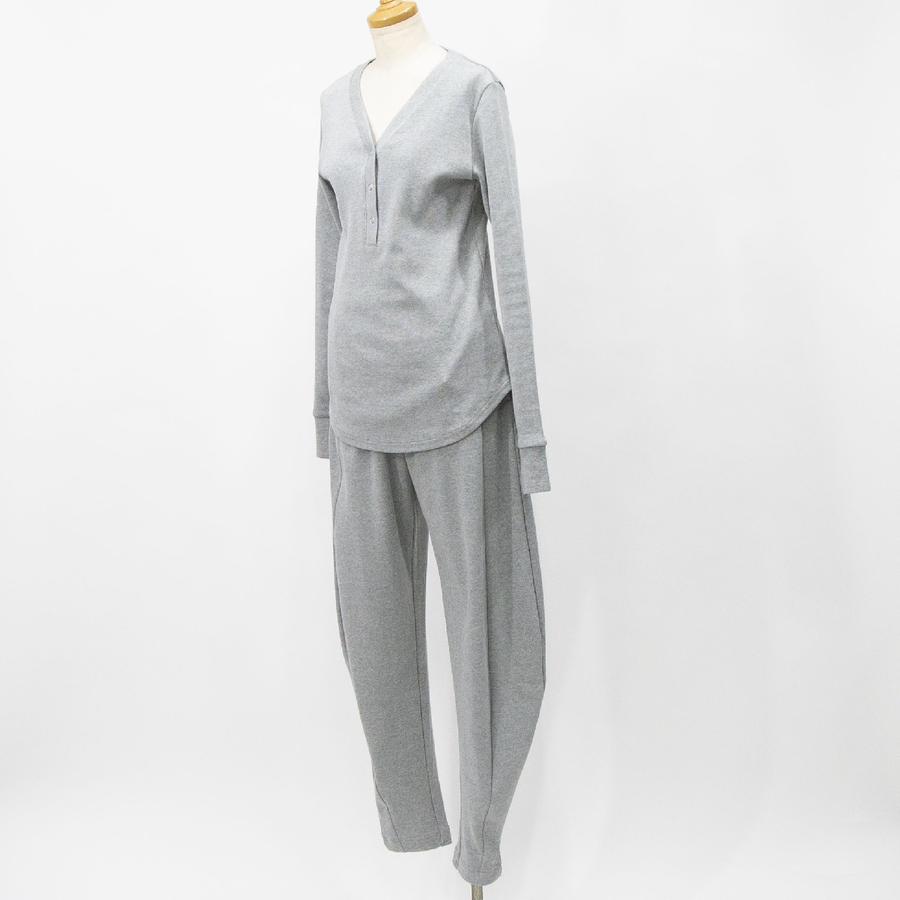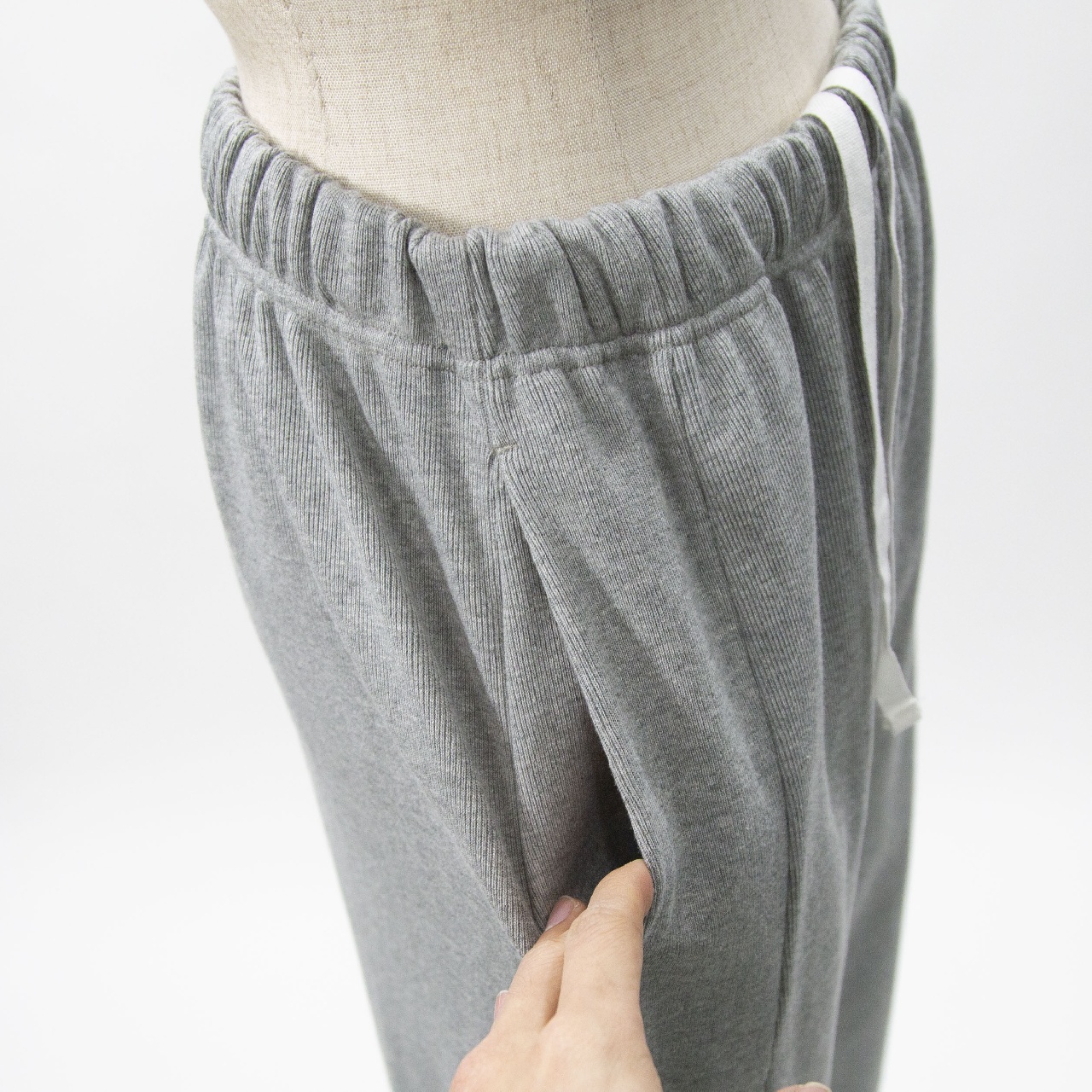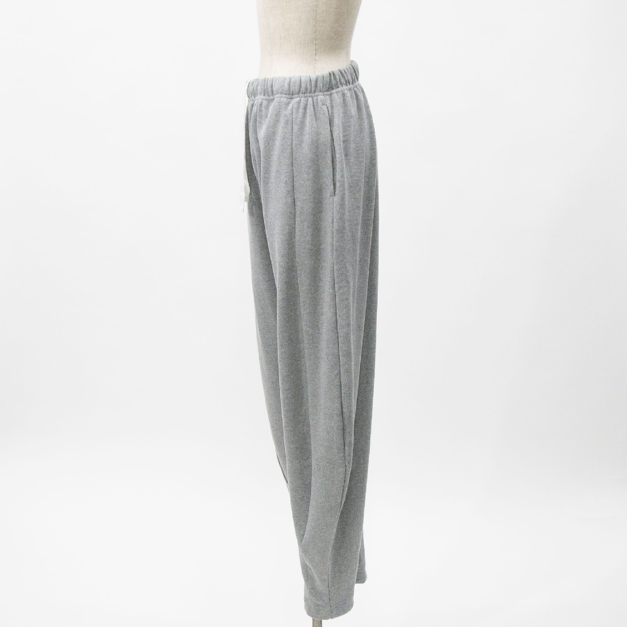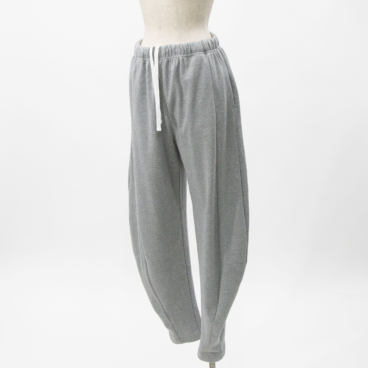 MIDIUMISOLIDのNEWベーシックシリーズ太番手のニットライクなフライス生地のリブイージーコクーンパンツです。MIDIUMISOLID定番のコクーンパンツより腰回りがやや細身なのでより上品です。カジュアルな素材なのに大人な女性がカッコ良く着用いただけるパンツになっています。裾が細くなっており、裾で溜まるので小柄な方にも着用していただきやすい1枚です。