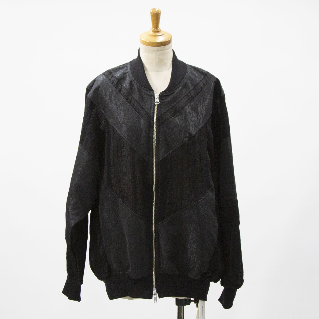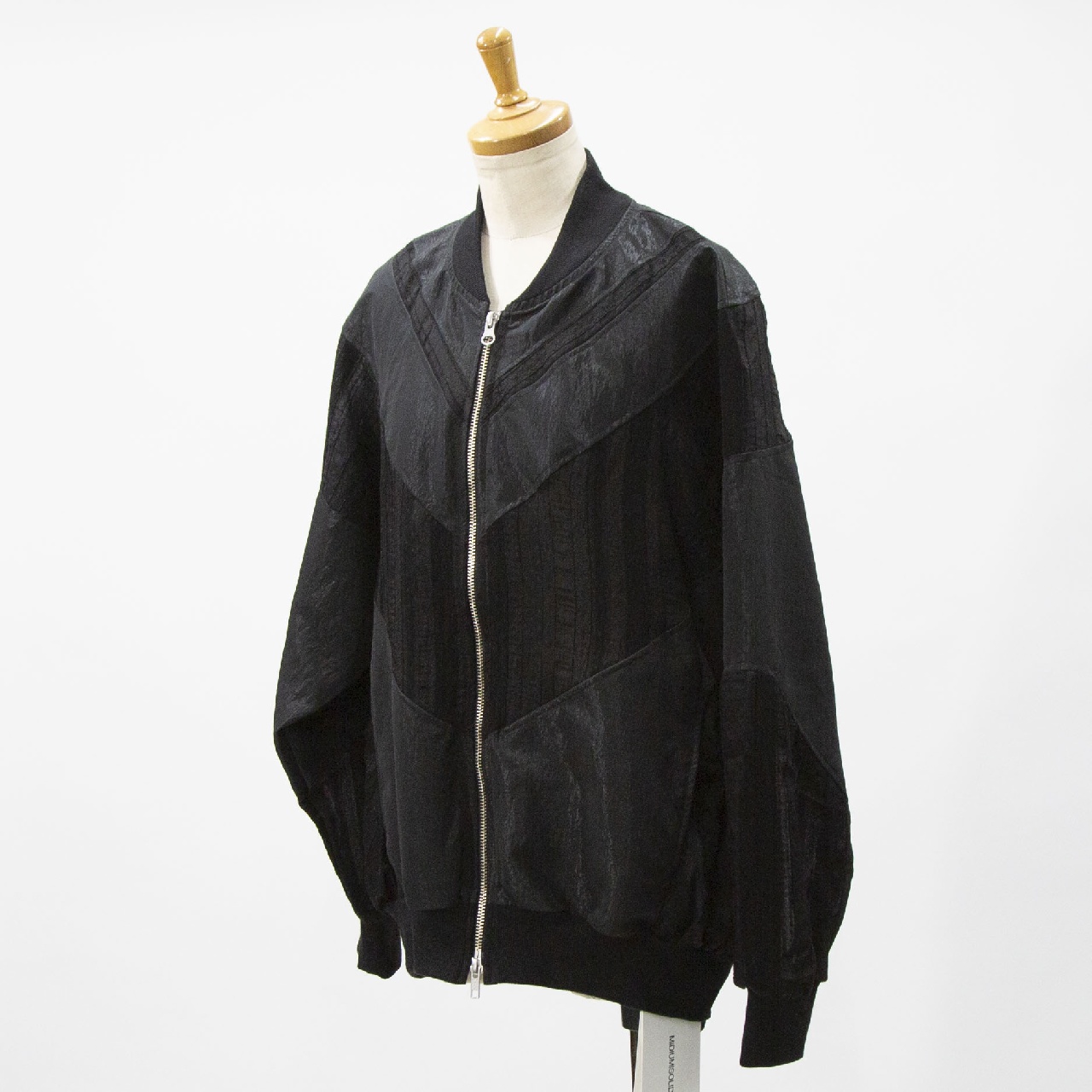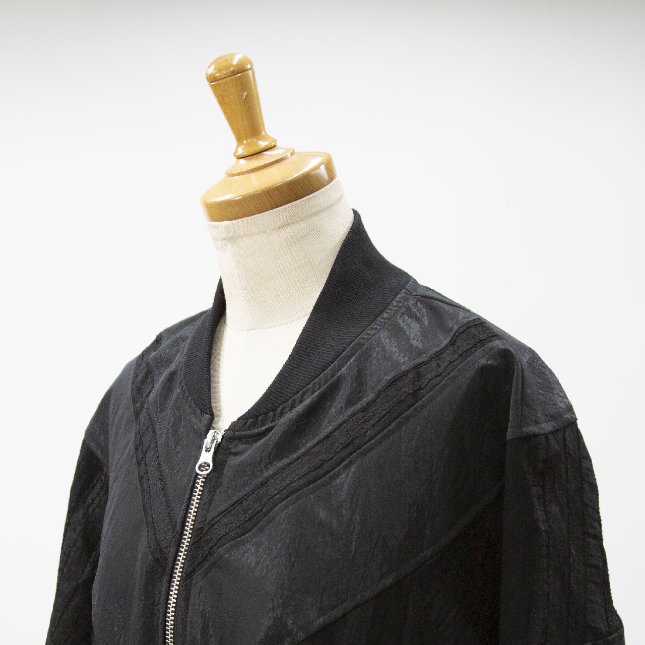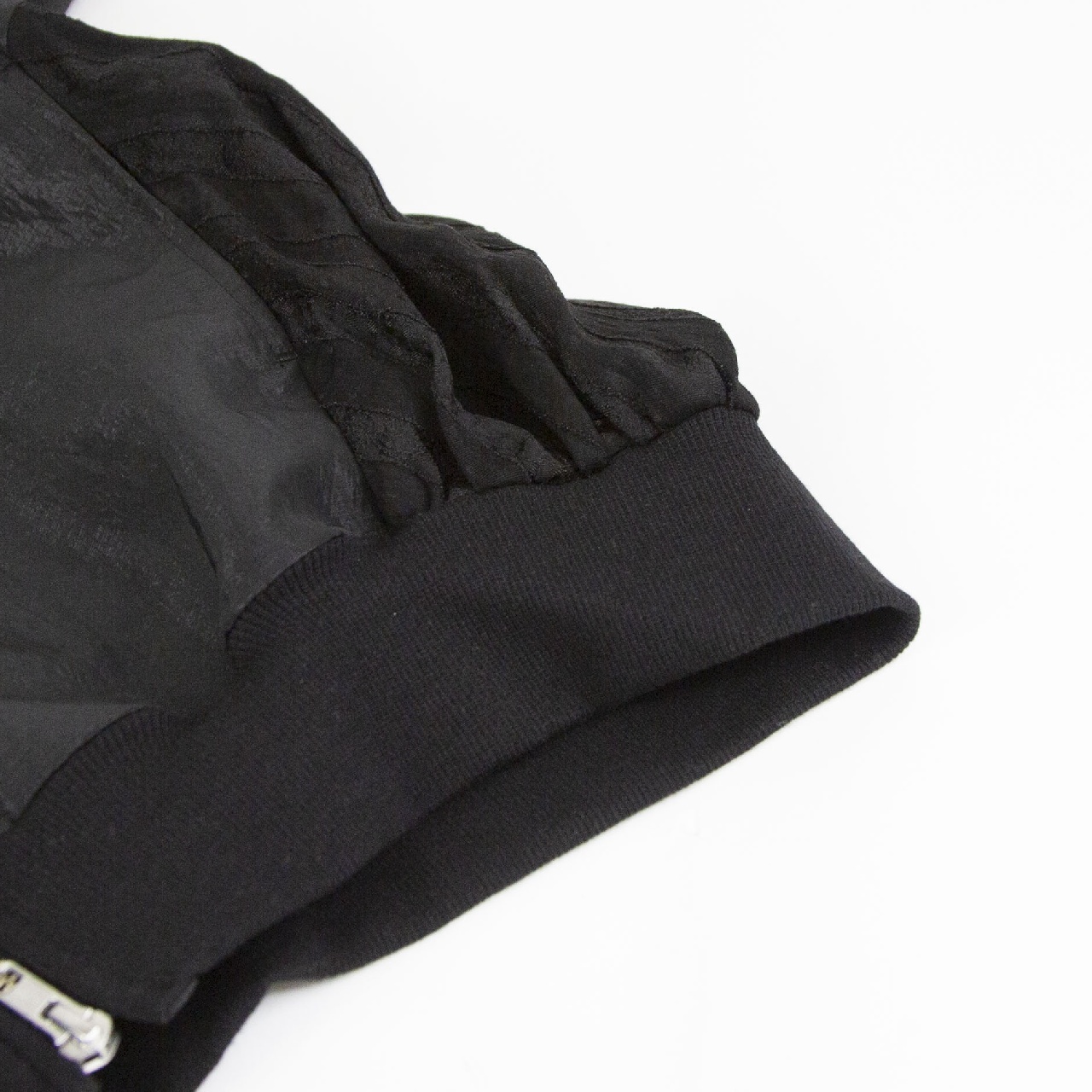 艶のあるタフタ素材+甘いシアーレースを組み合わせたデザインのブルゾン。最大のポイントはたっぷりとボリューム感のあるバックスタイルです。自然なふんわりとした動きのあるシルエットでダブルジップ仕様。 季節の変わり目のちょっとした羽織りアイテムとしてオススメの1枚です。